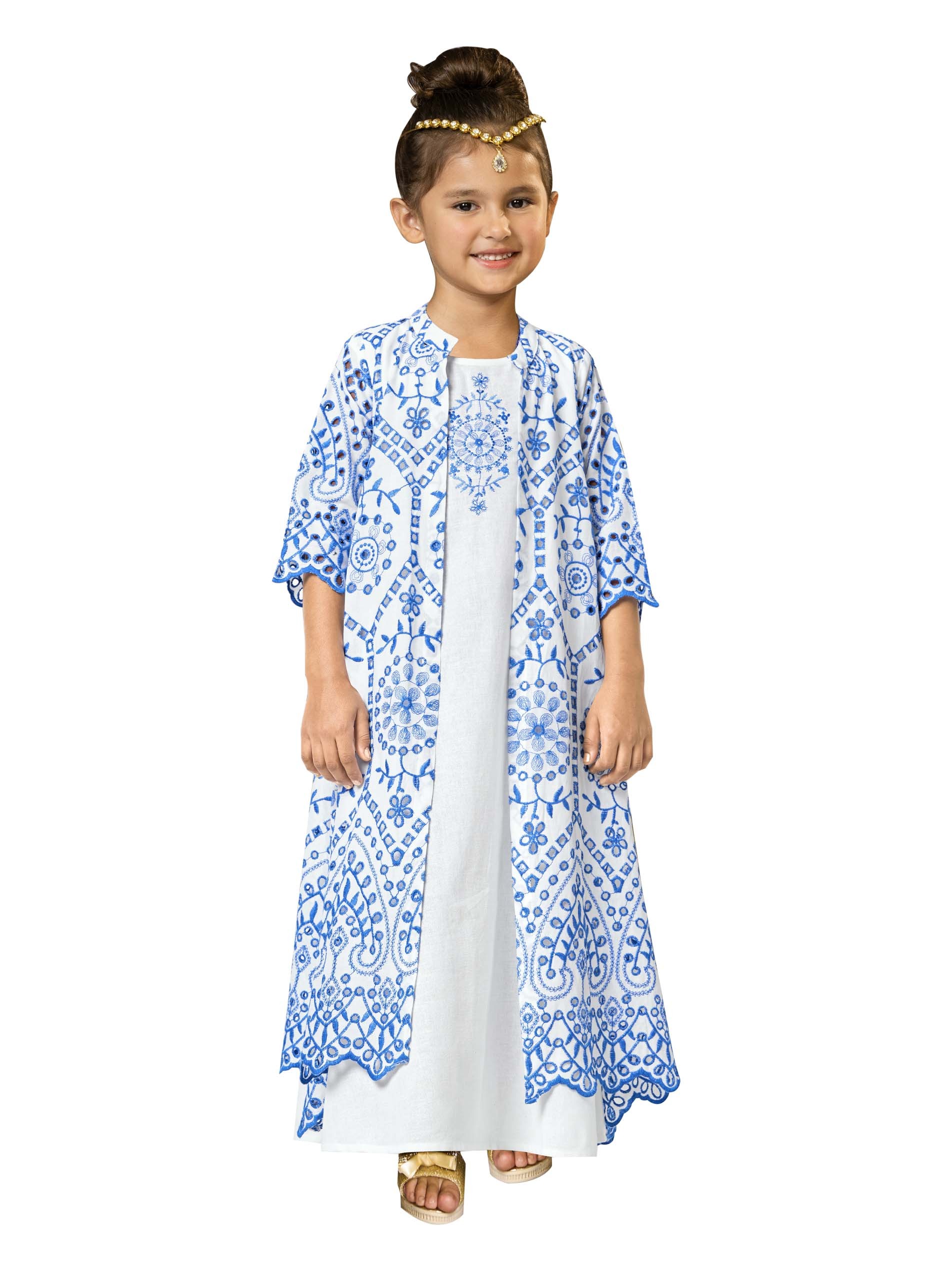 تتميز هذه الجلابية ذات التصميم الجاكت للأطفال بزي سادة باللون الأبيض مزخرف بتطريز شيفلي باللون الأزرق، يعرض أشكال زهرية مرحة وأنماط هندسية. يوفر الجاكت المفتوح مع القاعدة القطنية البسيطة راحة وسهولة في التنسق مع ملابس الصيف. مثالية لاحتفالات رمضان، يجمع هذا التصميم بين الأناقة والعملية لطفلك.