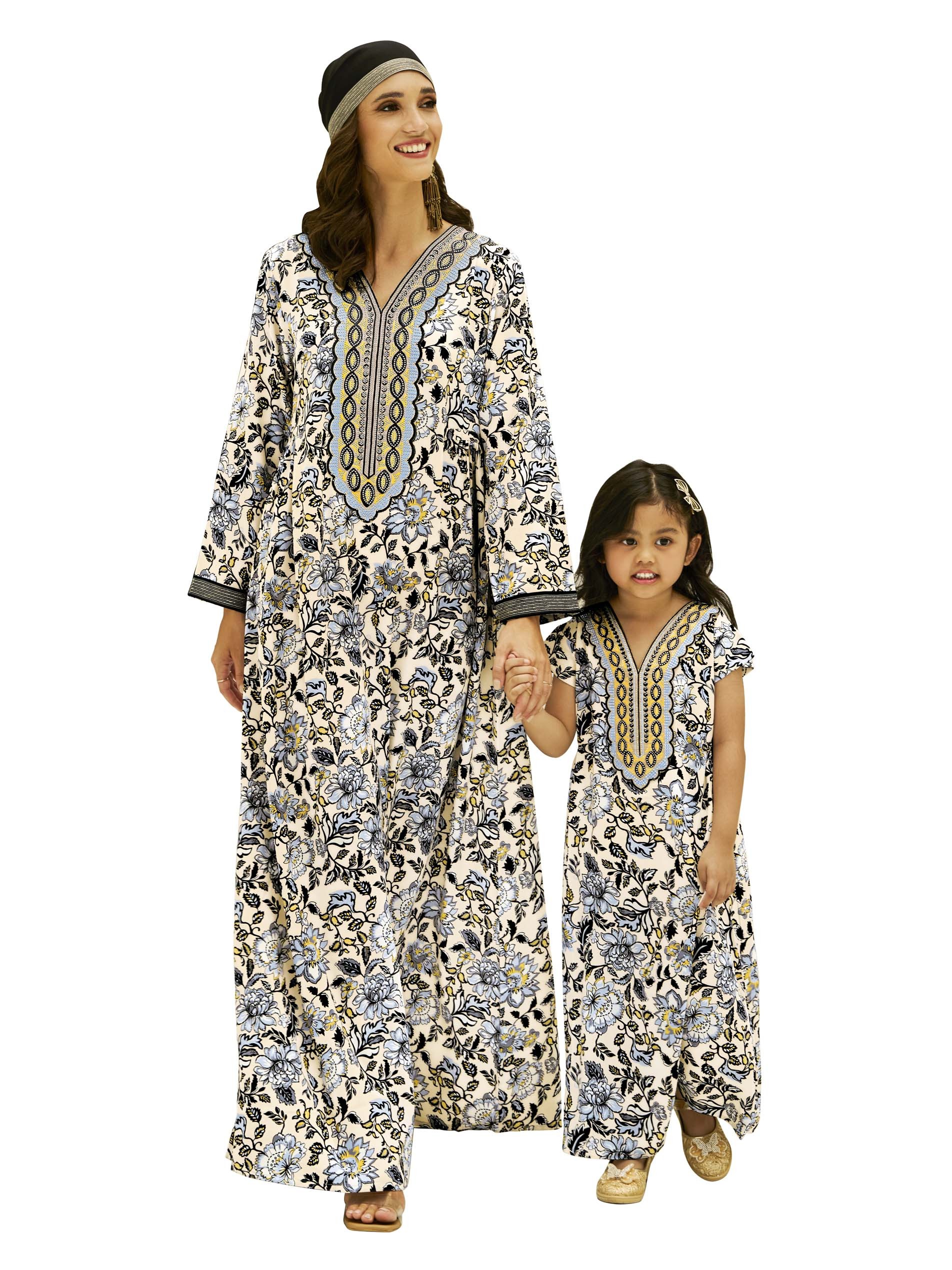 تتميز هذه الجلابية ذات القَصّة المُتَوَسِّعة للأطفال، المصنوعة من القطن القابل للتنفس، بنقوش زهرية ساحرة بألوان البيج، الأصفر، الأسود، والأزرق الفاتح، مما يبعث على الإحساس بالطبيعة. يضيف جمع الخصر والعمل الدقيق بالتطريز لمسة من الأناقة، بينما يضمن التصميم المريح سهولة الحركة أثناء اللعب في الصيف. مثالية للخروجات غير الرسمية، فهي خيار رائع لموسم الصيف المبهج.