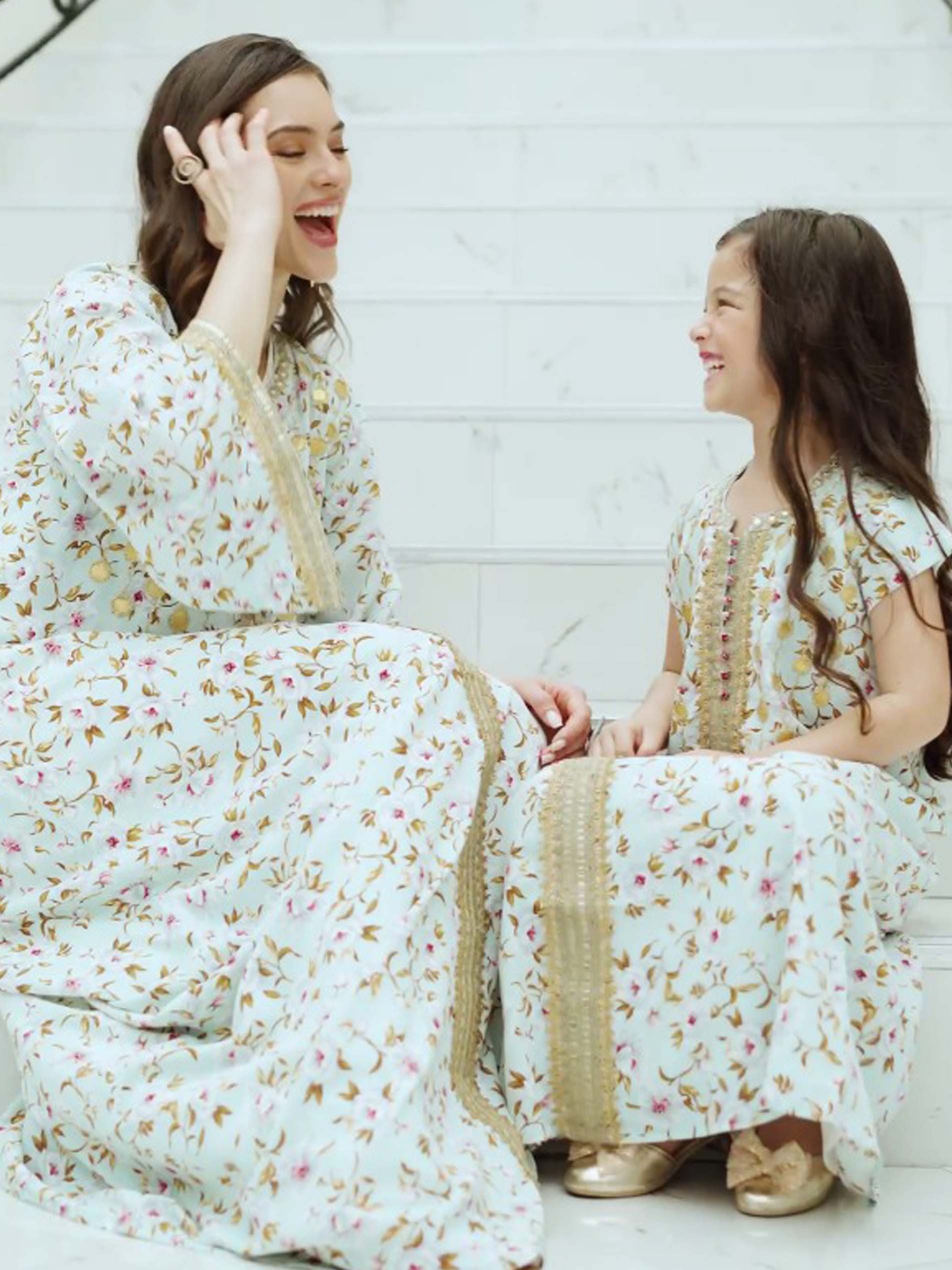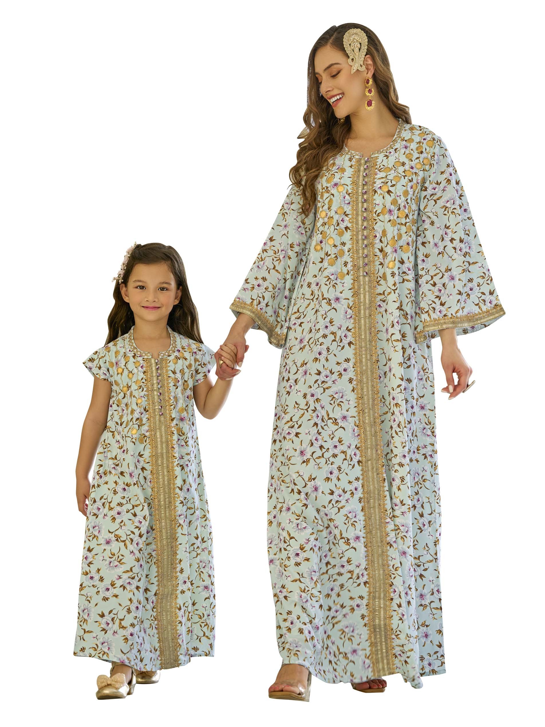 تتميز هذه الجلابية الأنيقة للأطفال بقصّة متوسعة مصنوعة من قماش ثنائي اللون قابل للتنفس، مع طبعة زهور جميلة وقصّة متوسعة. يضيف التطريز المعقد والتفاصيل الذهبية لمسة من الأناقة، مما يجعلها مثالية لحفلات الصيف. مصممة للراحة والأناقة، توفر هذه الفستان سهولة الحركة، مما يمنح مظهراً ساحراً للمناسبات الخاصة.