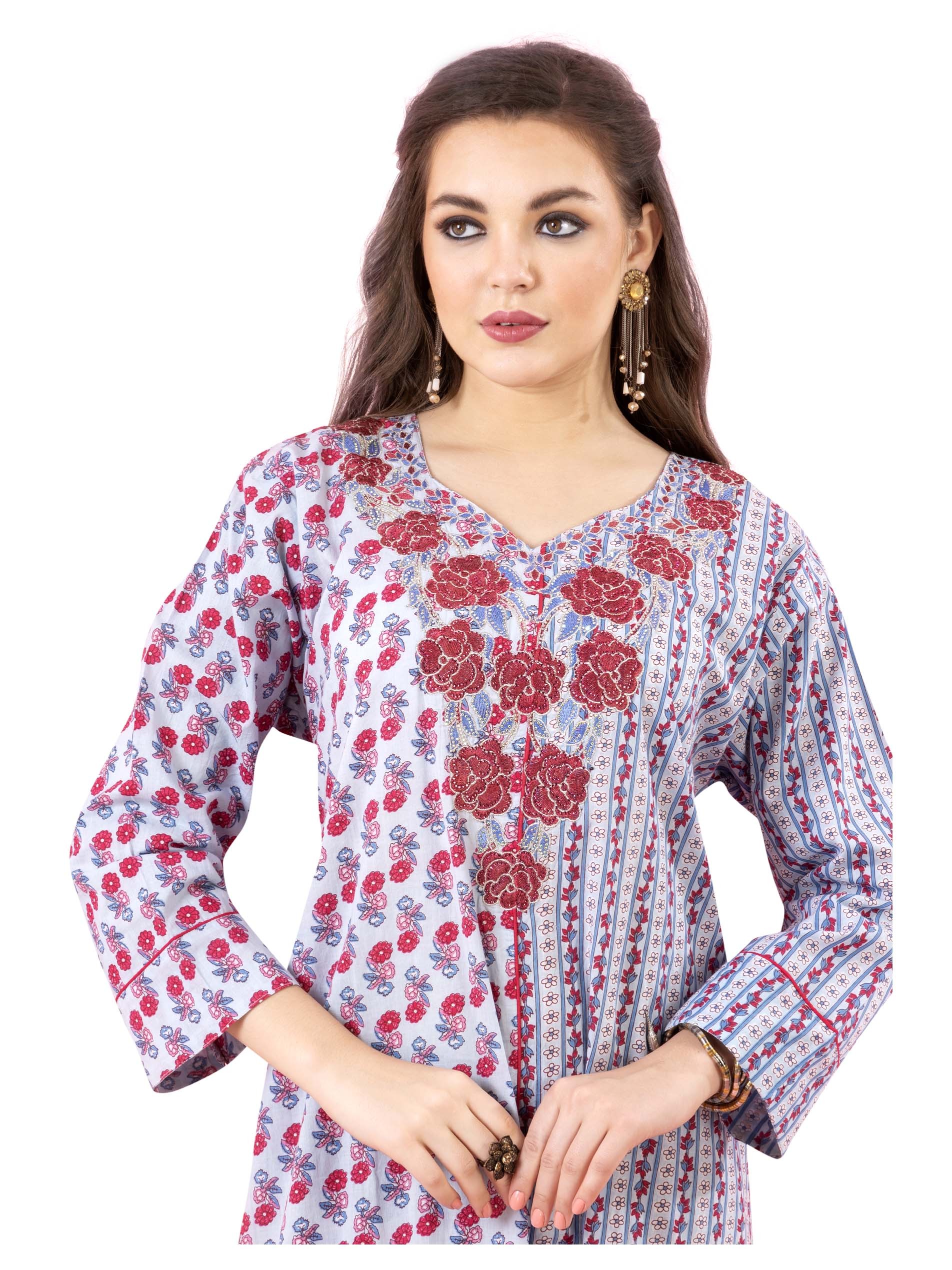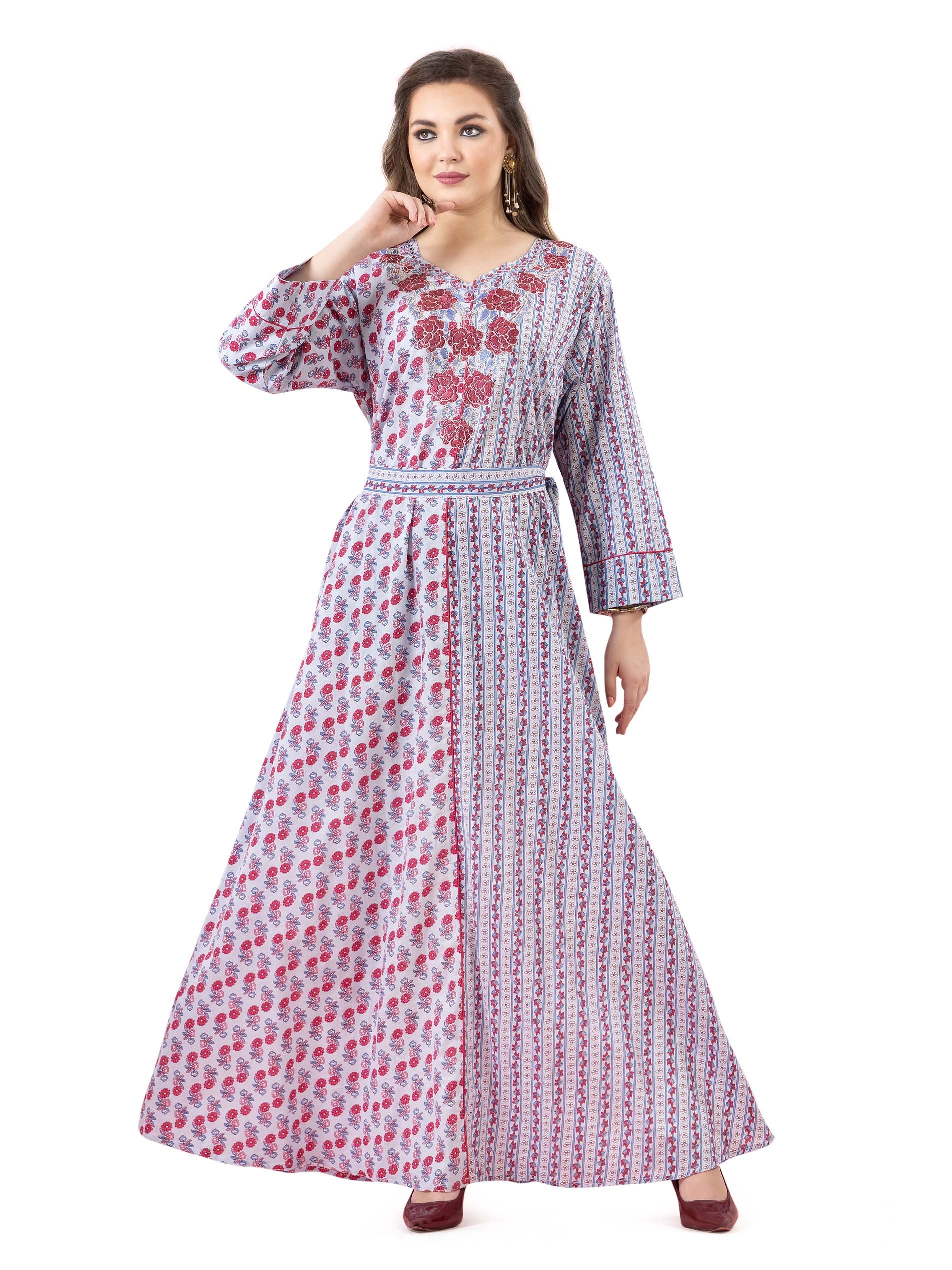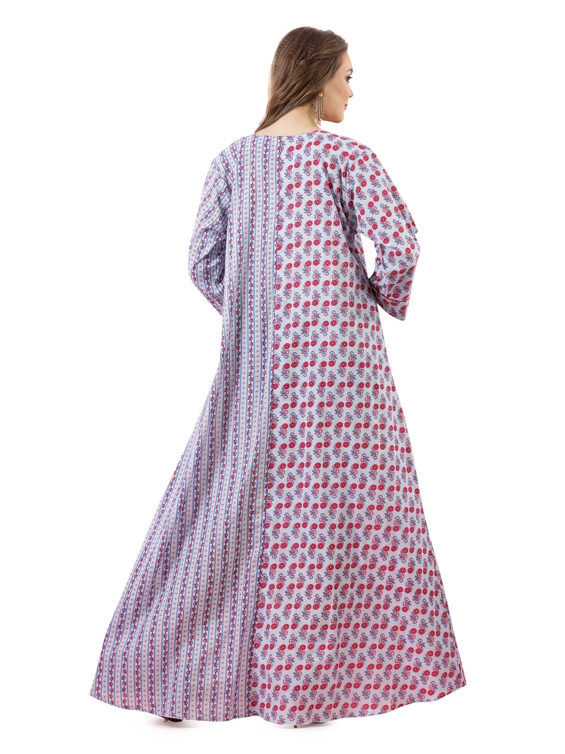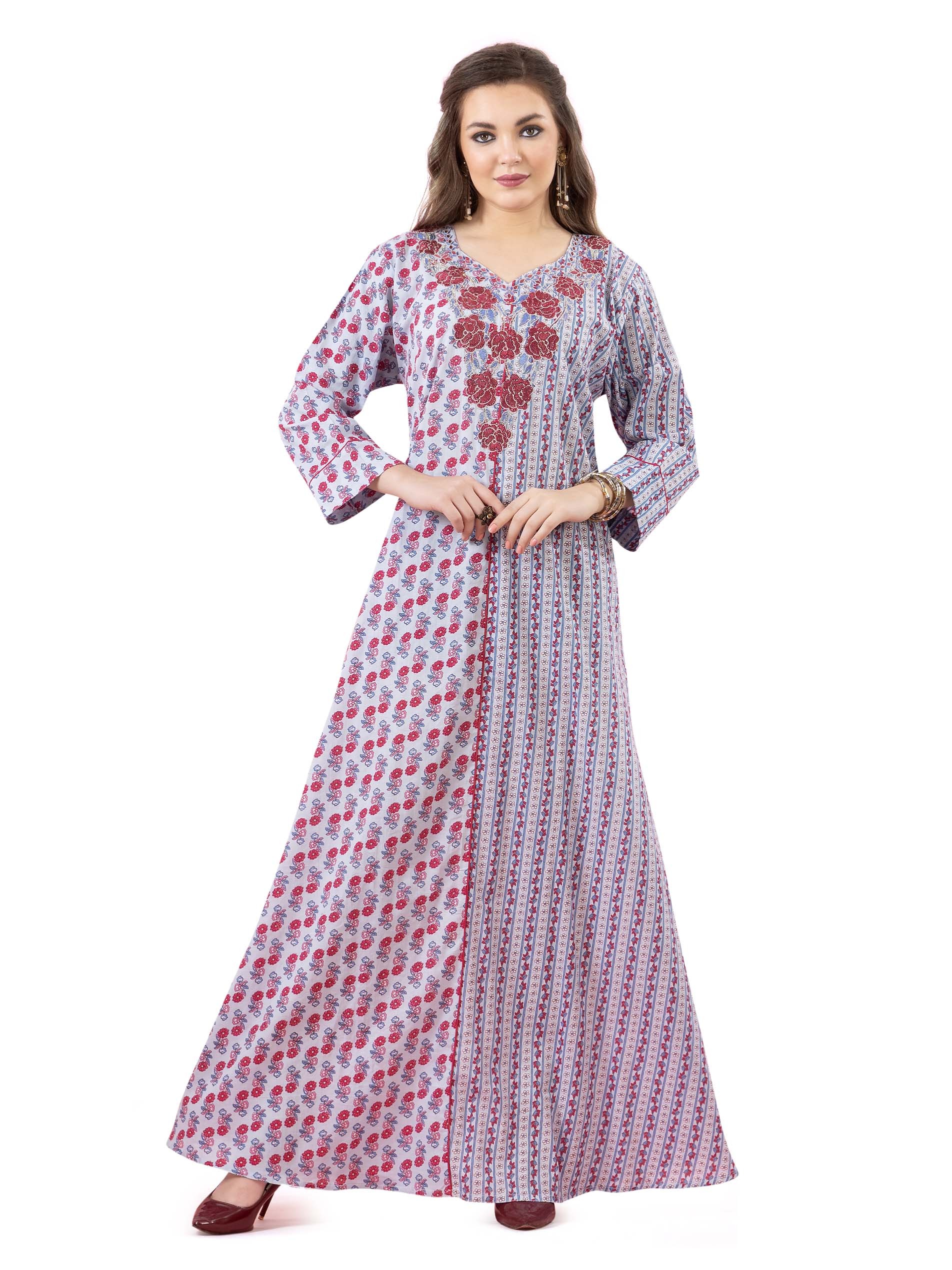 عززي أناقتك بهذه الجلابية المطبوعة المميزة، مصممة بنمطين على كلا الجانبين لاطلالة صيفية جذابة.