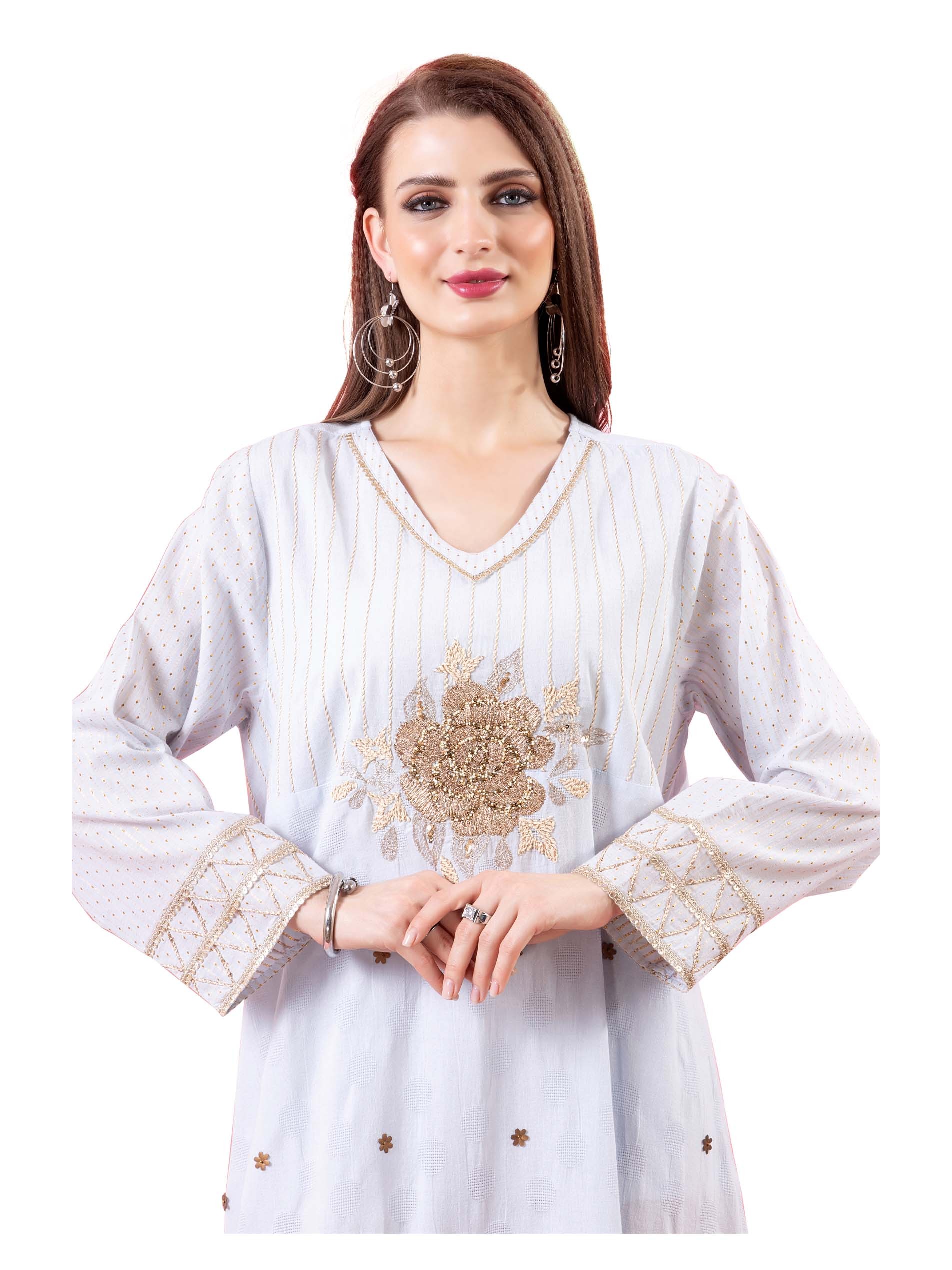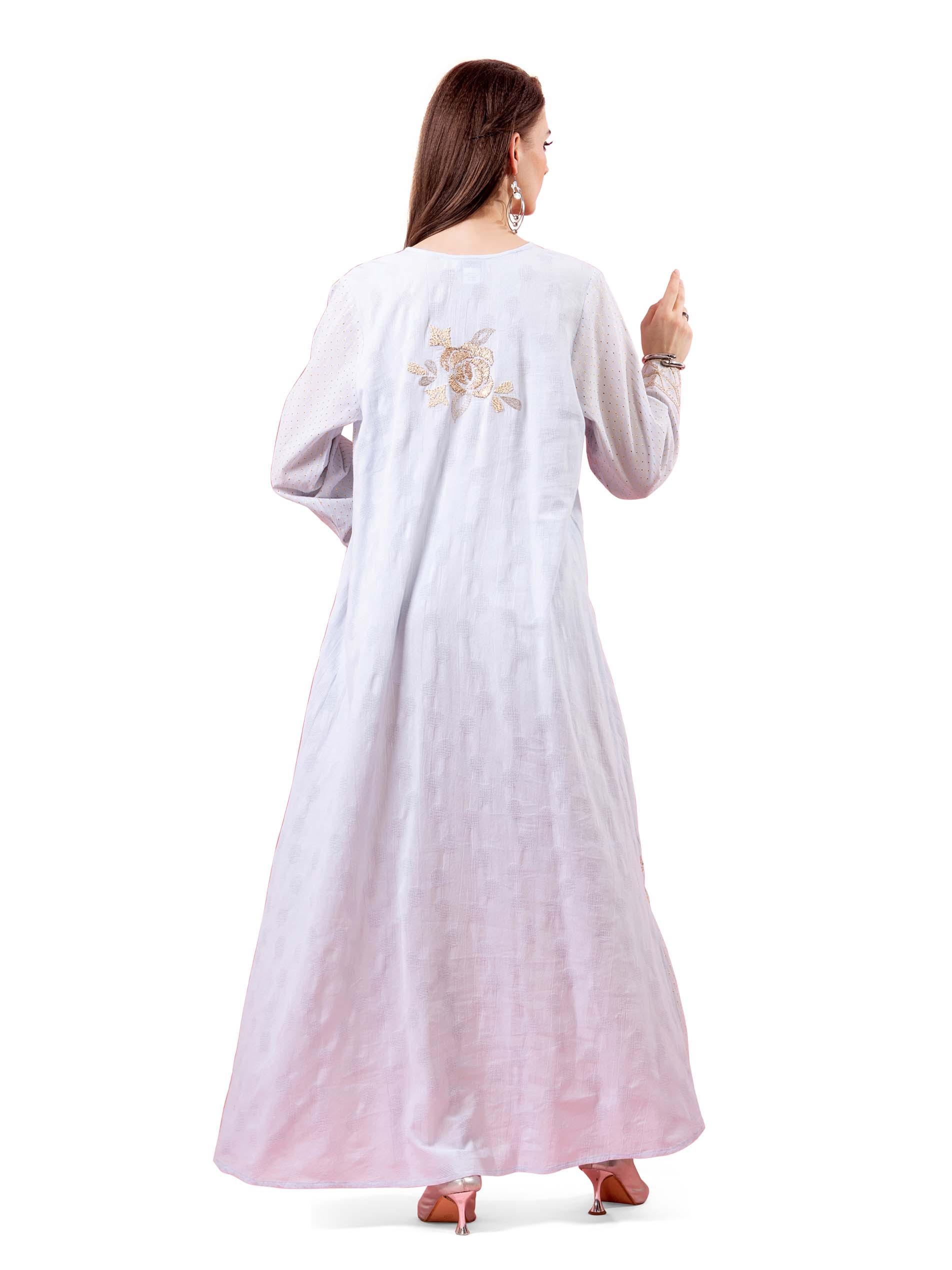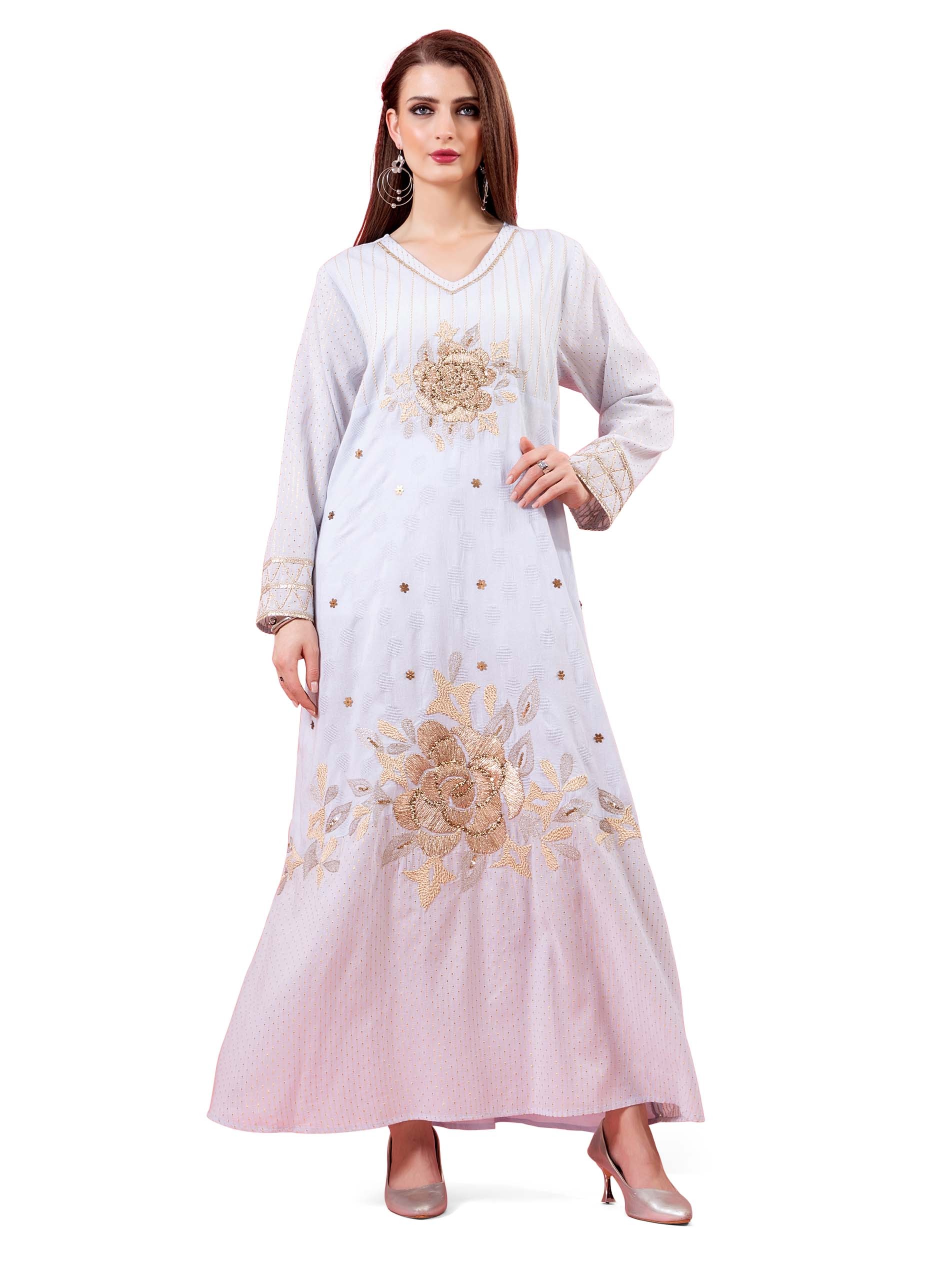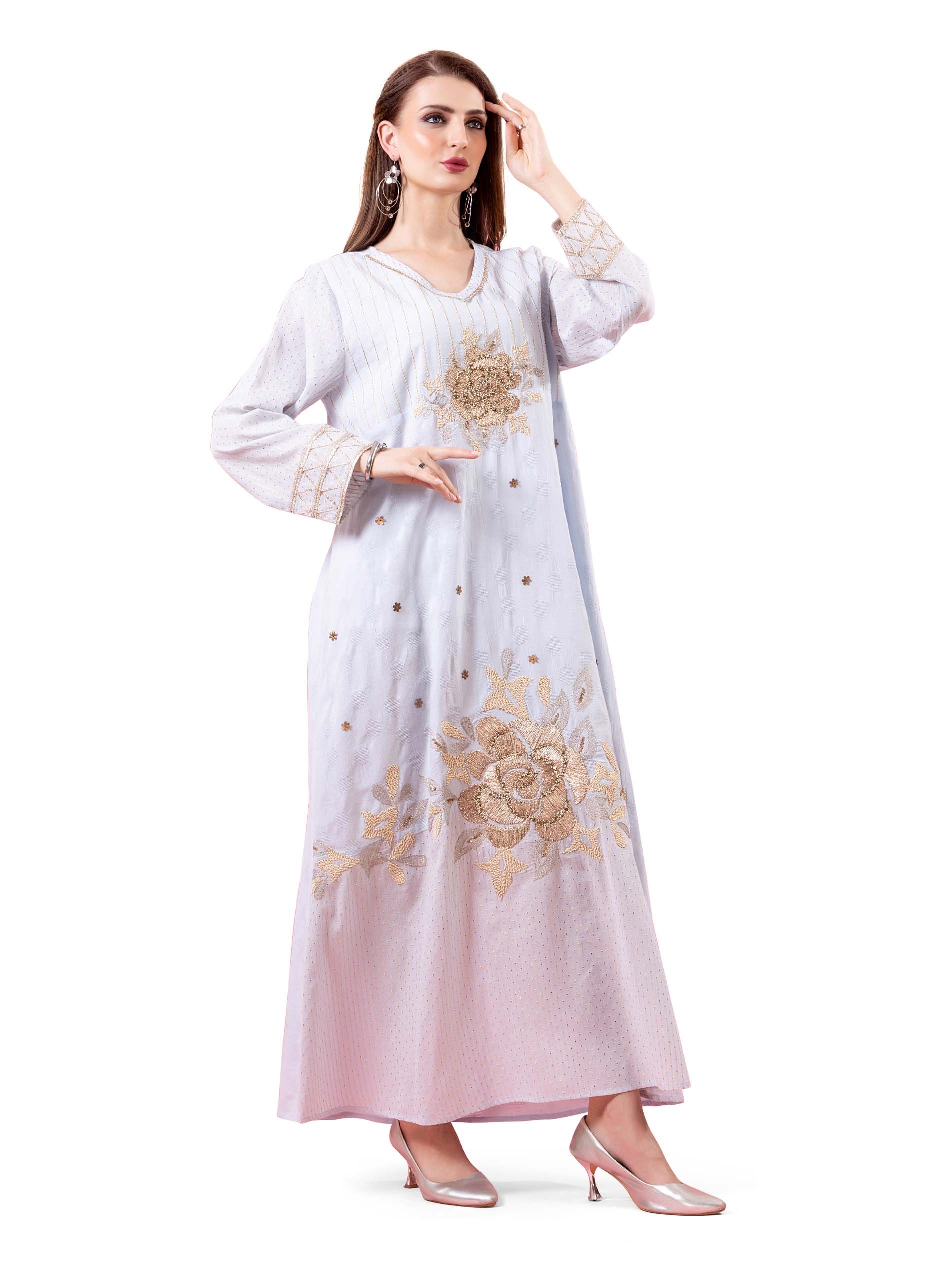 جلابية من القطن باللون الأوف وايت مصممة بتطريز من الزهور باللون الذهبي لتعزز أناقتك.
