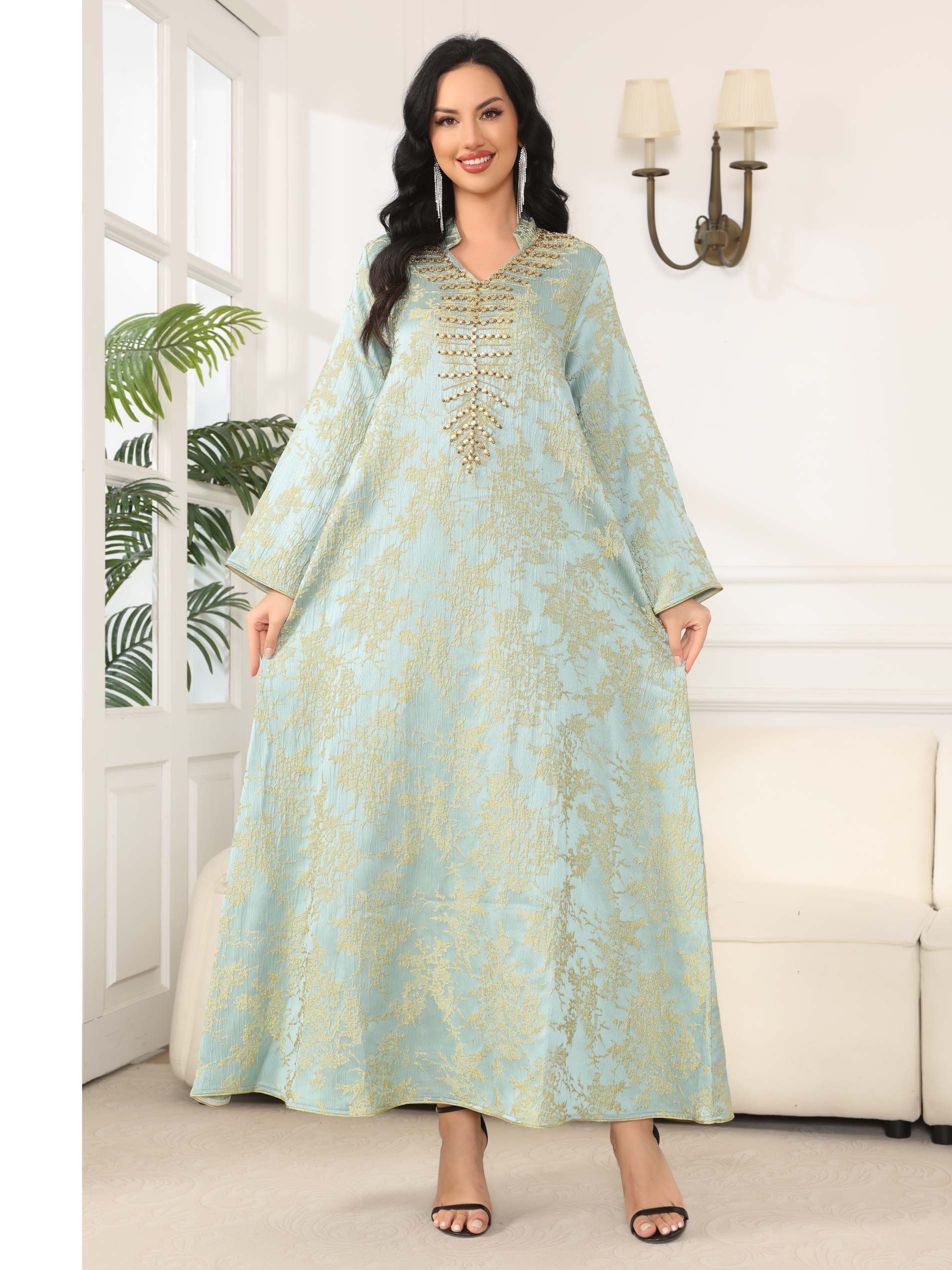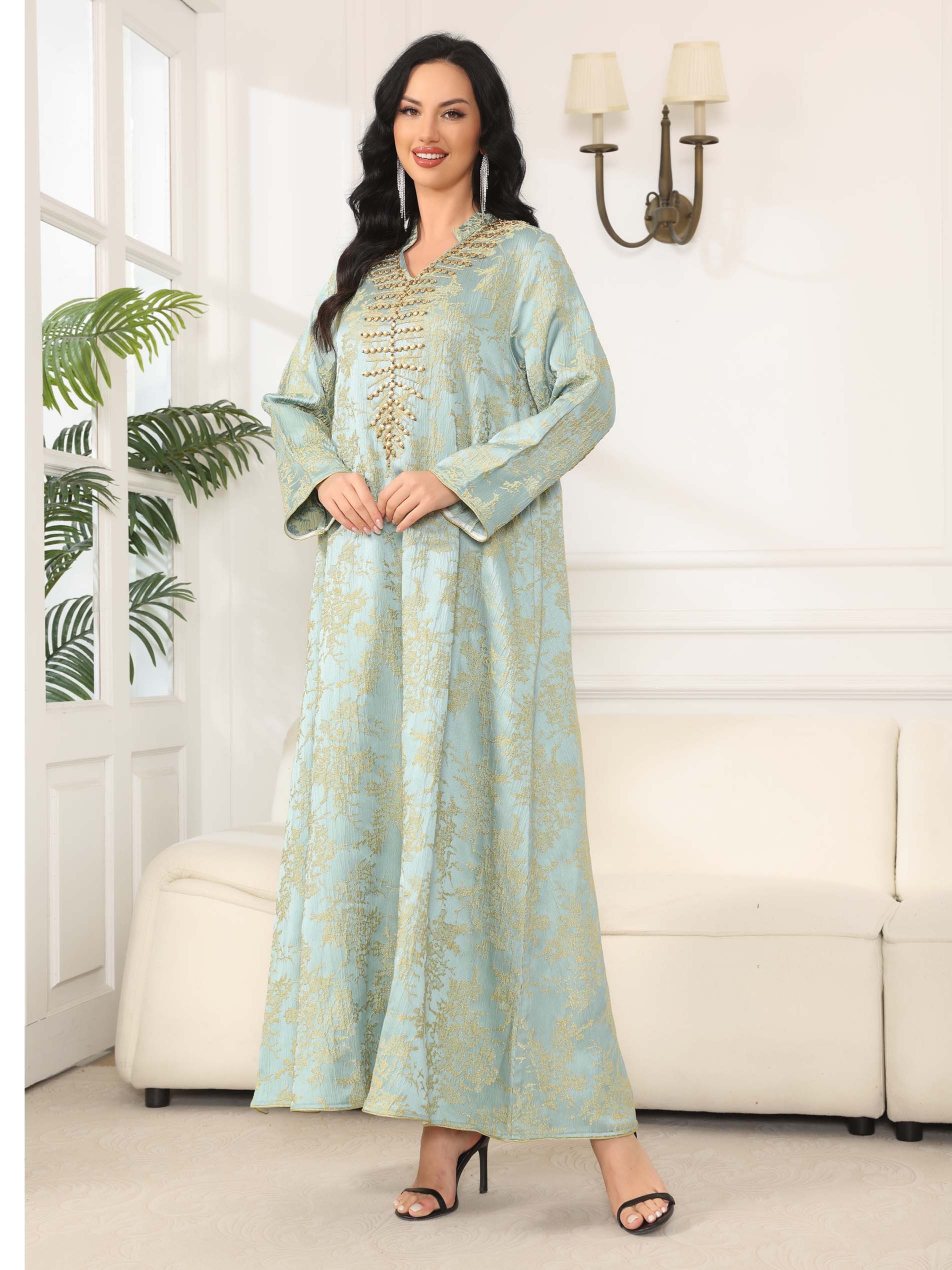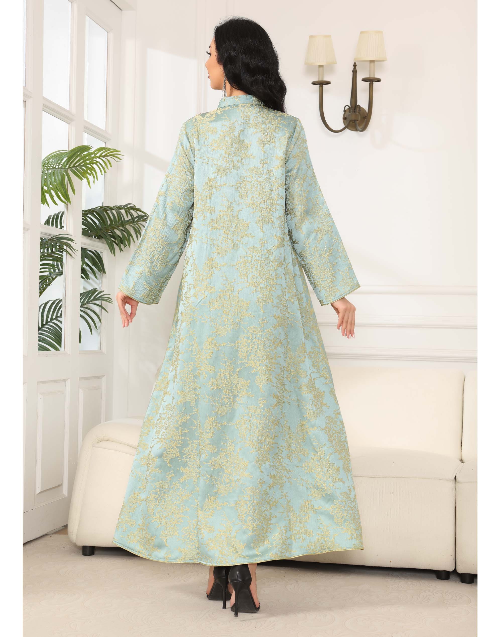 جلابية جاكار ملونة باللون الأزرق الفاتح، مصممة بتطريز ذهبي ومزينة بزخرفة على الصدر لاطلالة استثنائية.