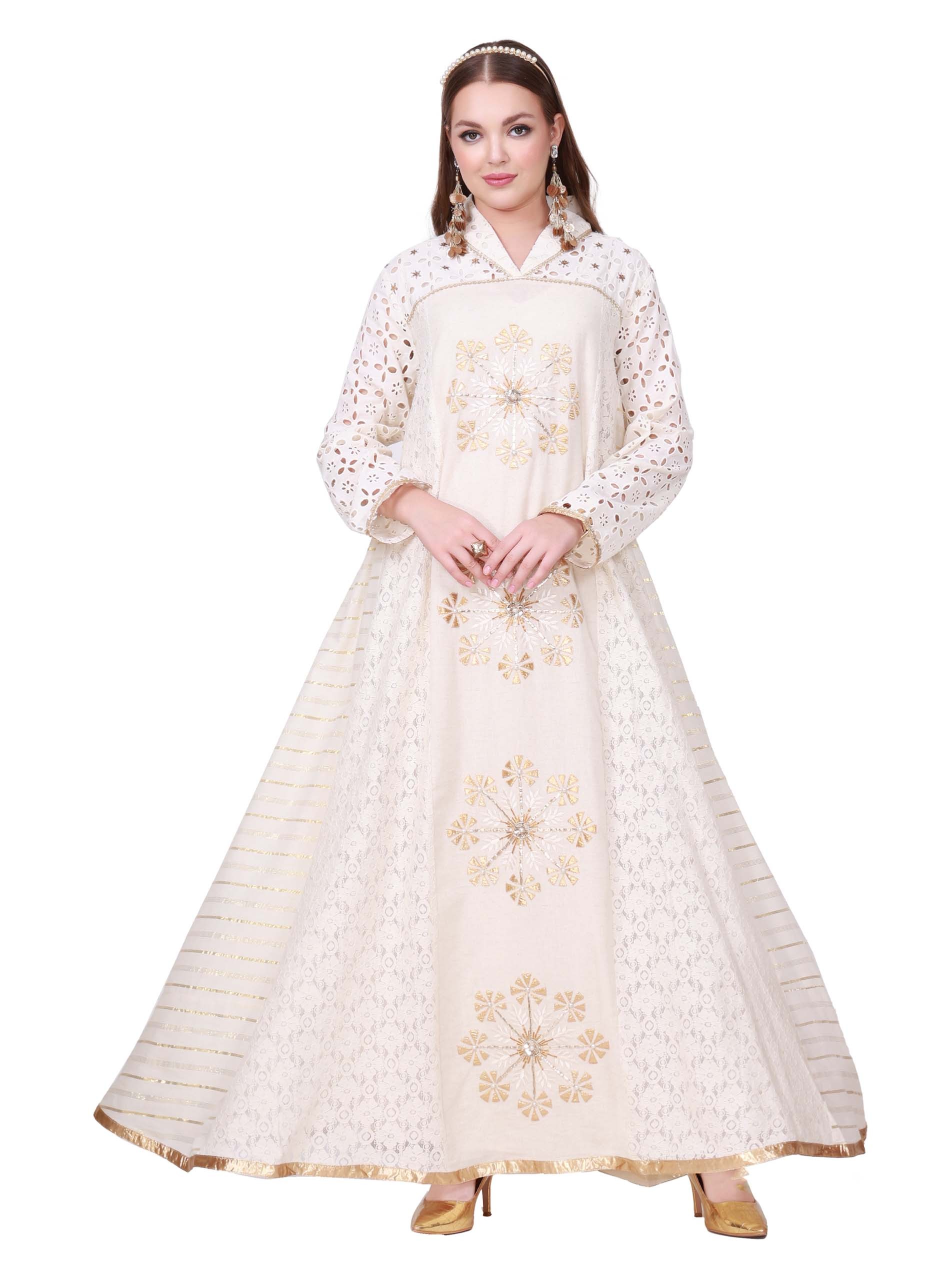 تألقي بجلابية ماكسي بيضاء مصممة من القطن ومطرزة بزهور ذهبية لاضفاء لمسة مميزة لمظهرك.