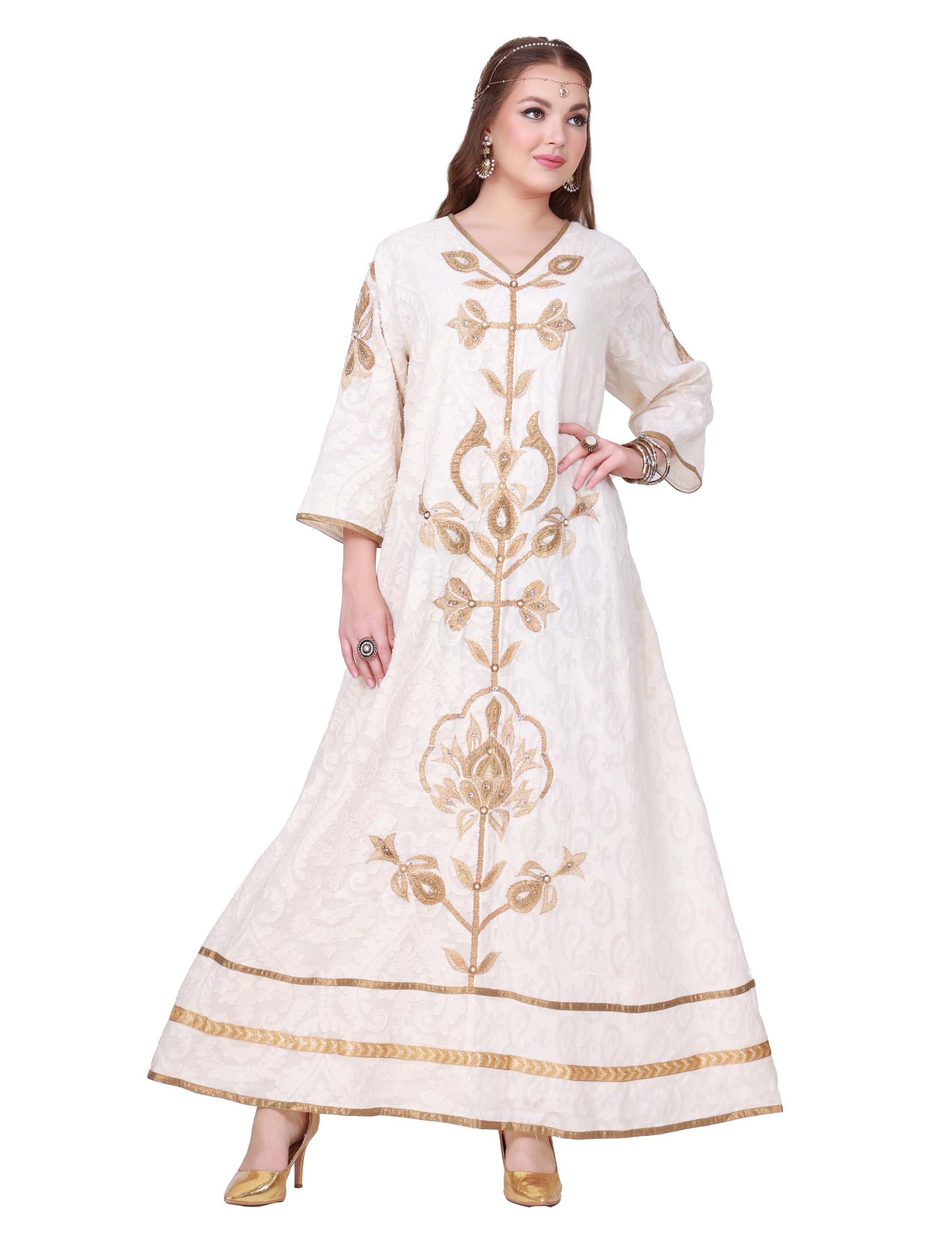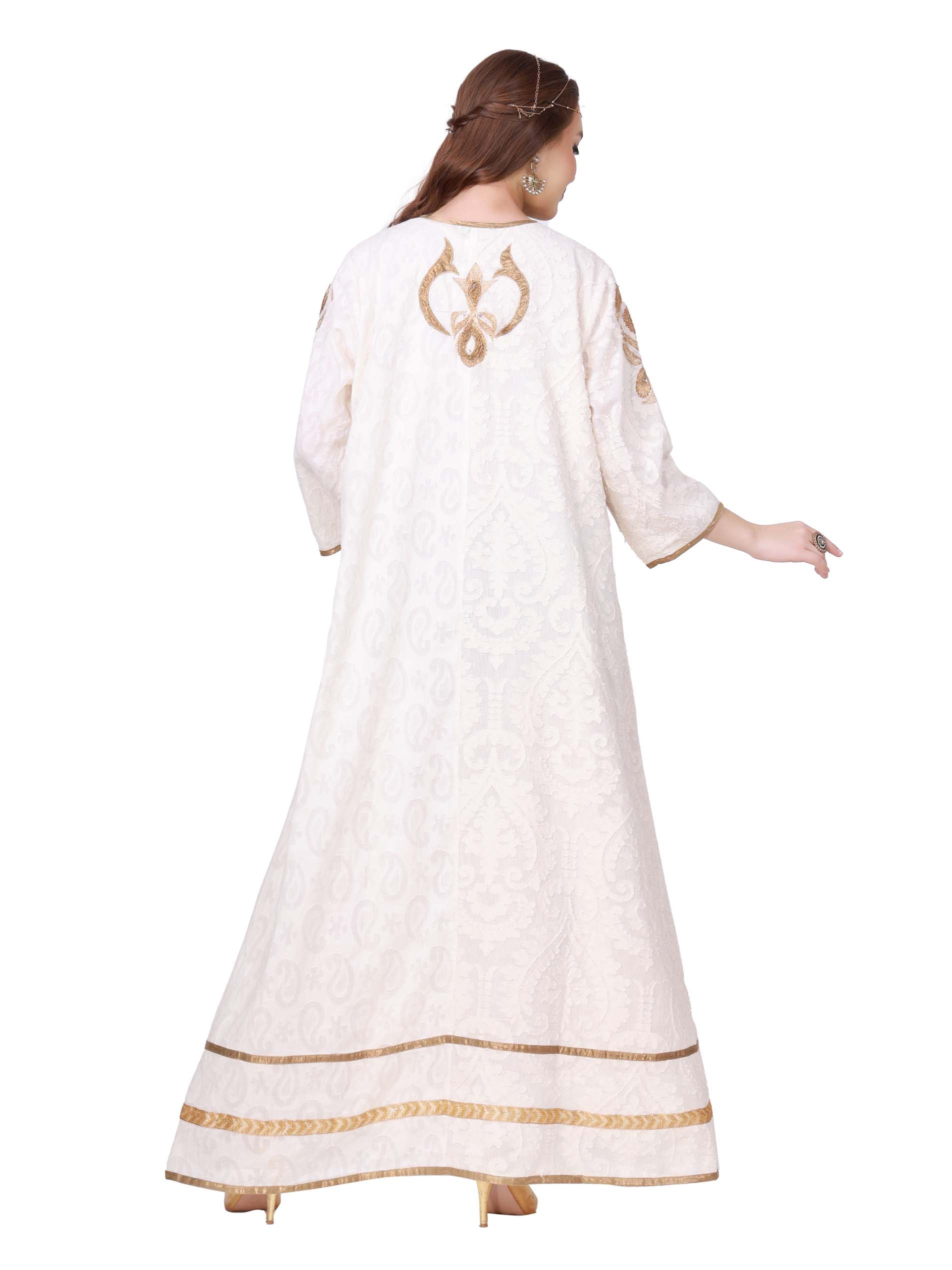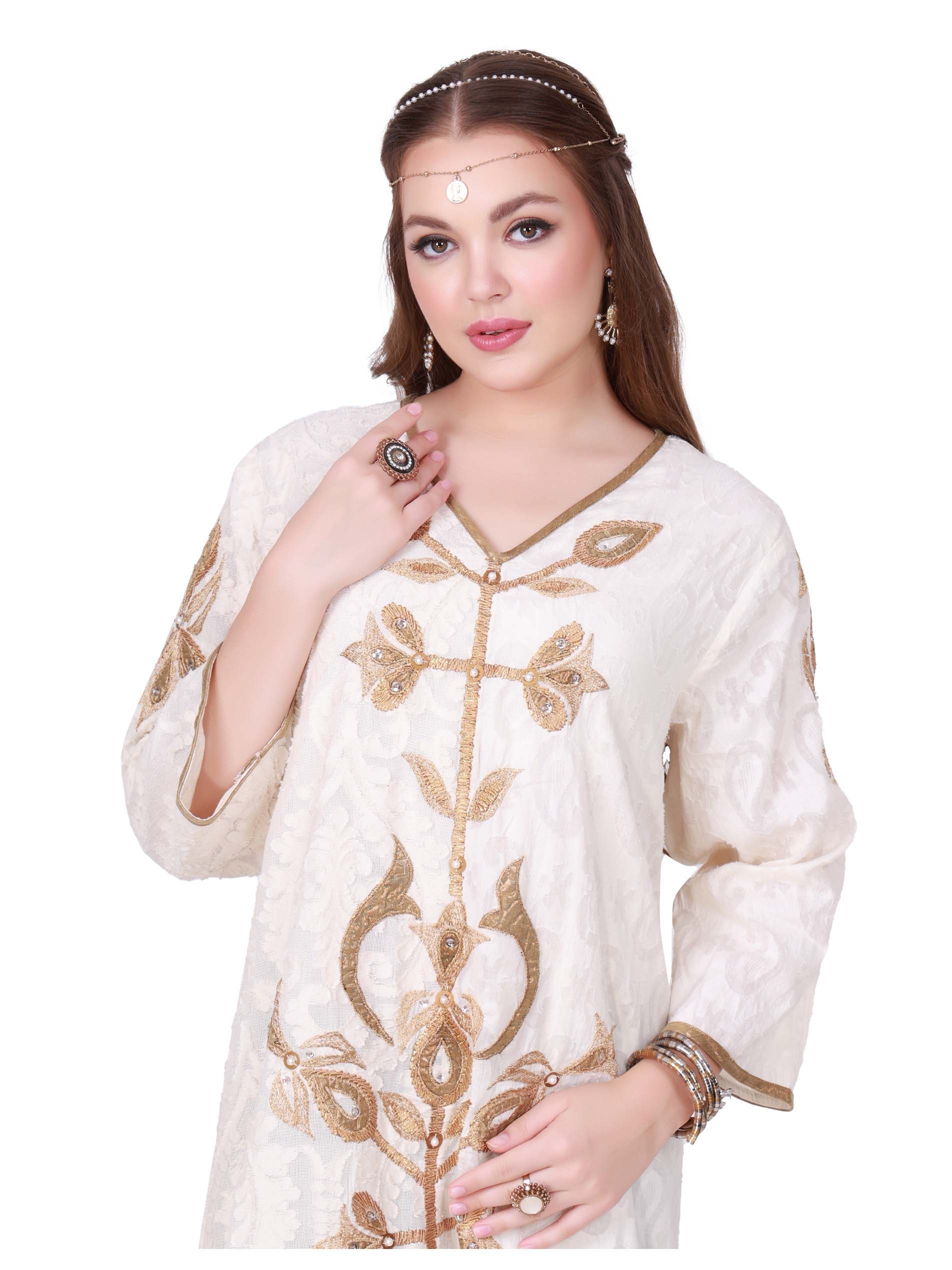 استمتعي بالأناقة في هذا الموسم الاحتفالي بجلابية بيضاء اللون مصممة بشكل مثالي مع تطريز ذهبي لتجعلك مميزة.