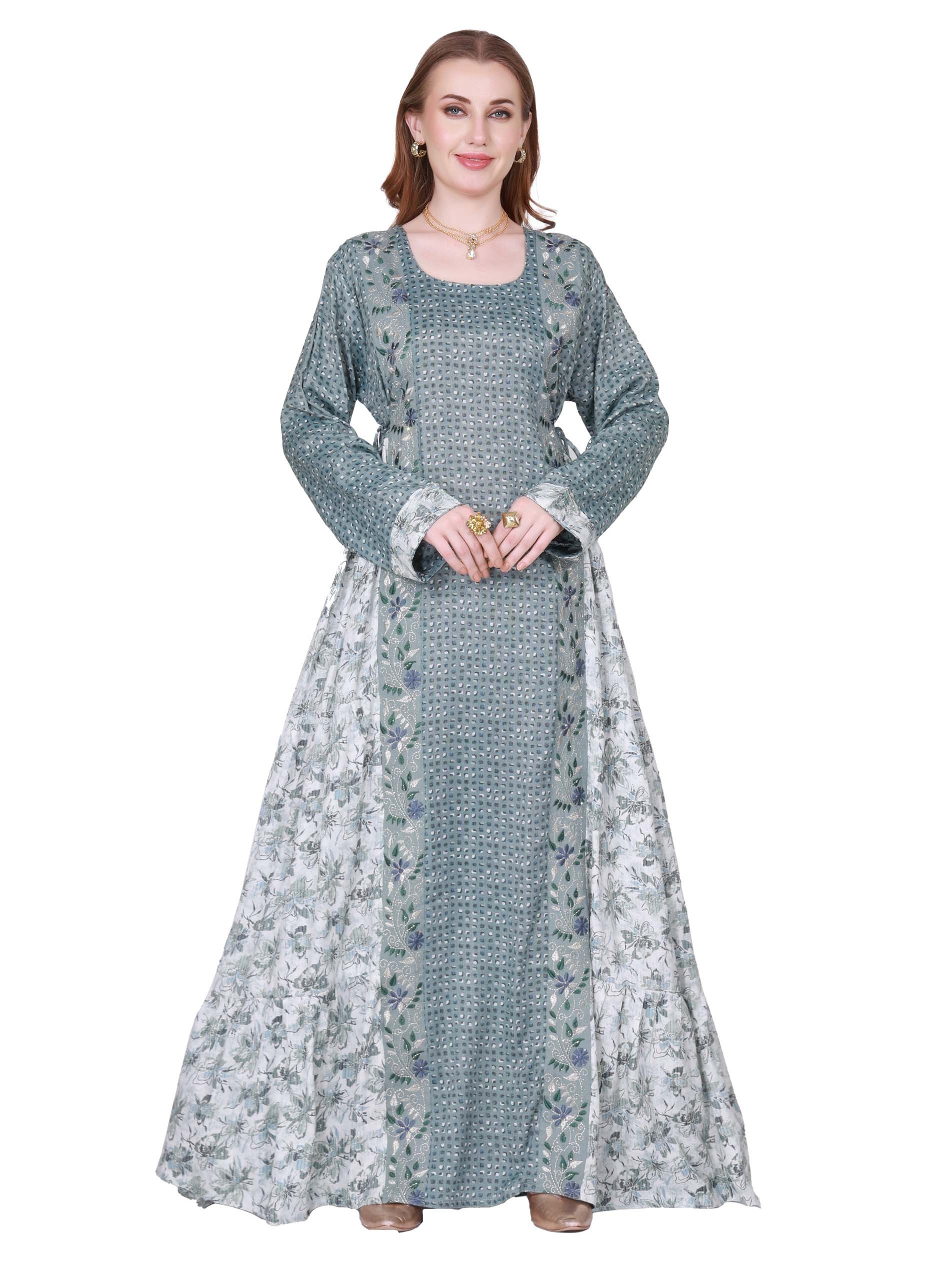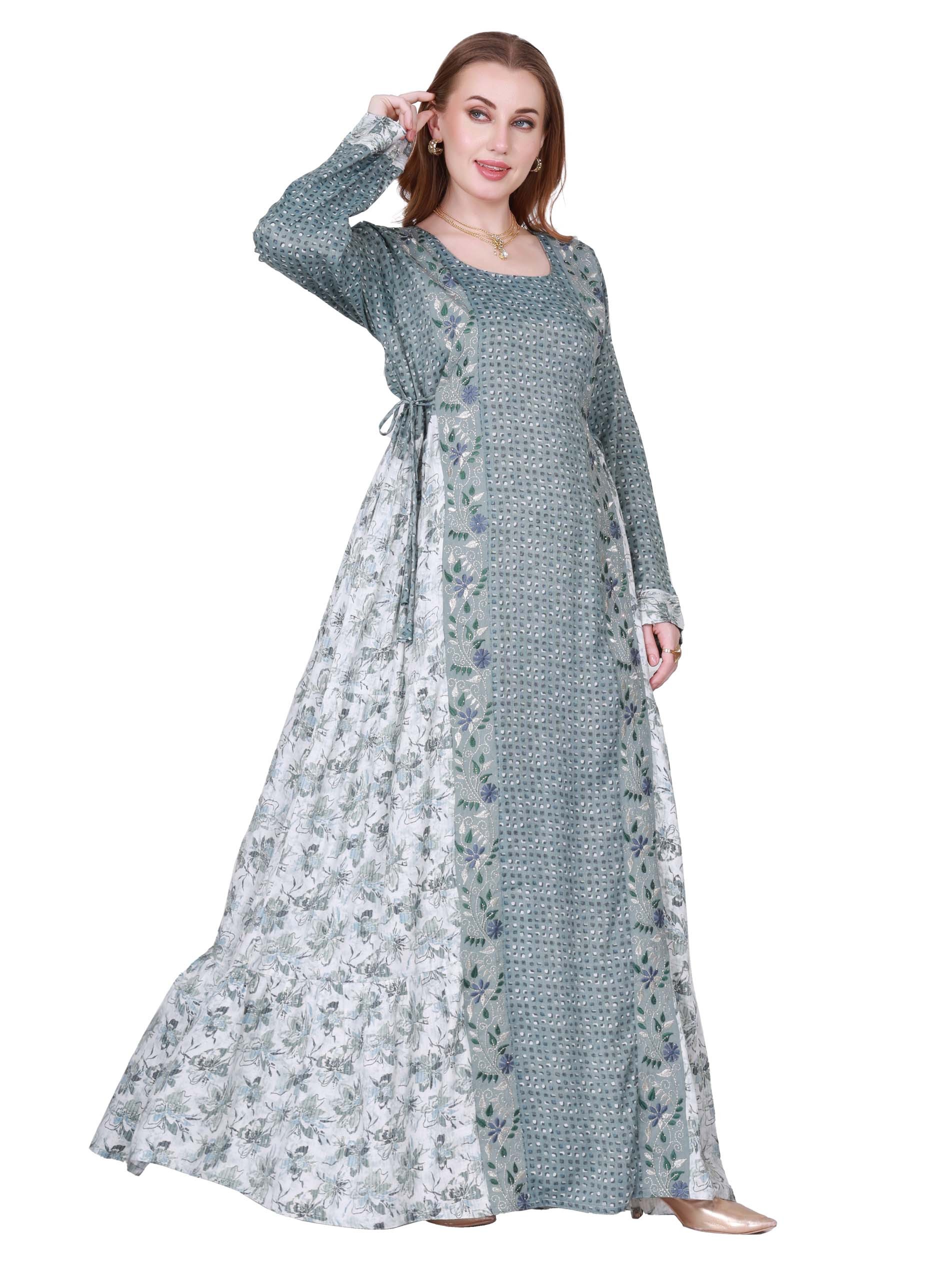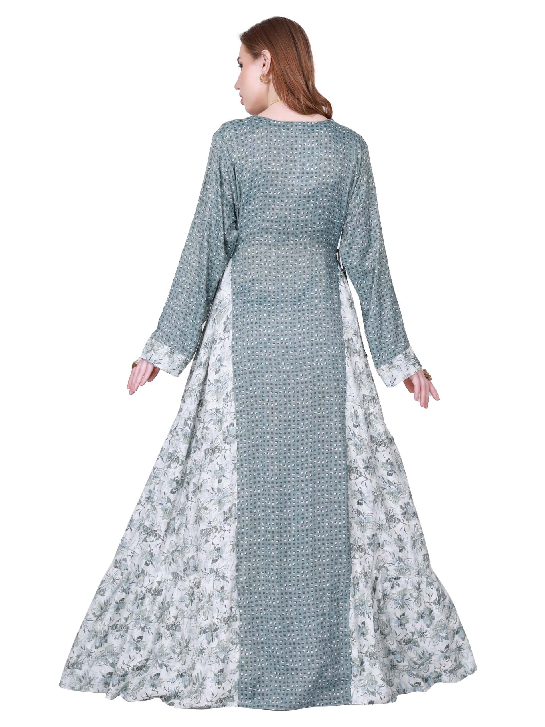 جلابية ماكسي من القطن مصممة باللونين الرمادي والأبيض بطبعة الأزهار لتمنحك اطلالة فريدة من نوعها كما تبدو.