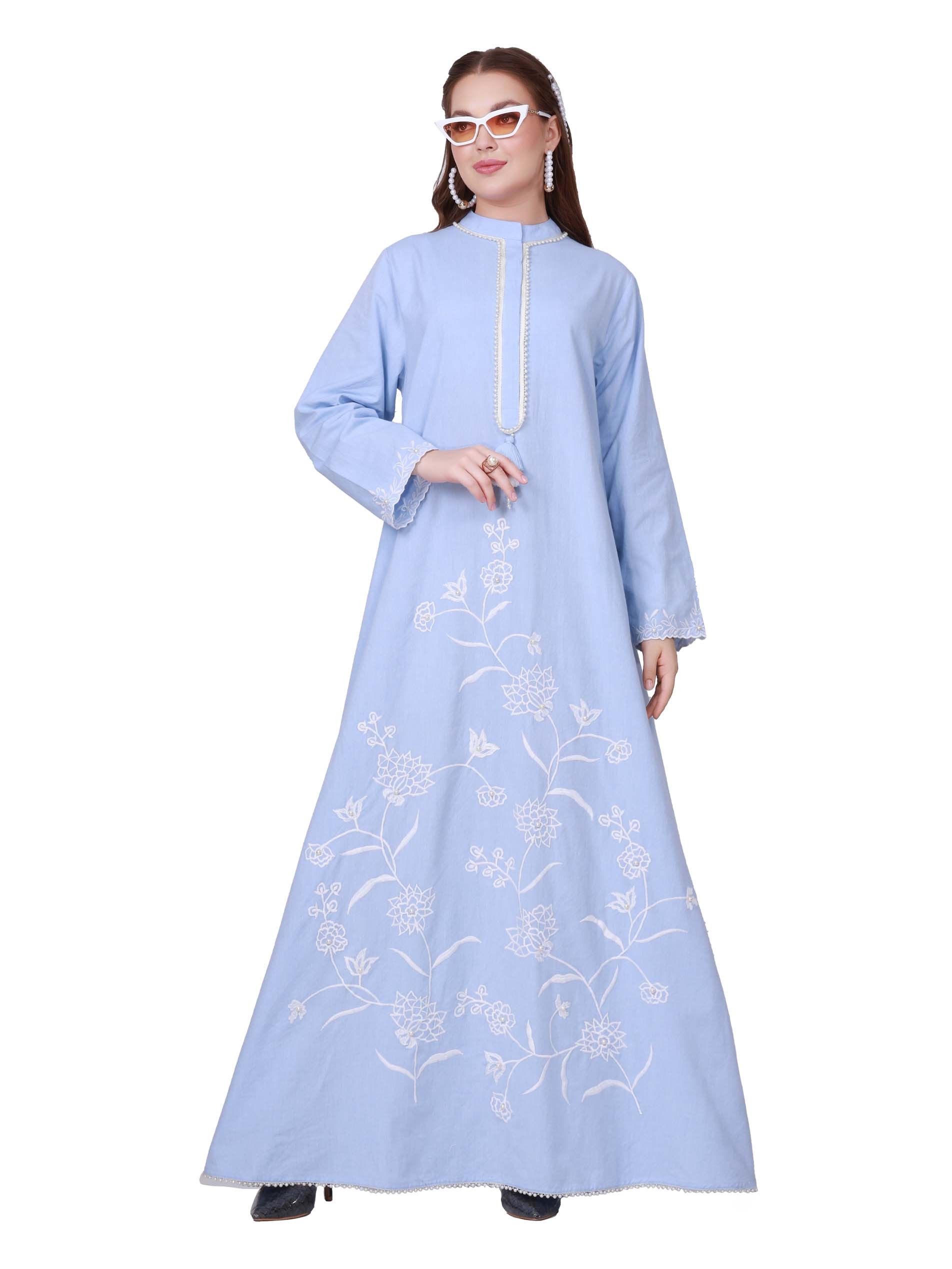 جلابية من القطن مصممة باللون الأزرق الفاتح ومزينة بتطريز من الزهور باللون الأبيض. هذه الجلابية المريحة تجمع ما بين البساطة والسحر في المناسبات والاحتفالات.