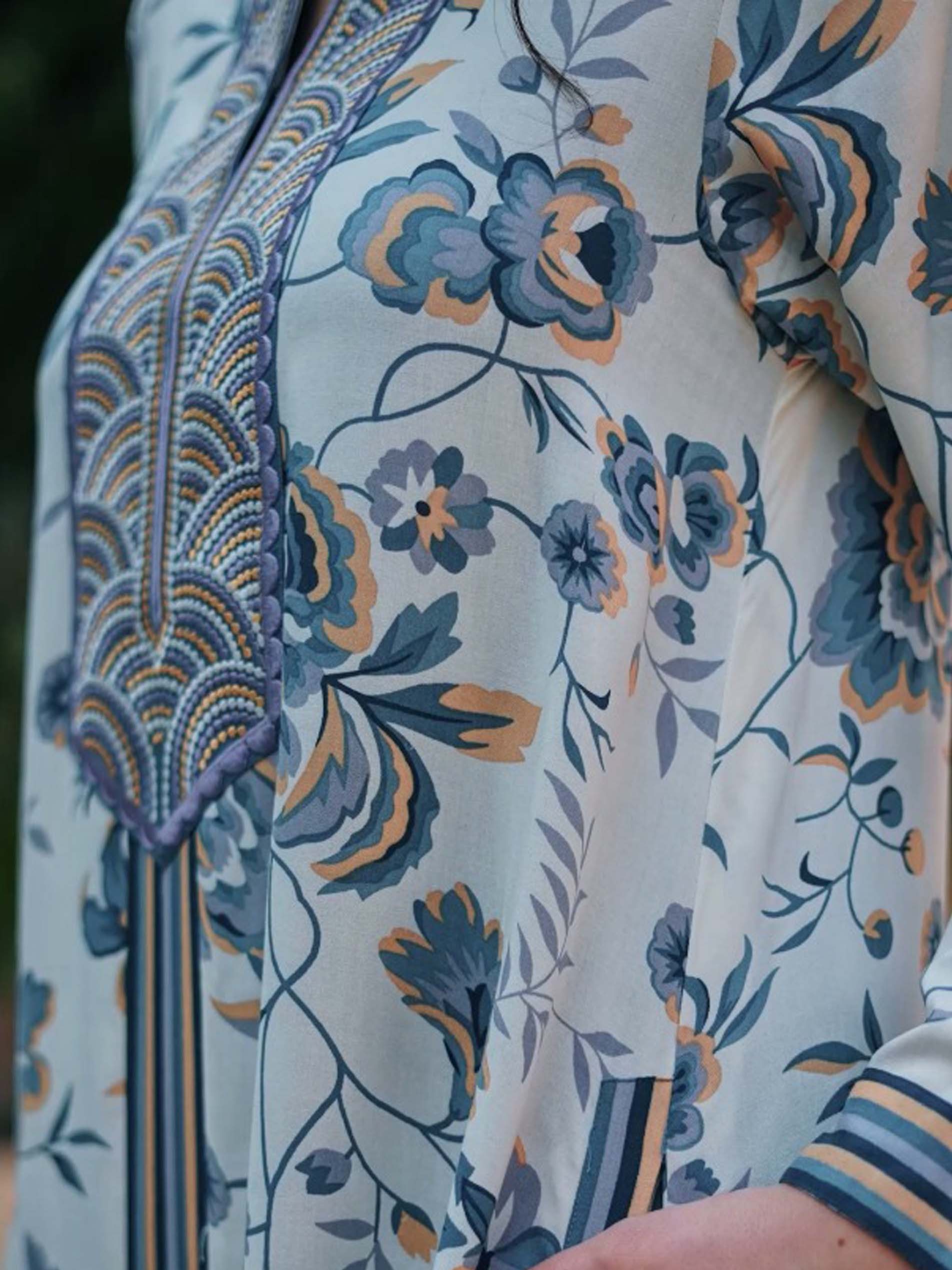 استمتعي بجلابية رائعة من الرايون، مصممة بنقشة الأزهار باللونين الأزرق والأبيض مع أكمام طويلة وتطريز رائع على الصدر.