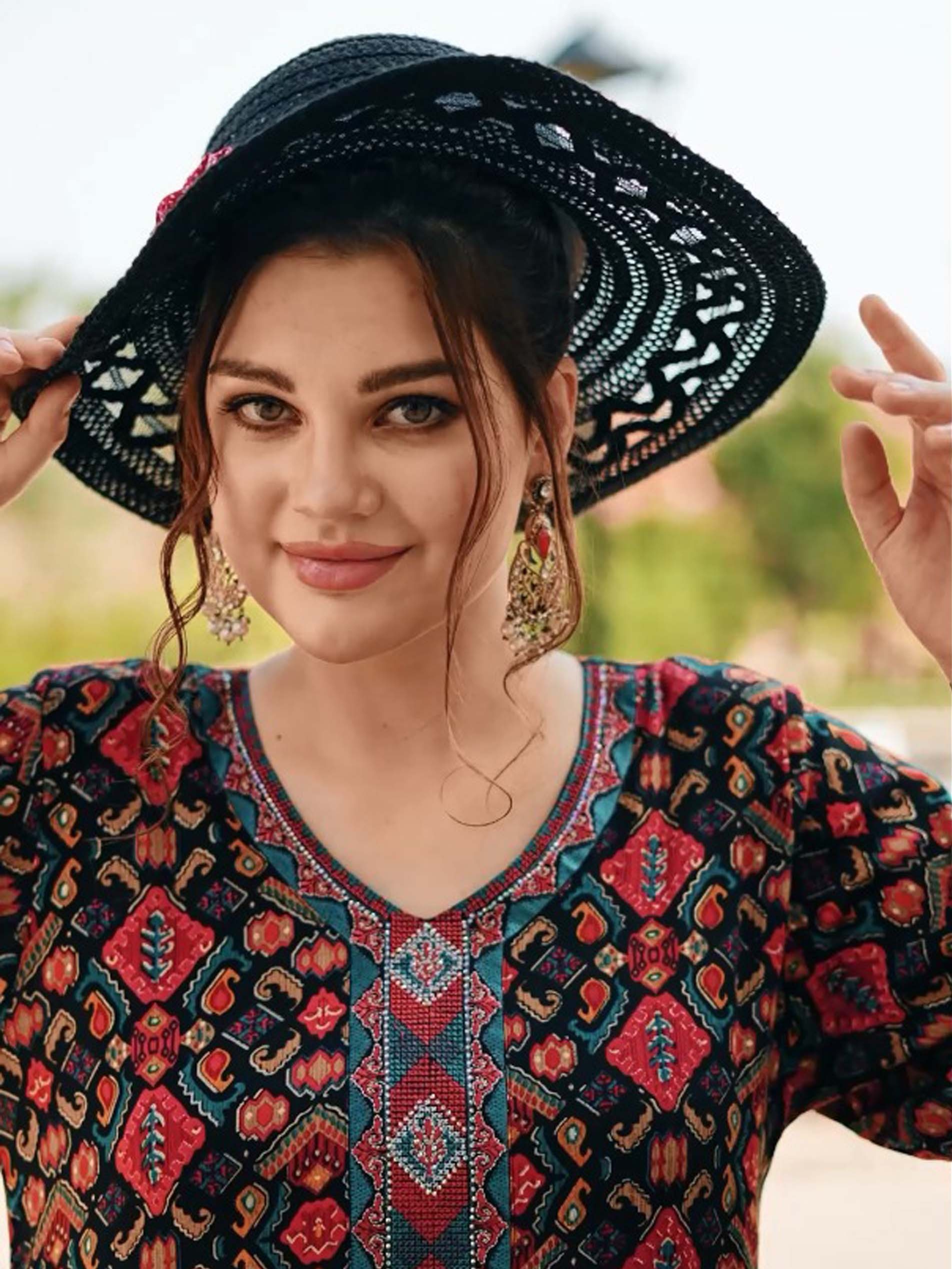 جلابية مطبوعة من القطن مصممة بألوان مبهجة مع أكمام طويلة ونقوشات مميزة على الصدر.