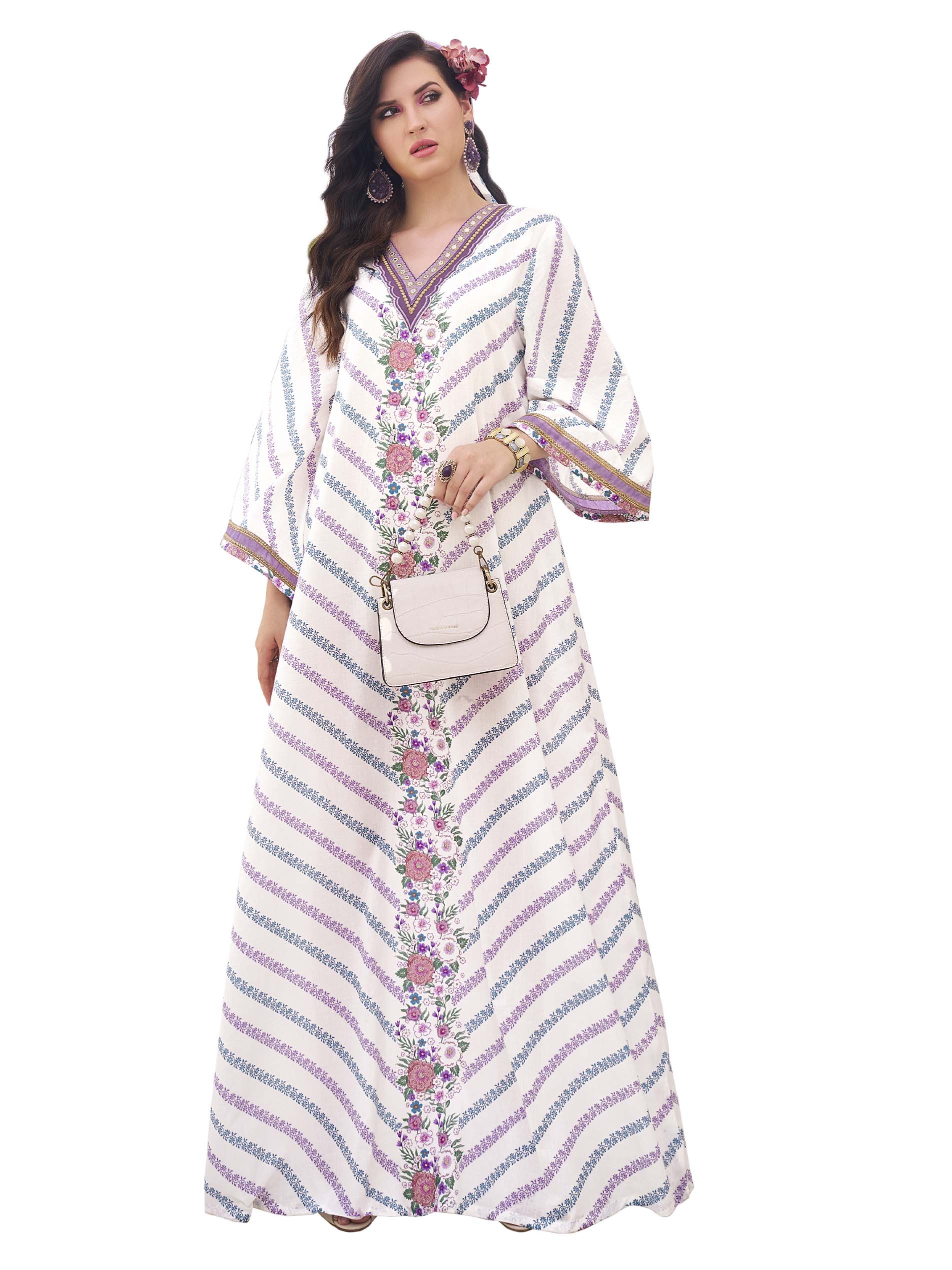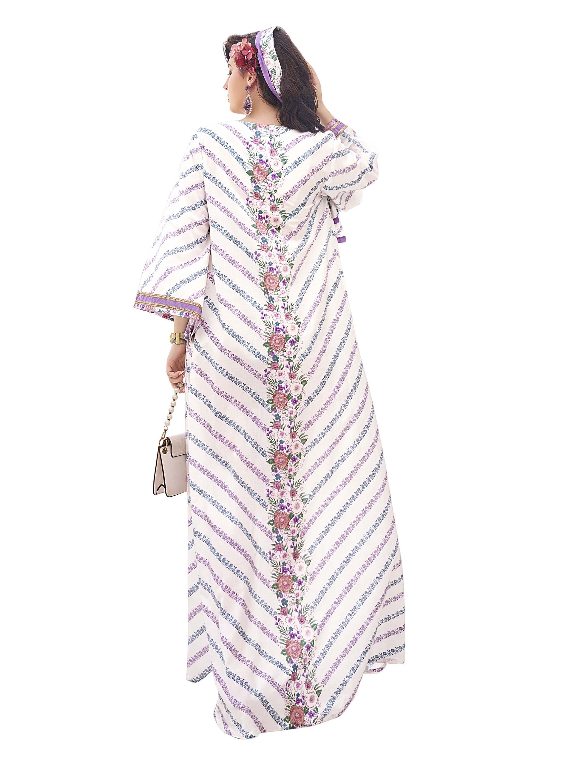 جلابية قطنية بيضاء اللون مصممة بتطريز مخطط من الزهور الملونة على جانبي الجلابية. وبتكمل التصميم بأكمام طويلة واسعة وطبعة الأزهار التي تمتد بطول الجلابية لتمنحك الشعور بالأناقة والتميز.