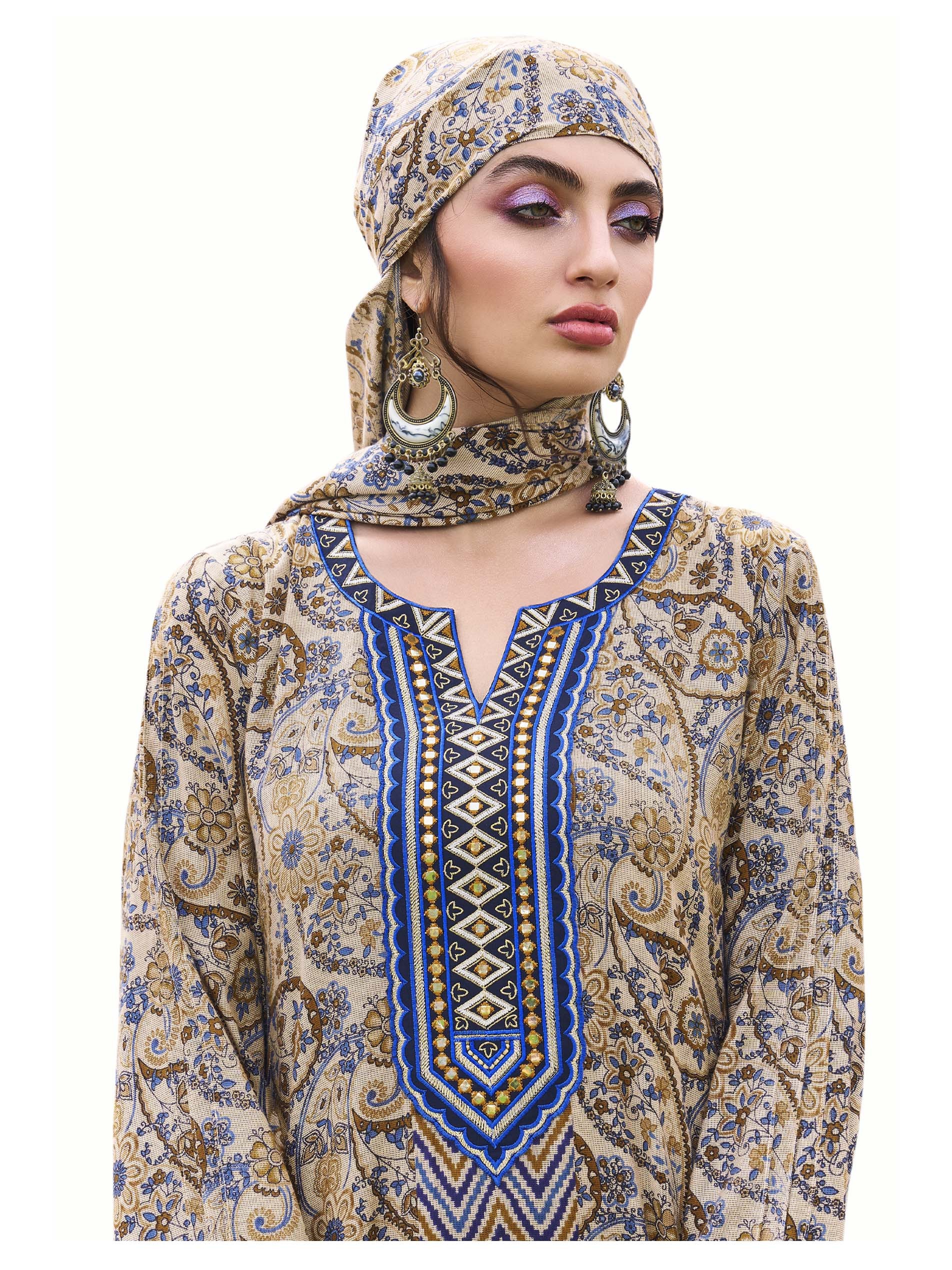 جلابية من القطن بتصميم فريد يدمج بين الزهور والخطوط المتعرجة باللونين الأزرق والذهبي مع أكمام طويلة وتطريز مميز على الصدر.
