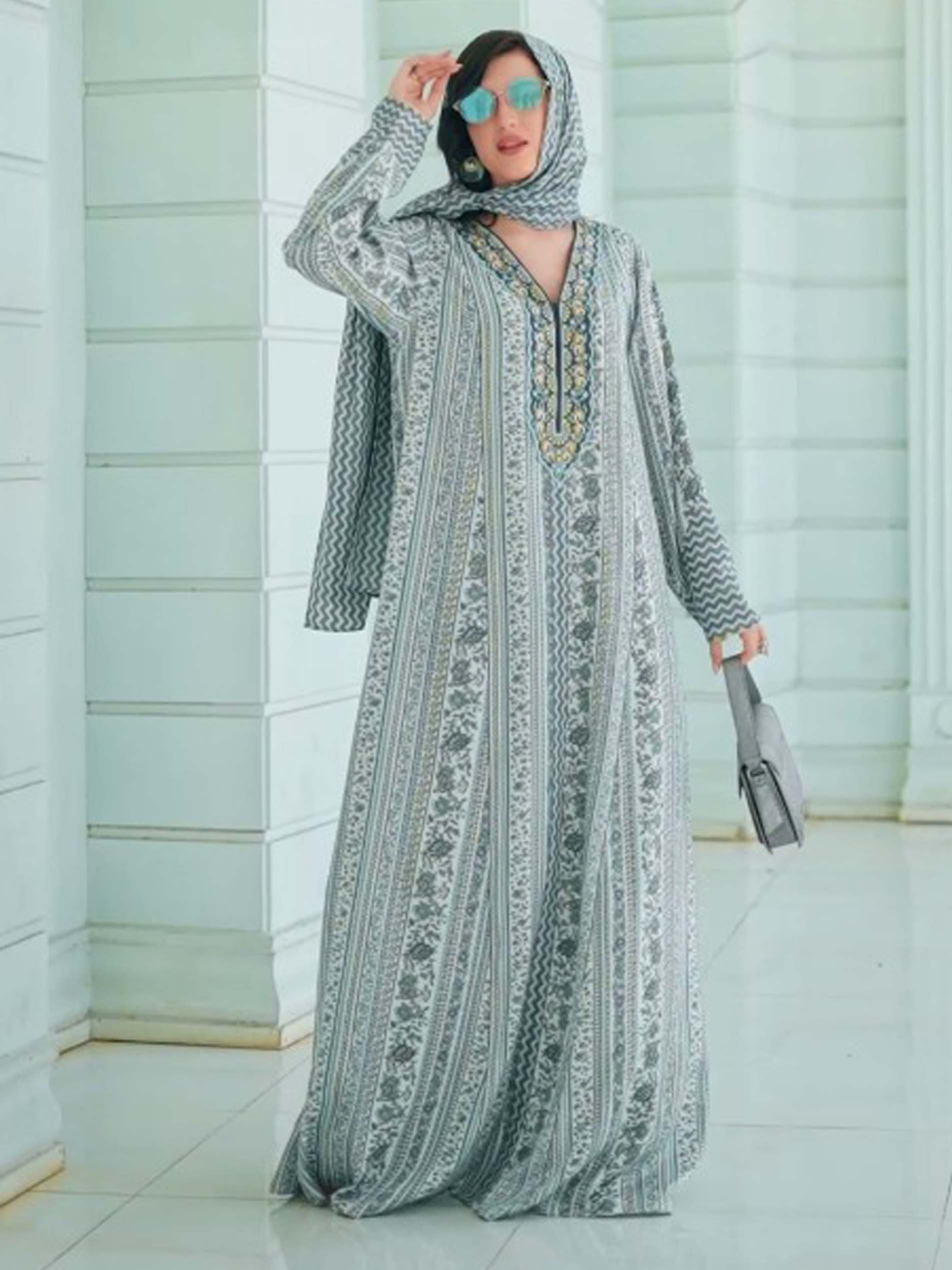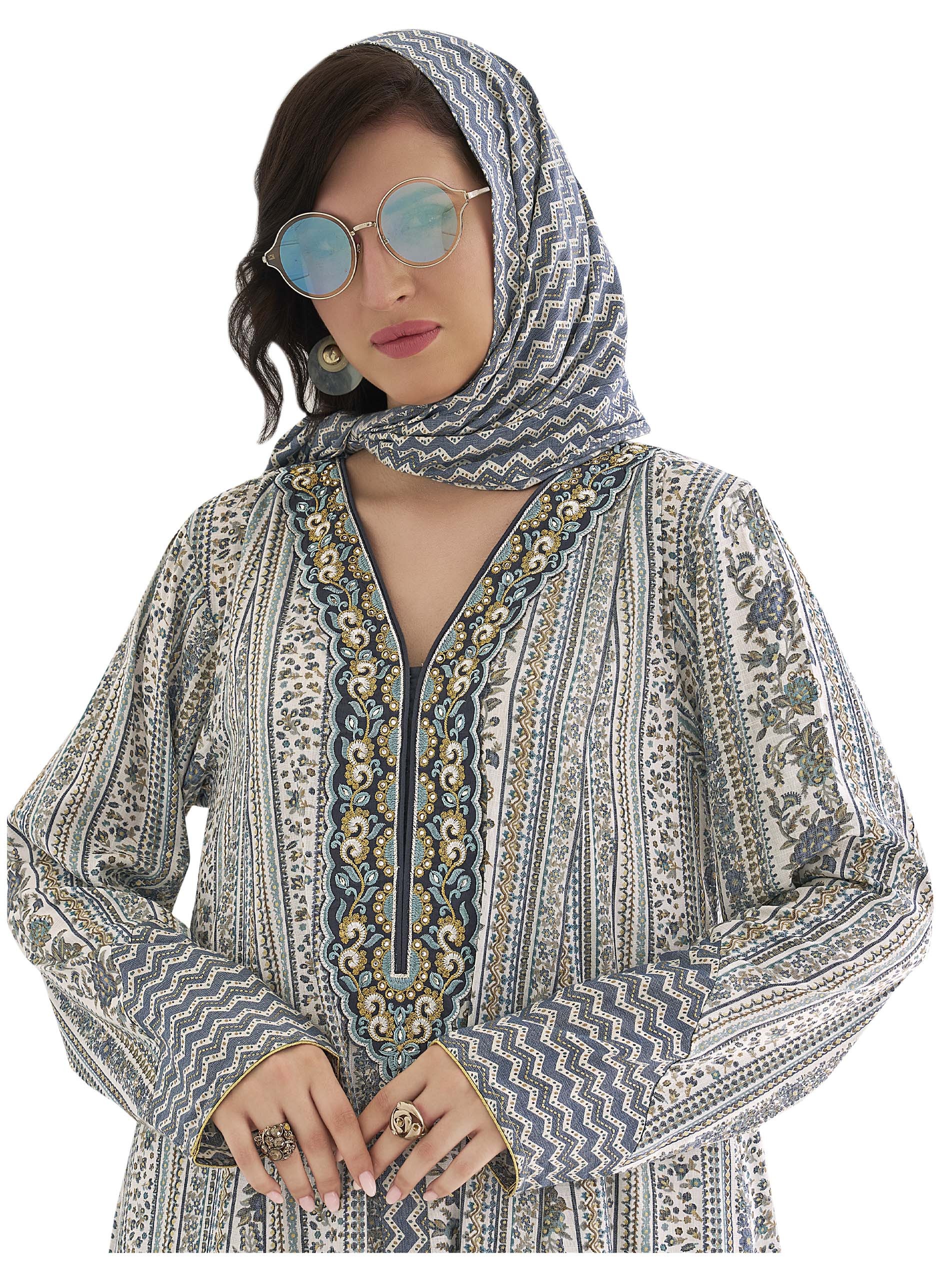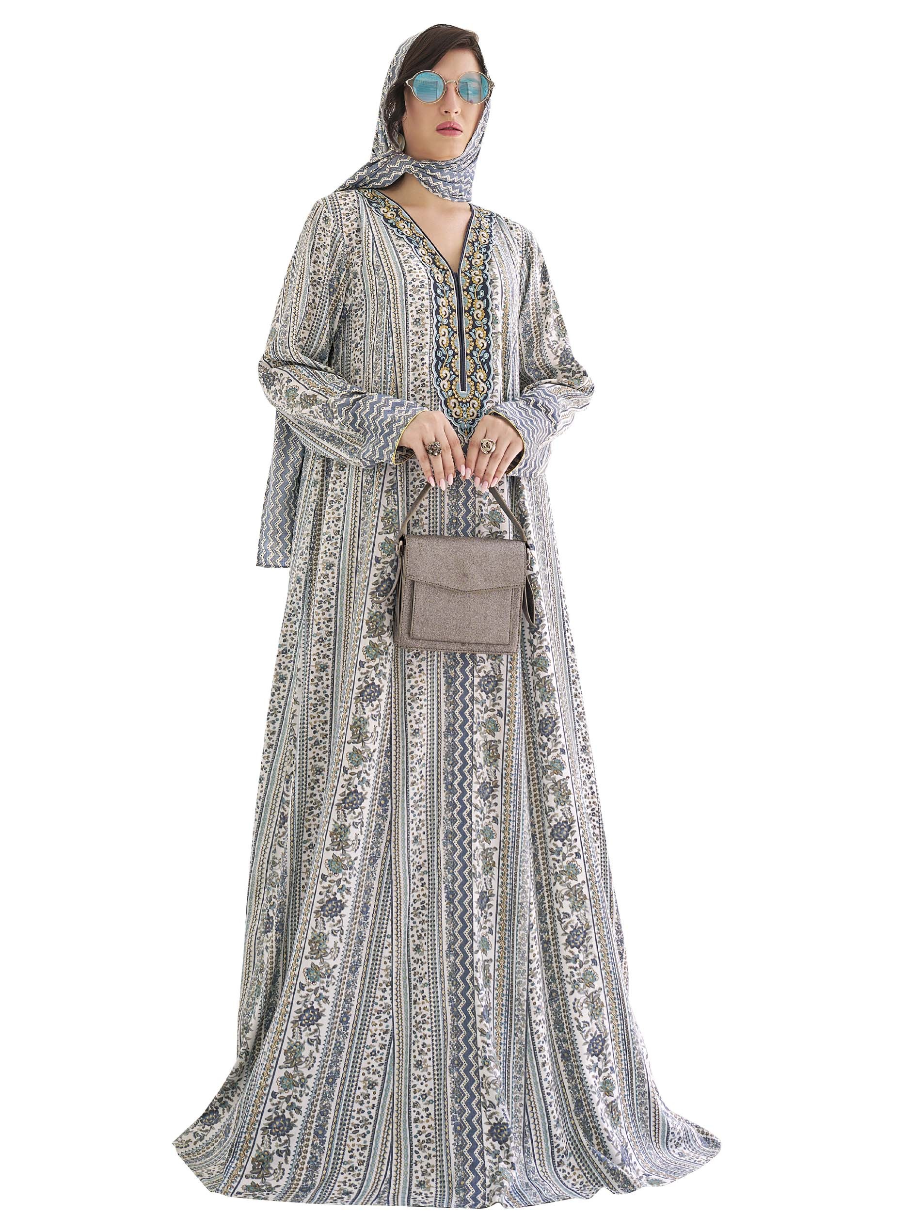 تعبر هذه الجلابية عن ذوقك الرفيع واهتمامك بالتفاصيل حيث أنها تنفرد باللون الأزرق الفاتح وتصميمها الفريد الذي يجمع بين الخطوط المموجة والزهور ليكون تحفة فنية! ويكتمل التصميم بتطريز مميز على الصدر باللونين الأزرق والذهبي.