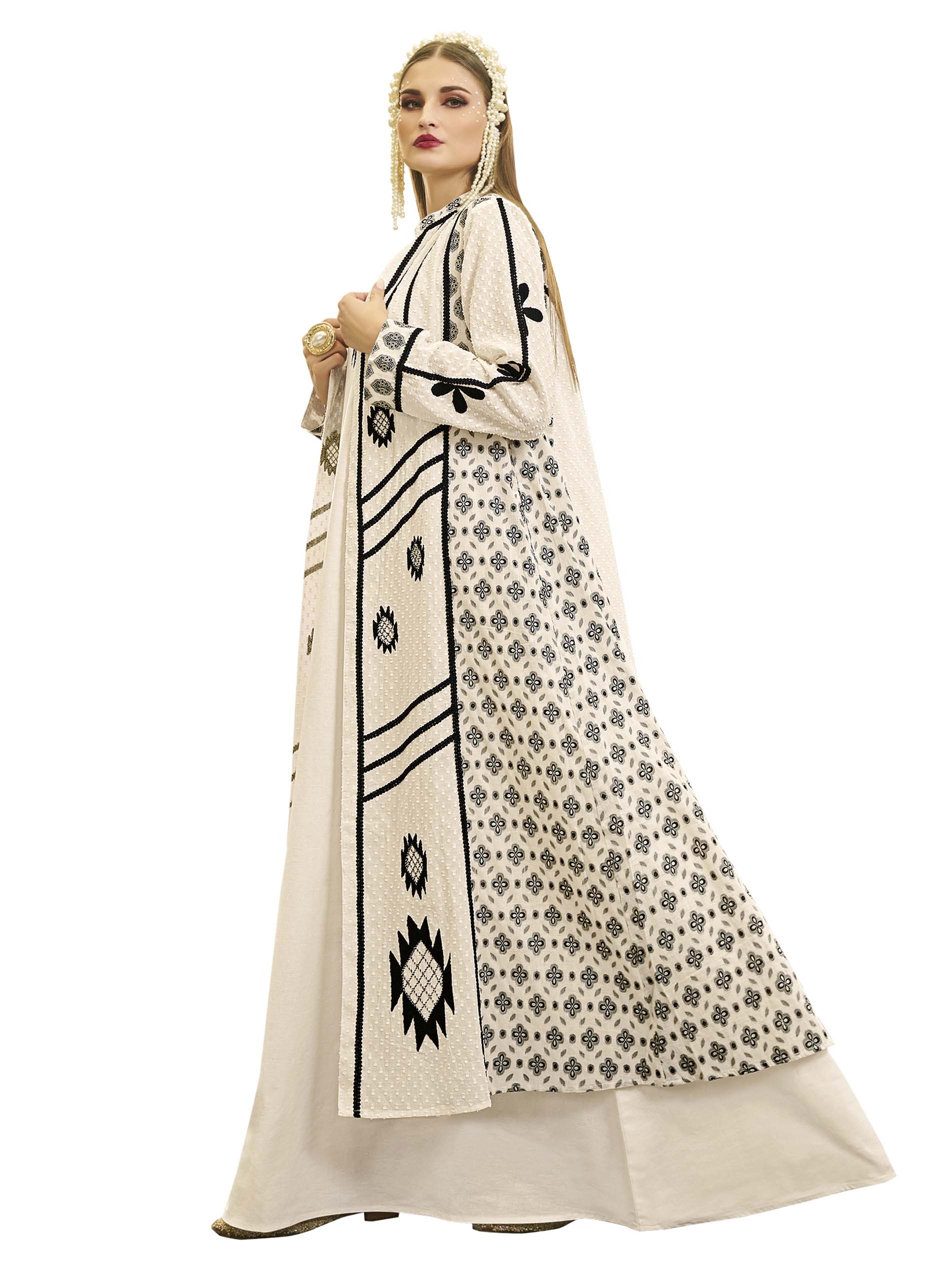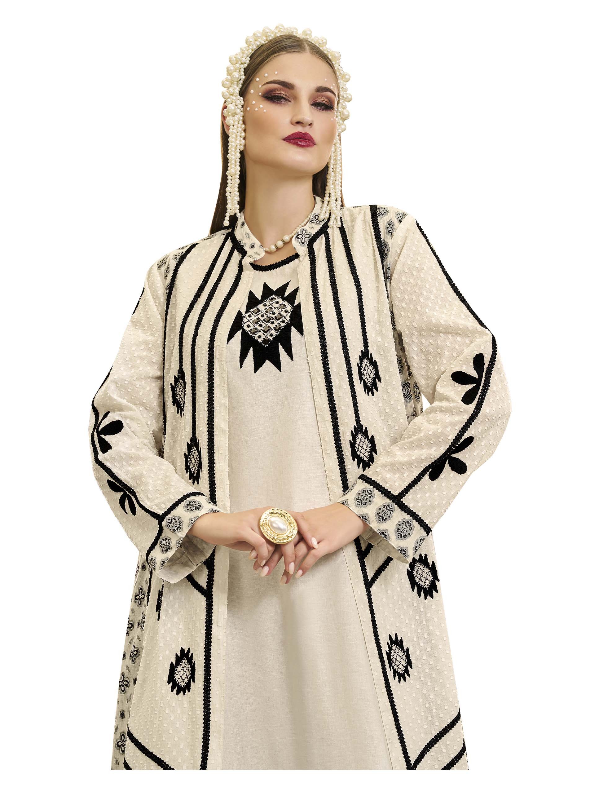 اذا كنتي من محبين اللون الرمادي الفاتح، تعتبر هذه الجلابية الاختيار الأمثل لك، فهي مصممة بنقش اسود وأكمام مميزة لاطلالة أنيقة وملفتة في رمضان.