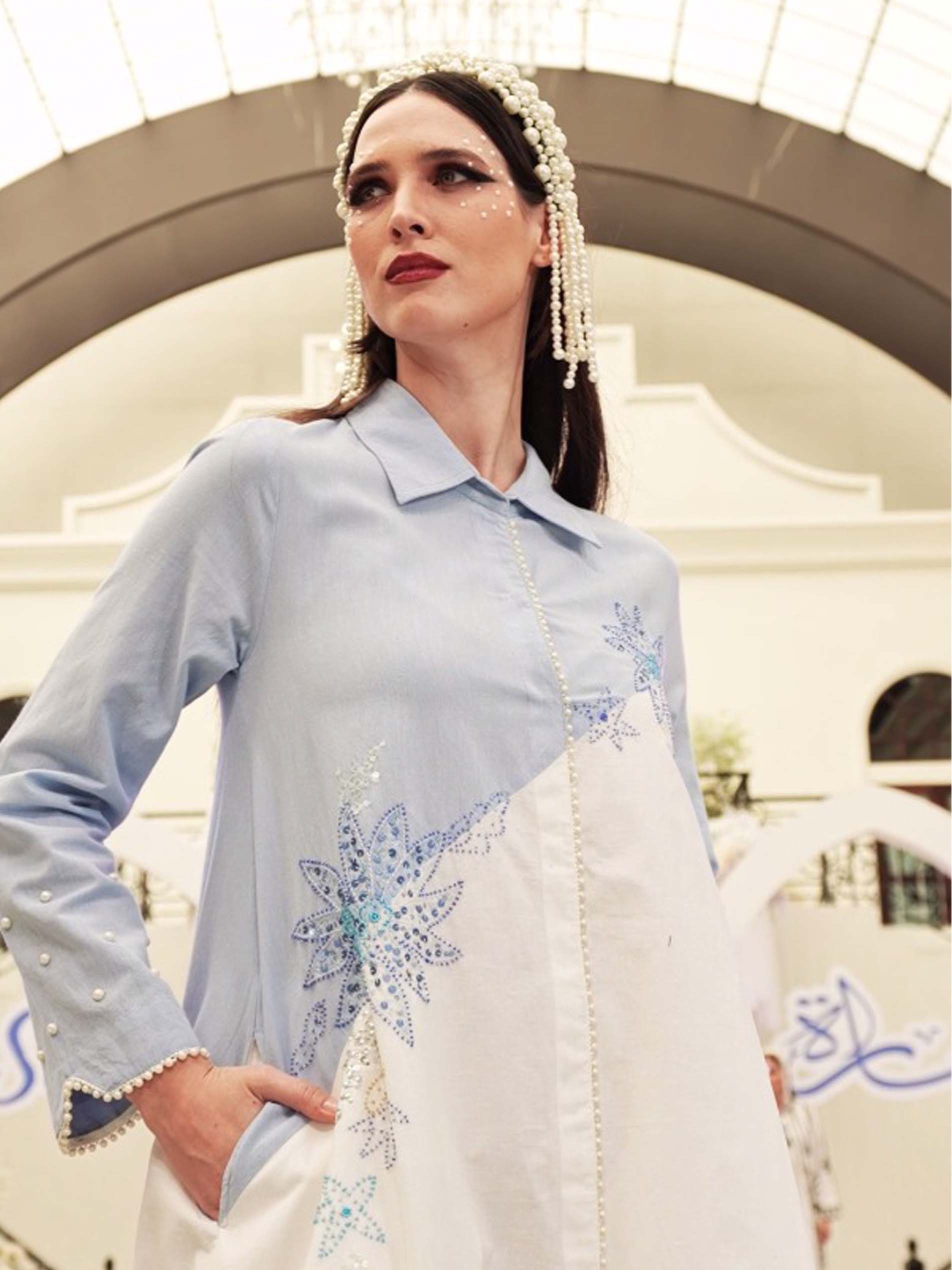 جلابية بتصميم بسيط مصنوعة من القطن باللونين الأزرق والأبيض مع تطريز بسيط على شكل نقشة الأزهار لاطلالة فريدة من نوعها في الحفلات والمناسبات.