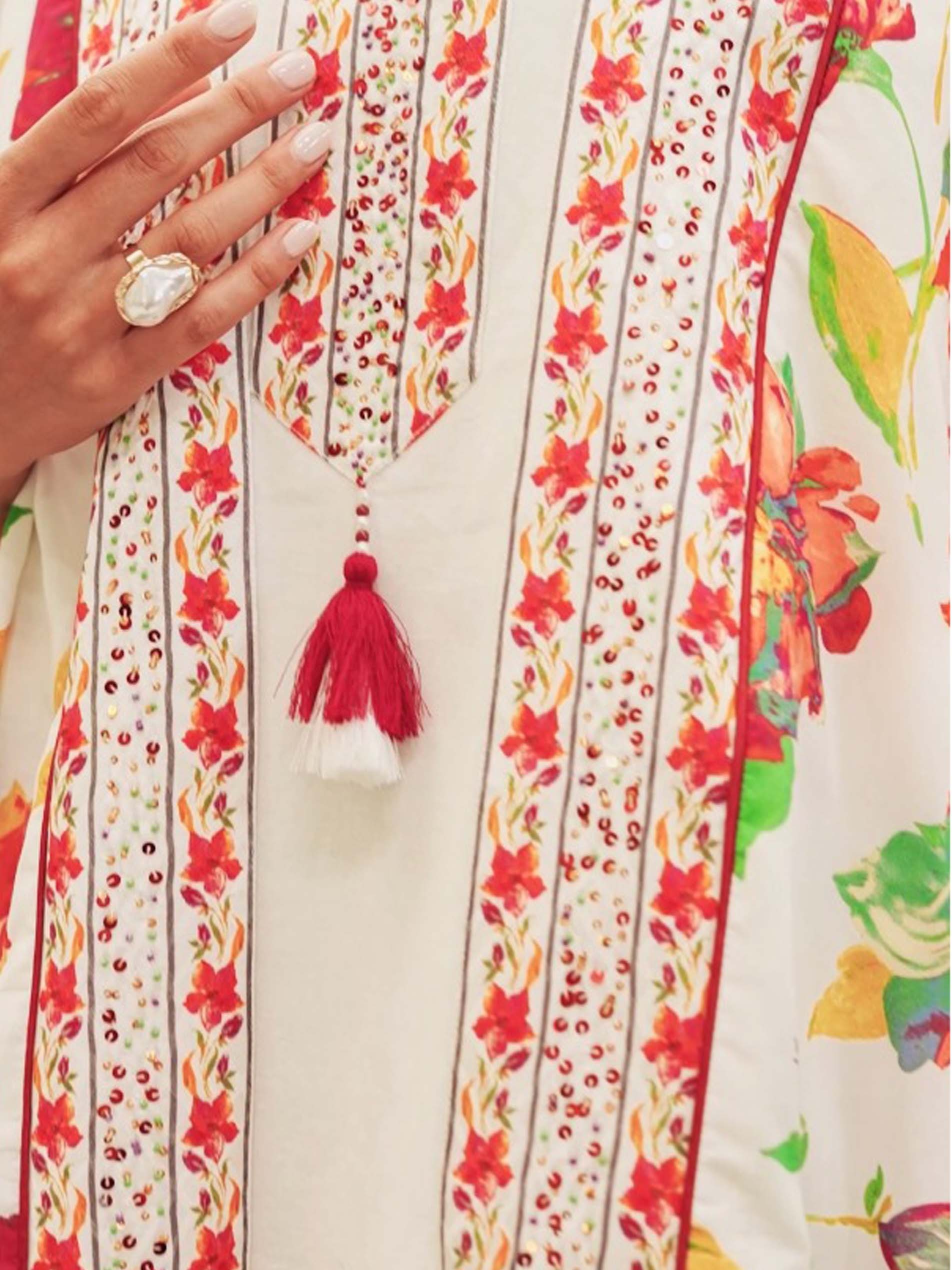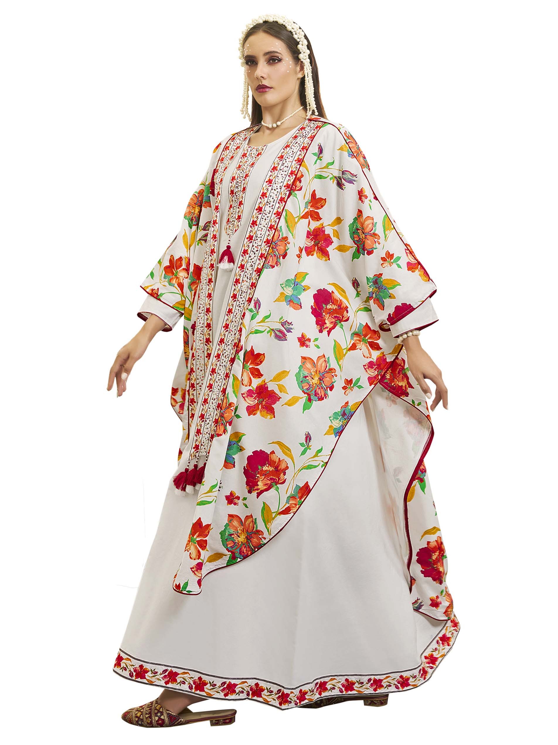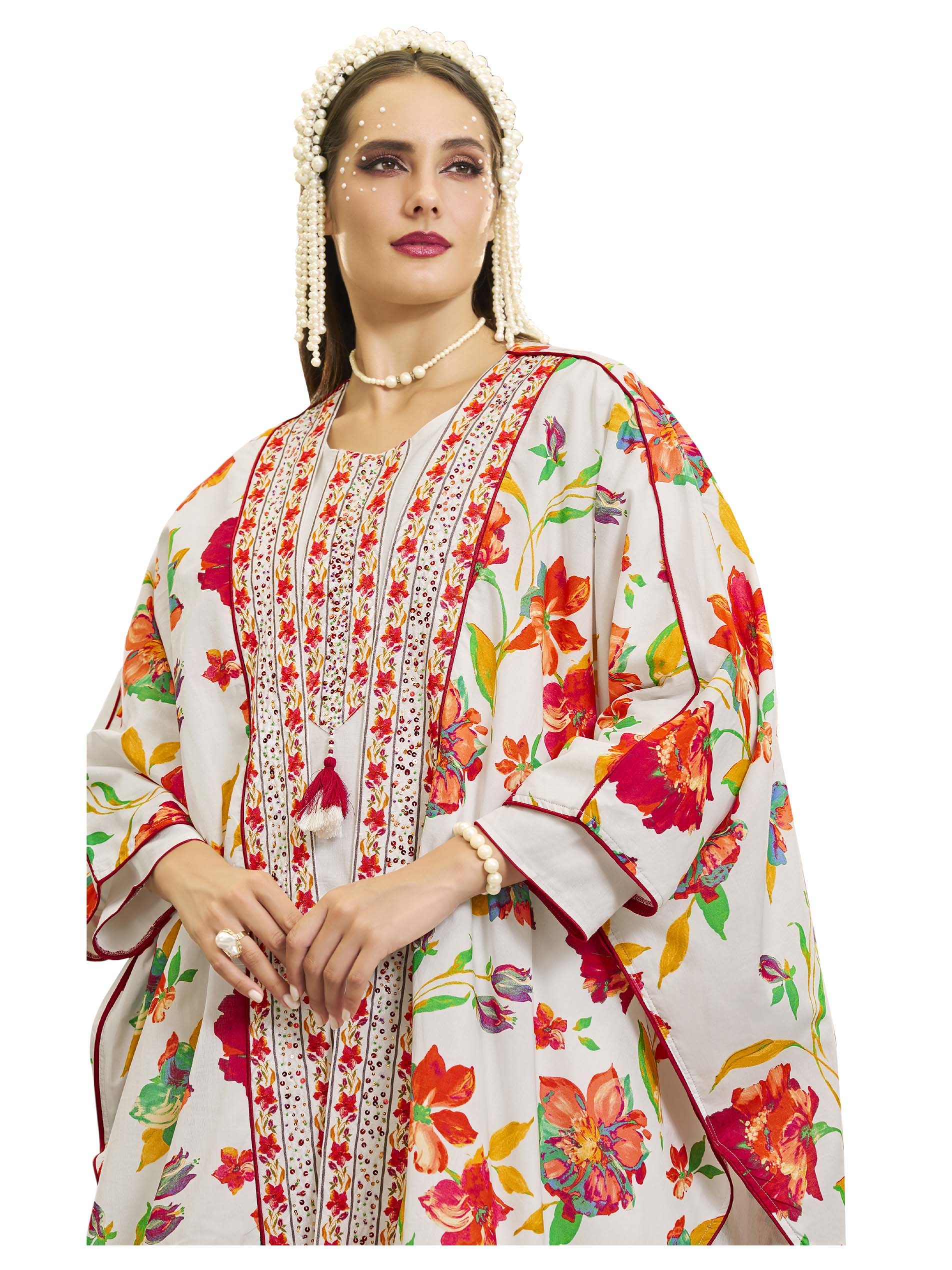 جلابية بيضاء بتصميم عصري، مصنوعة من القطن بنقشة الزهور الملونة باللونين الوردي والبرتقالي ويضفي عليها لمسة من اللون الأصفر مع أكمام طويلة وتطريز على الصدر.