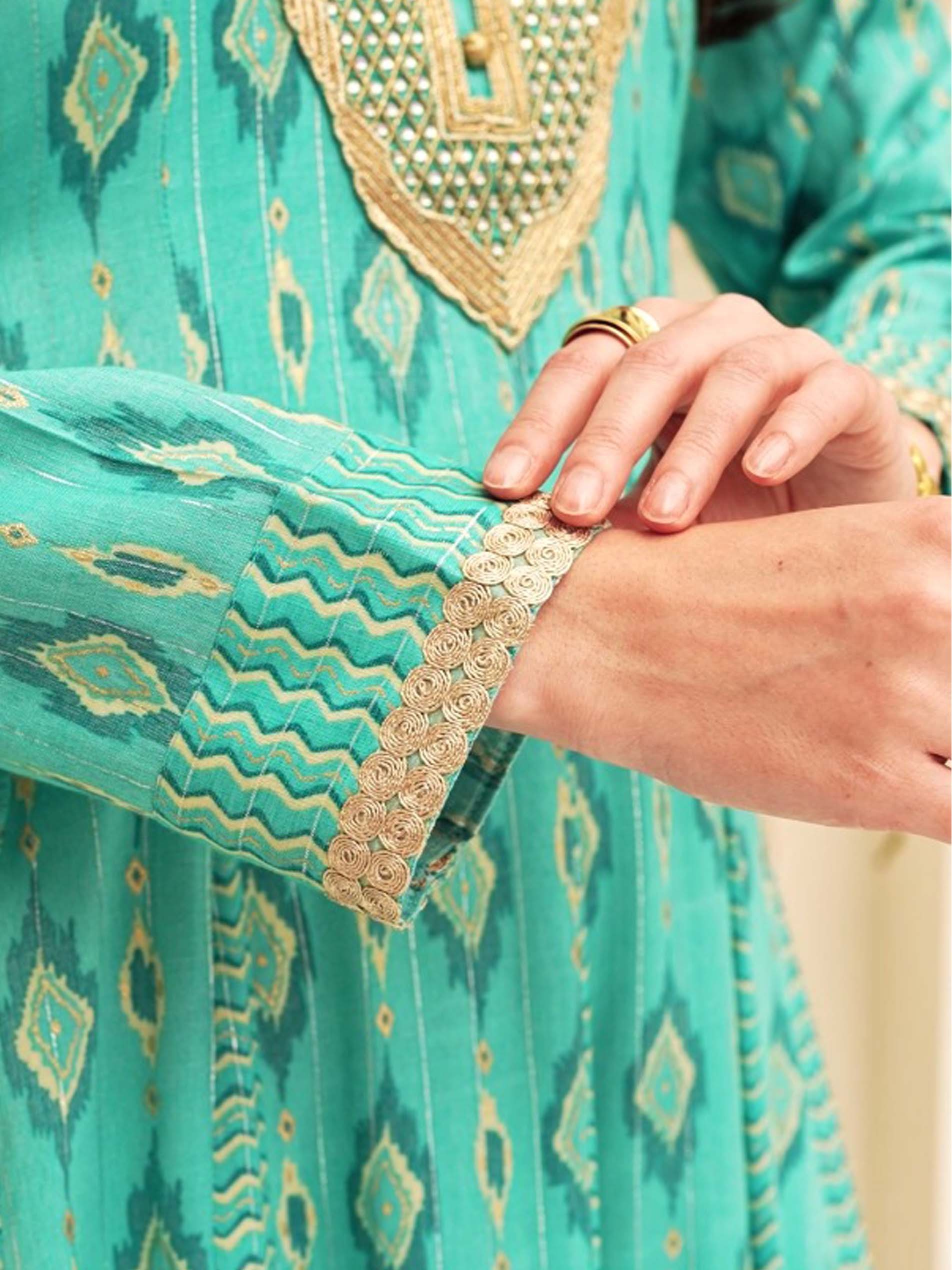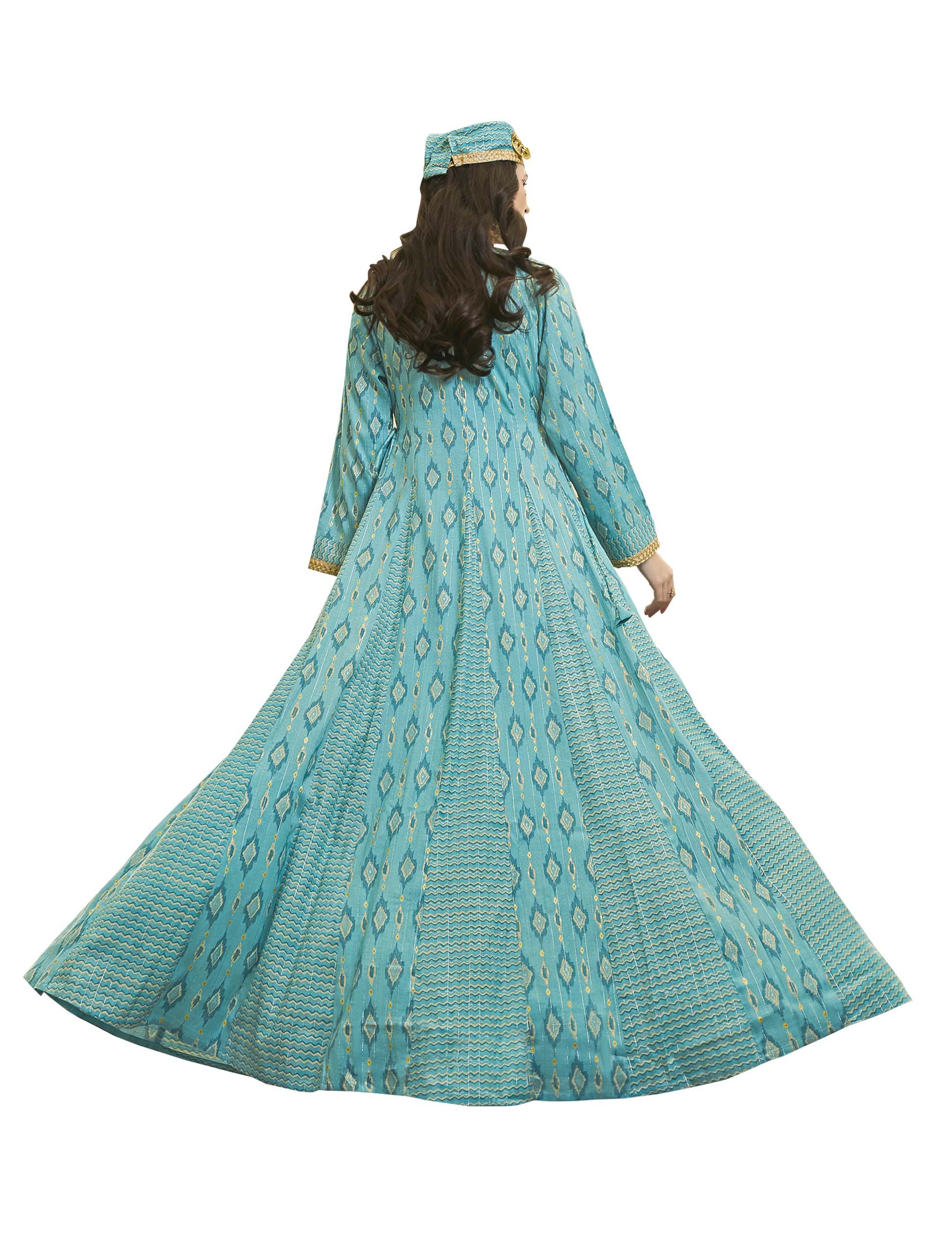 جلابية ماكسي طويلة من سارة زرقاء اللون، مصممة بنقوش متعرجة ومتداخلة مع نقوش الايكات لاطلالة مثالية في المناسبات.