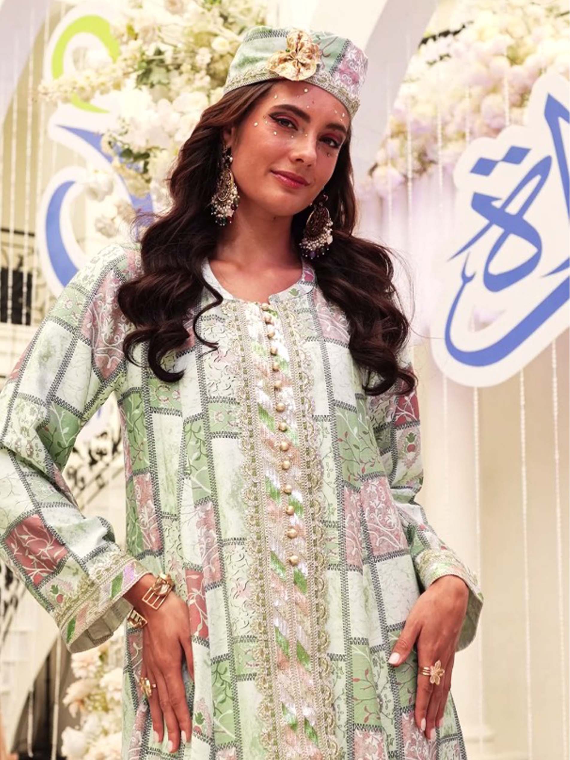 تألقي في جلابية قطنية بنقشة مربعات، مصممة باللونين الأخضر والزهري مع أكمام طويلة وأزرار أمامية على الصدر.