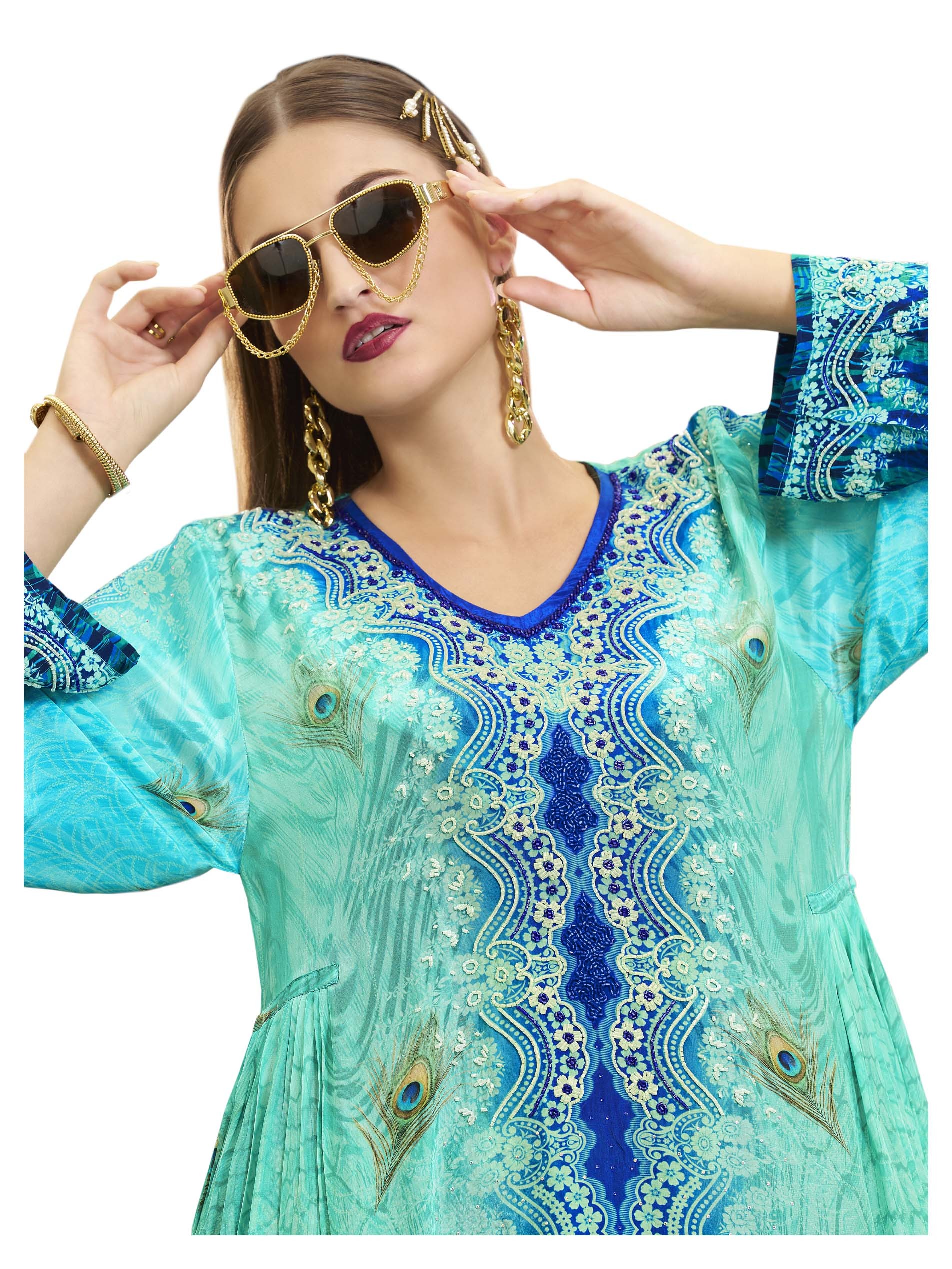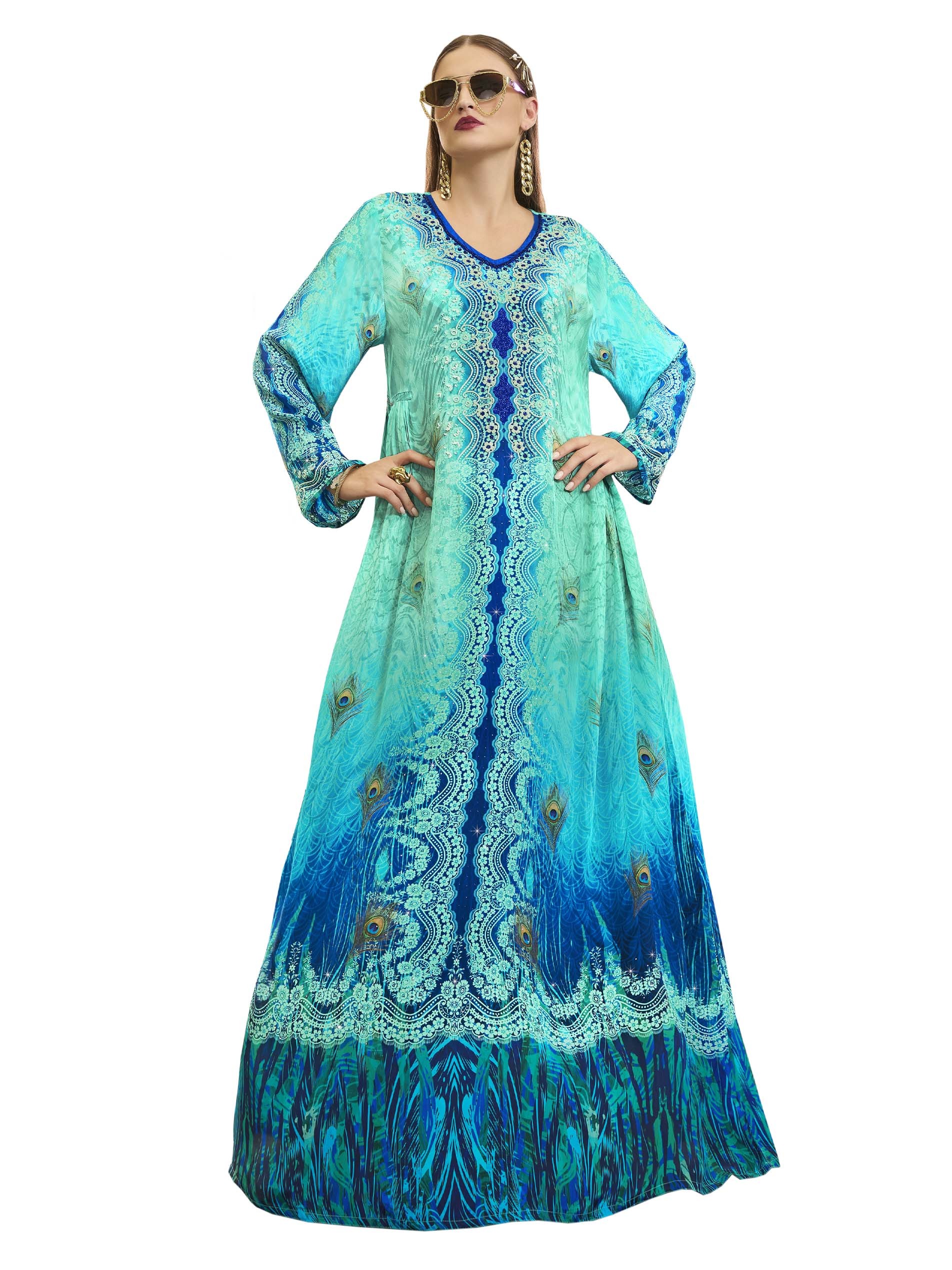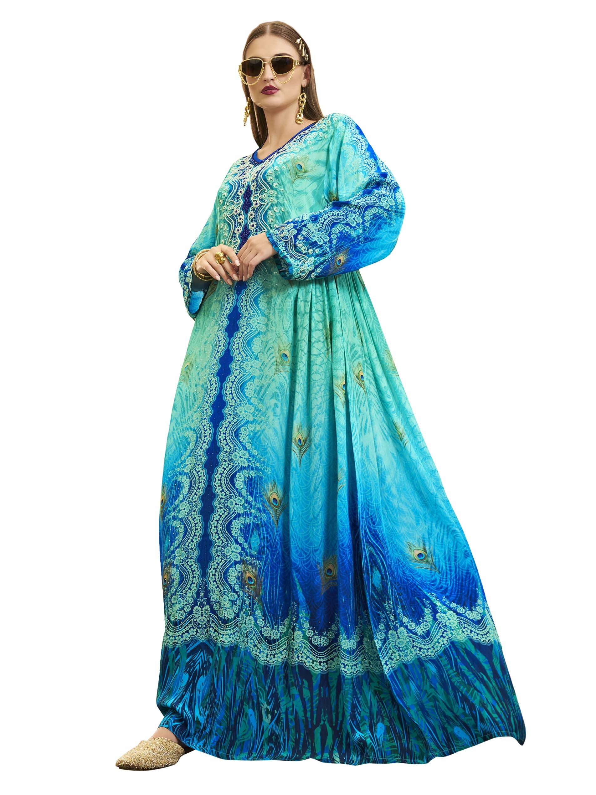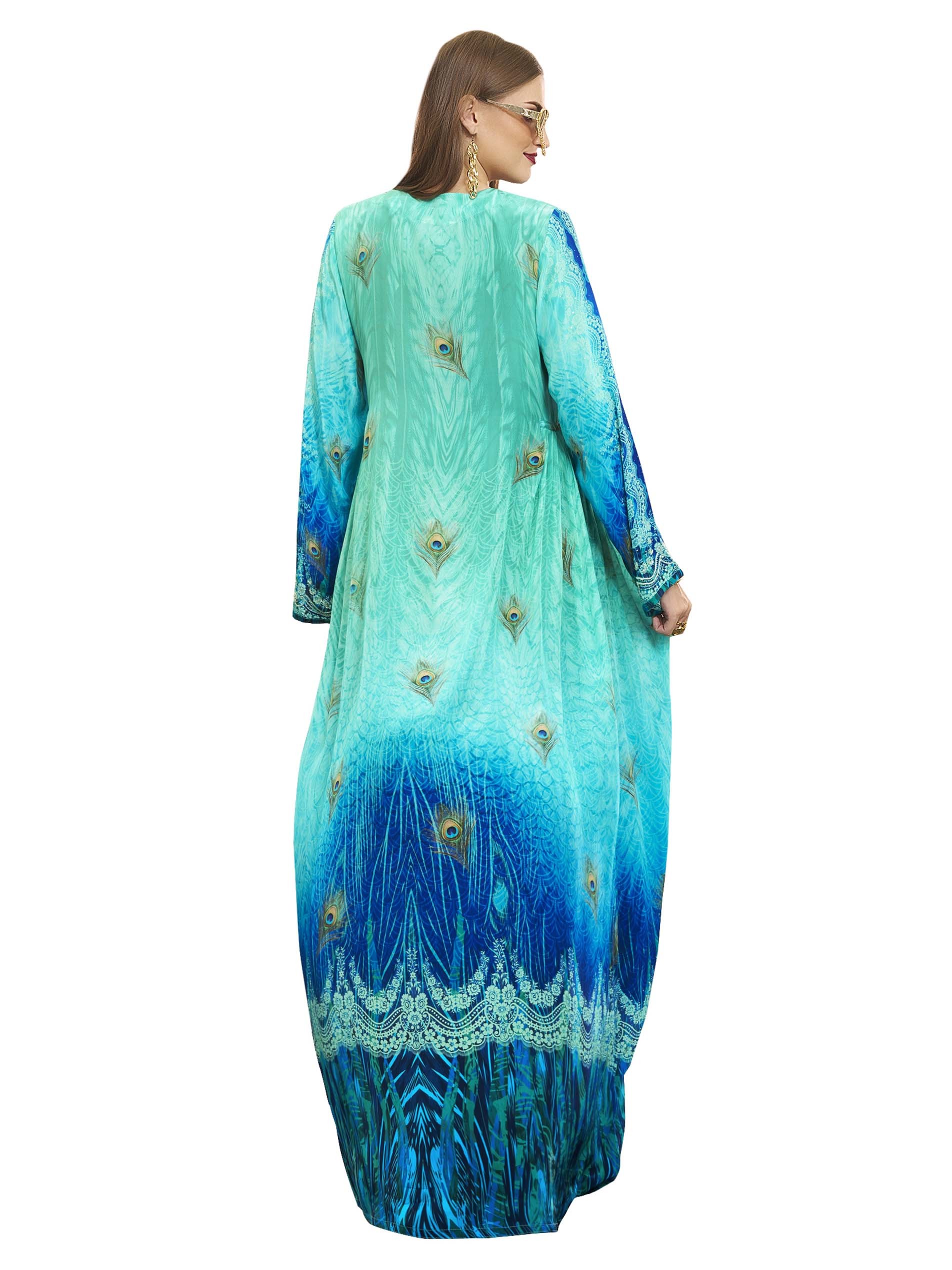 اذا كنتي من محبي اللون الأزرق، تعتبر هذه الجلابية الاختيار الأمثل لك، فهي مصممة من القطن بطبعات مميزة وملونة بدرجات اللون الأزرق الفاتح والغامق. ويكتمل التصميم بنقشة الزهور البيضاء مع أكمام طويلة لاطلالة راقية في المناسبات.