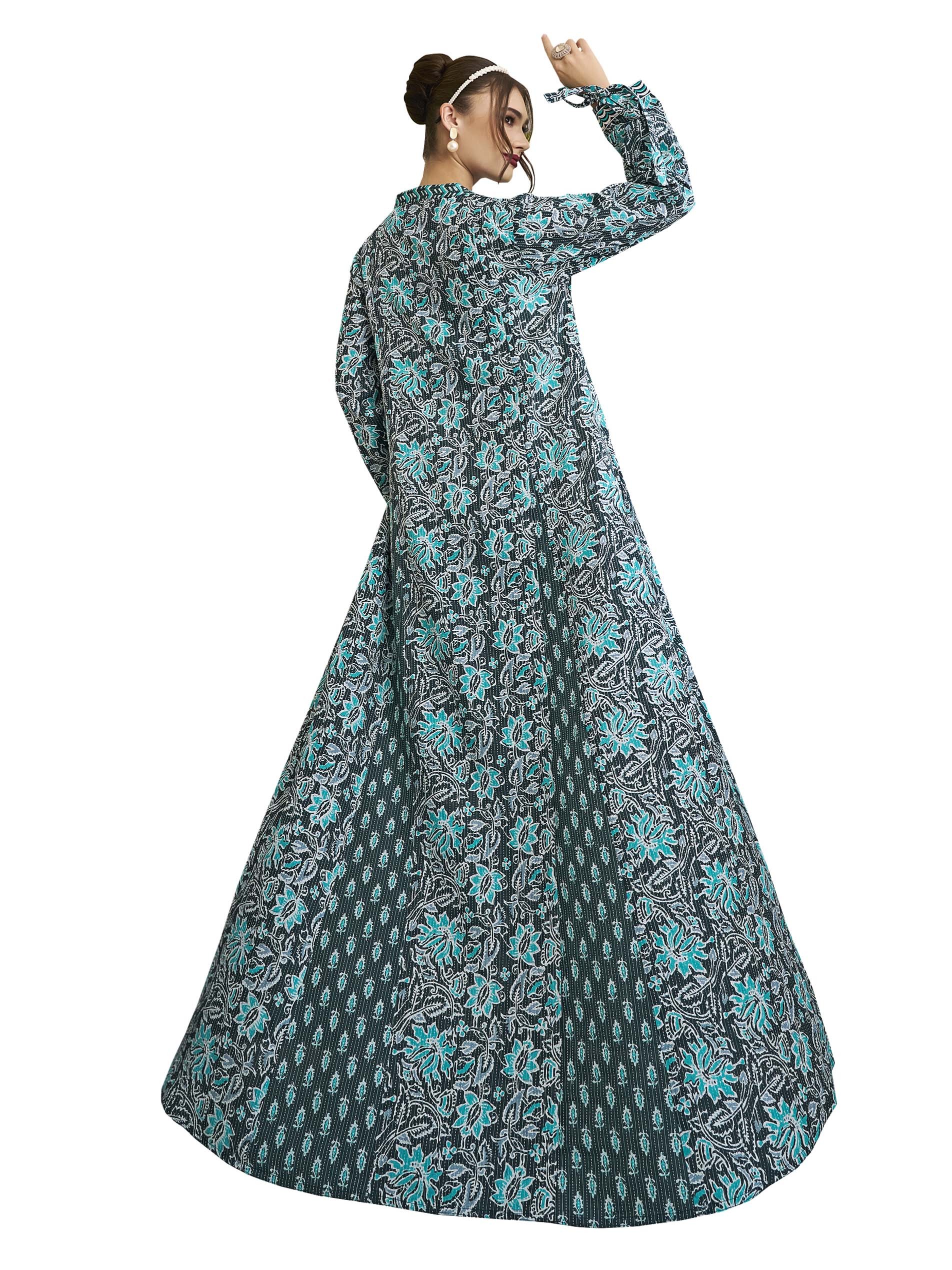 جلابية ماكسي طويلة من القطن، مصممة باللونين الأزرق والكحلي مع نقشة الزهور وتطريز على الصدر مرصع بالكريستال لاطلالة فريدة من نوعها في المناسبات.