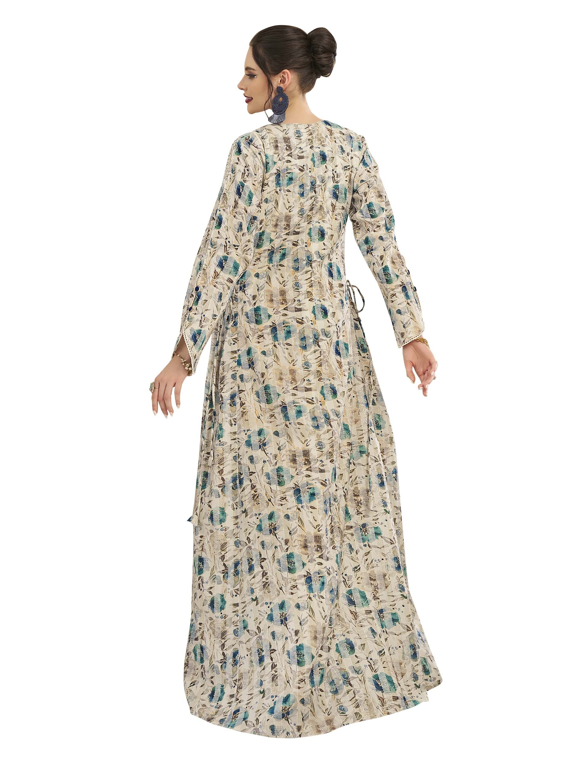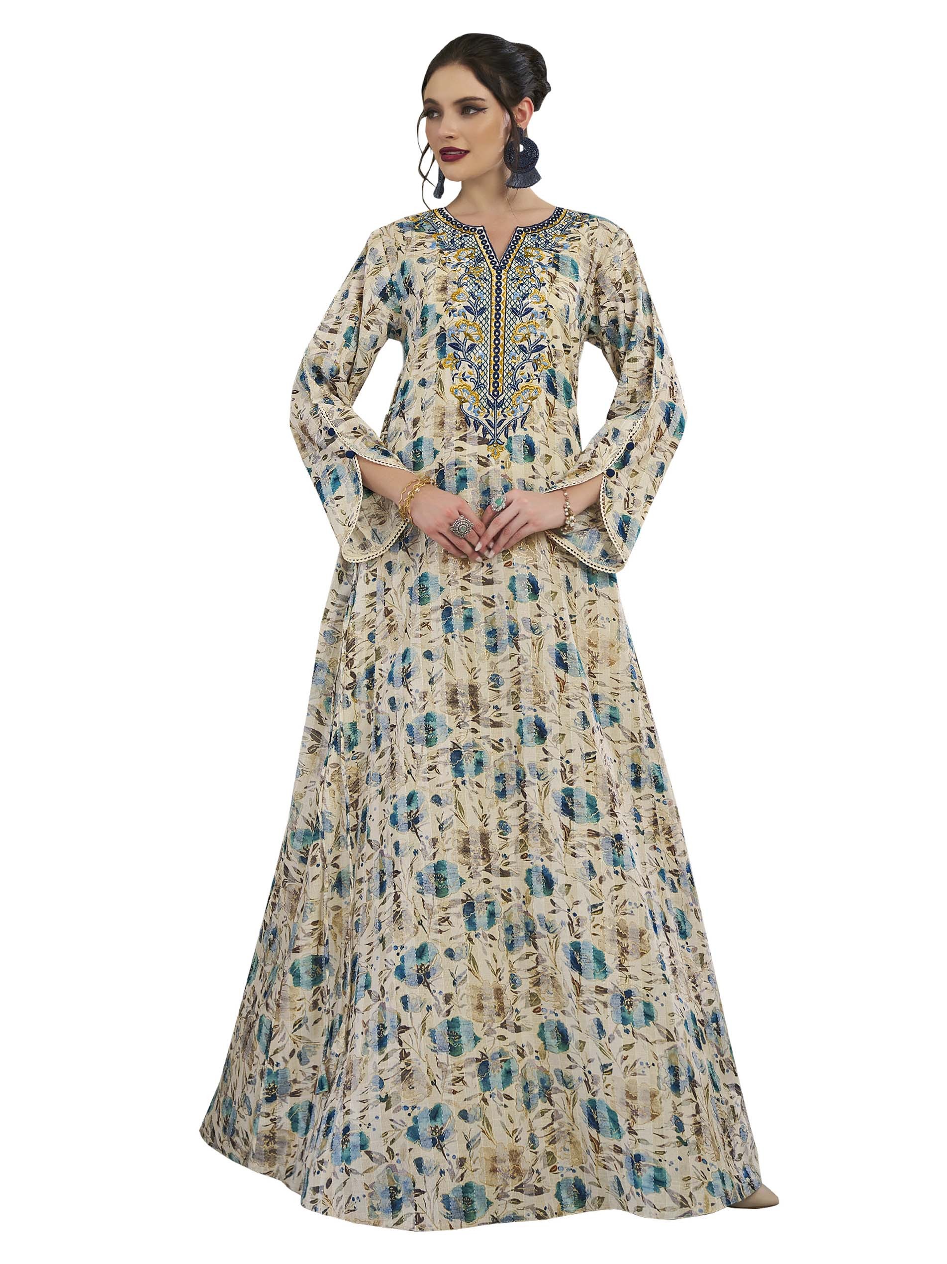 لابراز أنوثتك يجب أن تضيفي هذه القطعة الفنية الى خزانتك! صممت من القطن بنقشة الأزهار باللونين الأزرق والرمادي مع أكمام طويلة ونقشة على الصدر باللونين الأزرق والذهبي لاطلالة فريدة من نوعها في المناسبات.