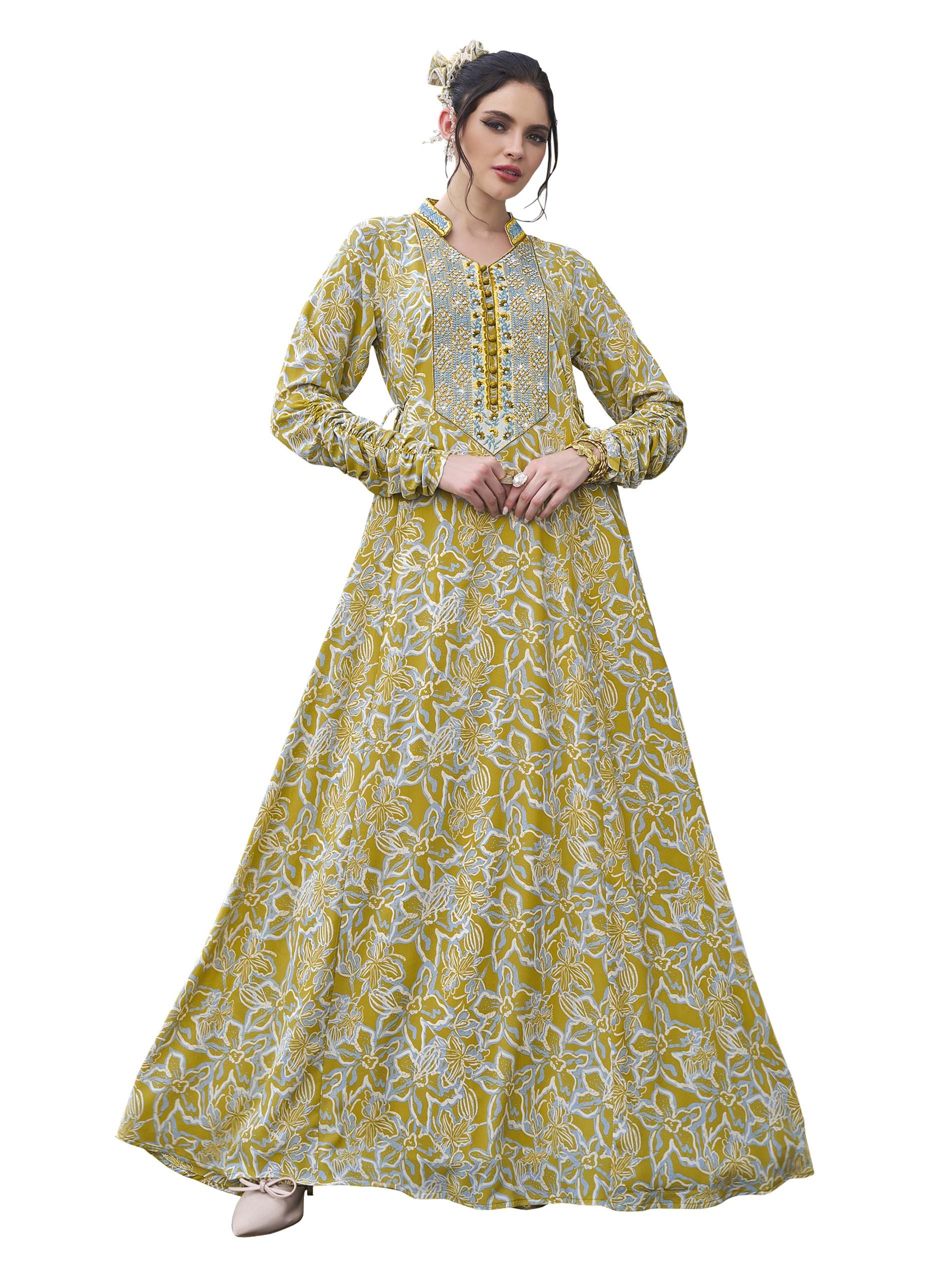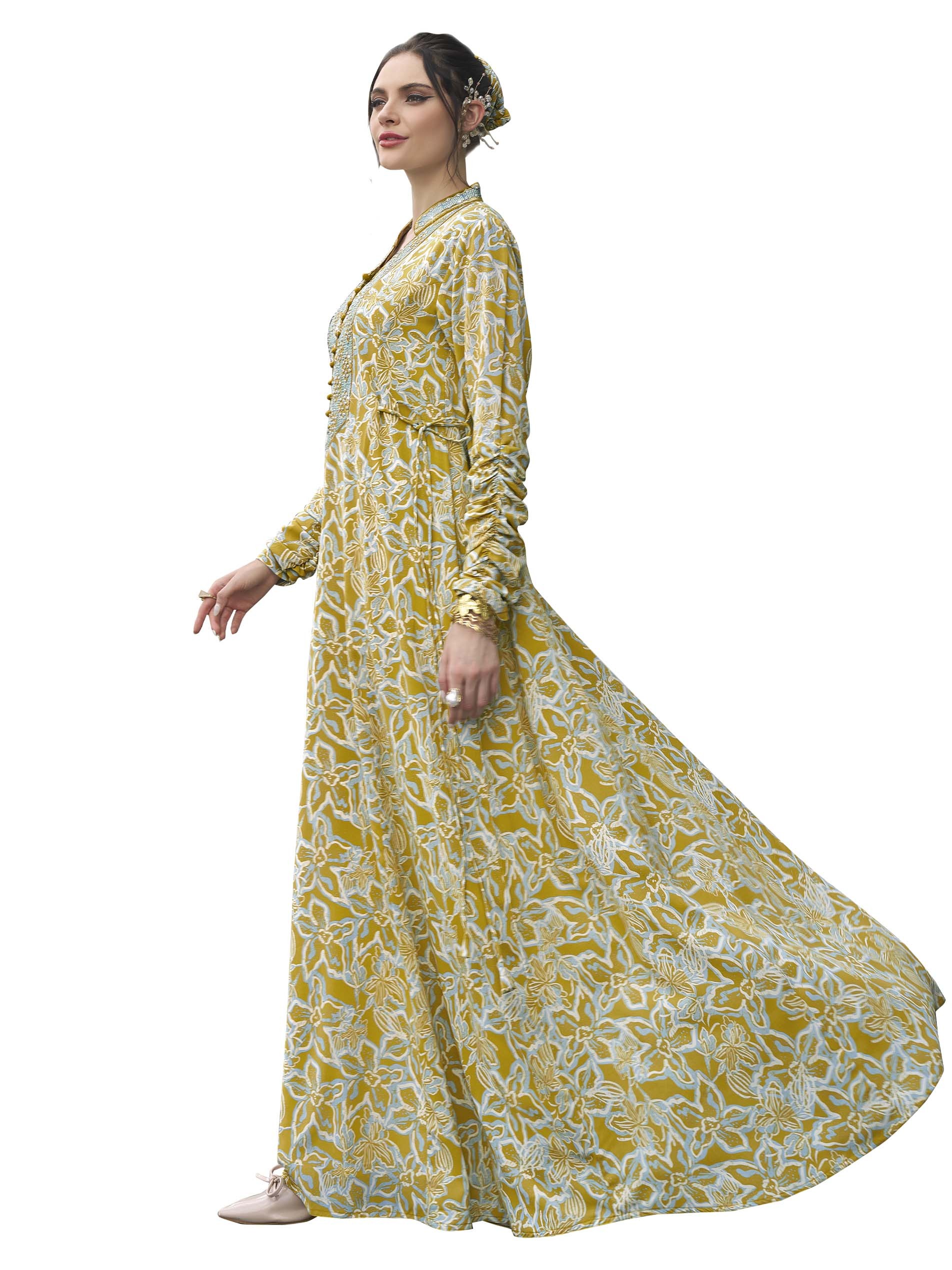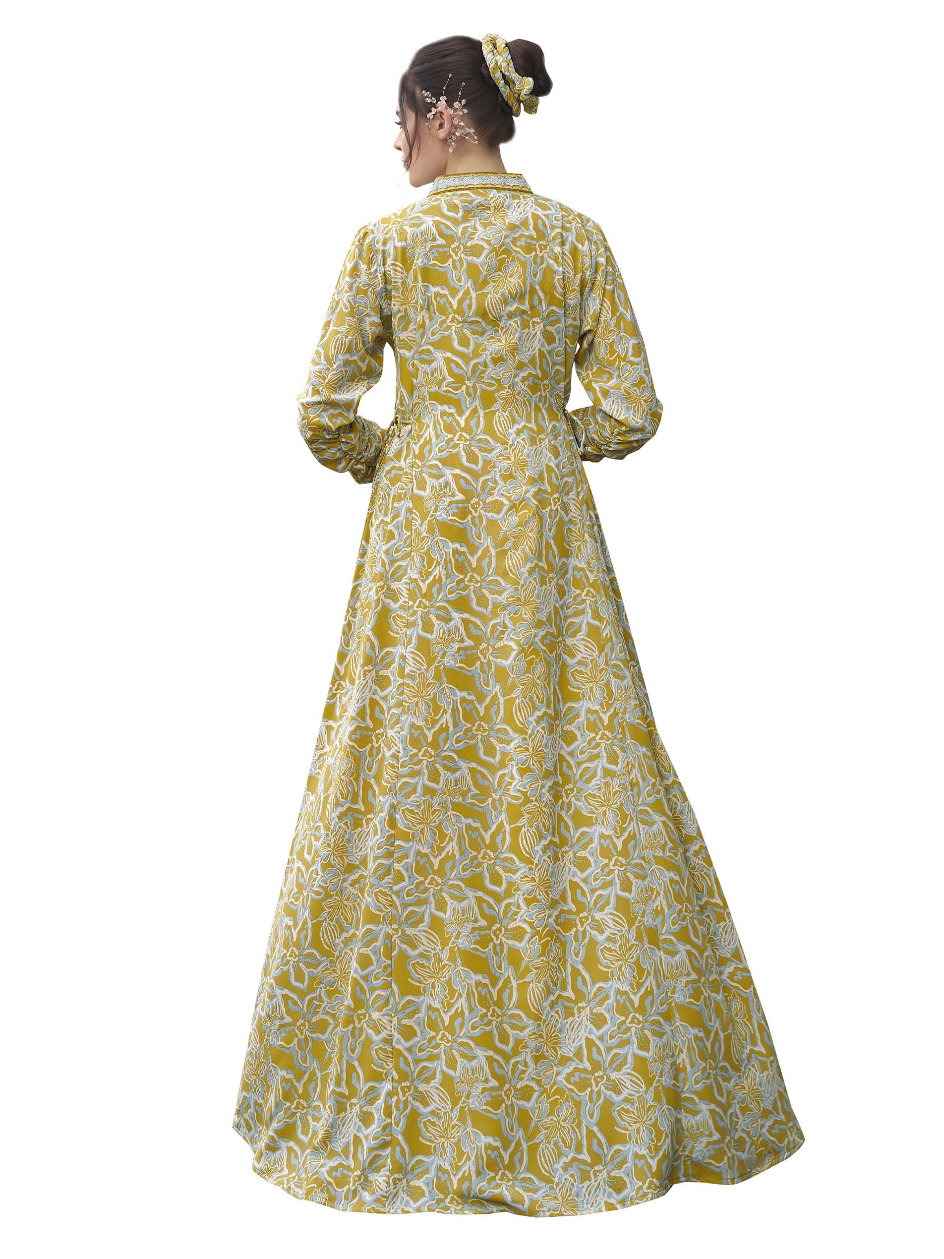 جلابية قطنية مصممة بنقشة الزهور باللونين الأصفر والأبيض مع أكمام طويلة، نقشة على الصدر وأزرار أمامية لاطلالة ساحرة في المناسبات.