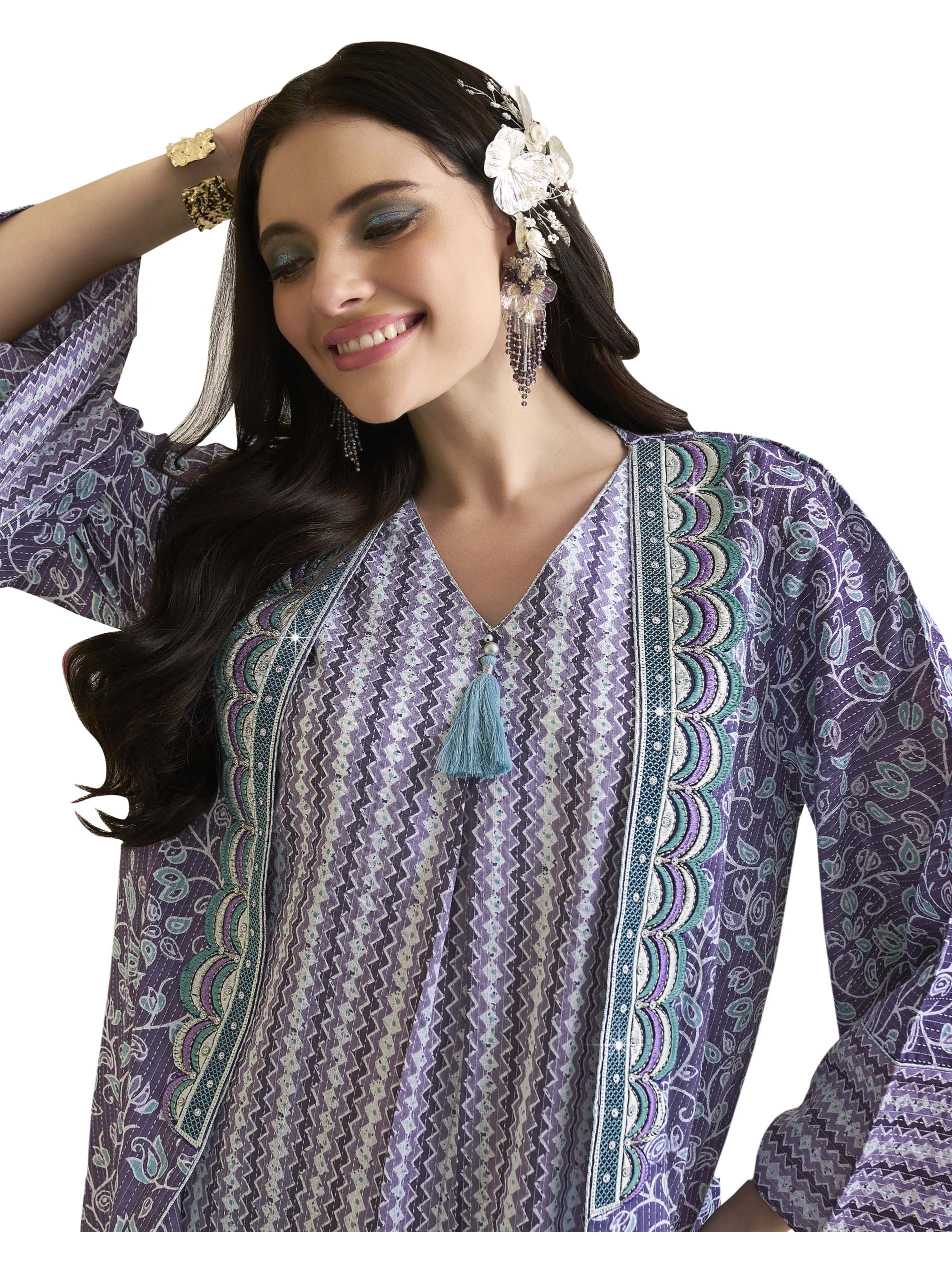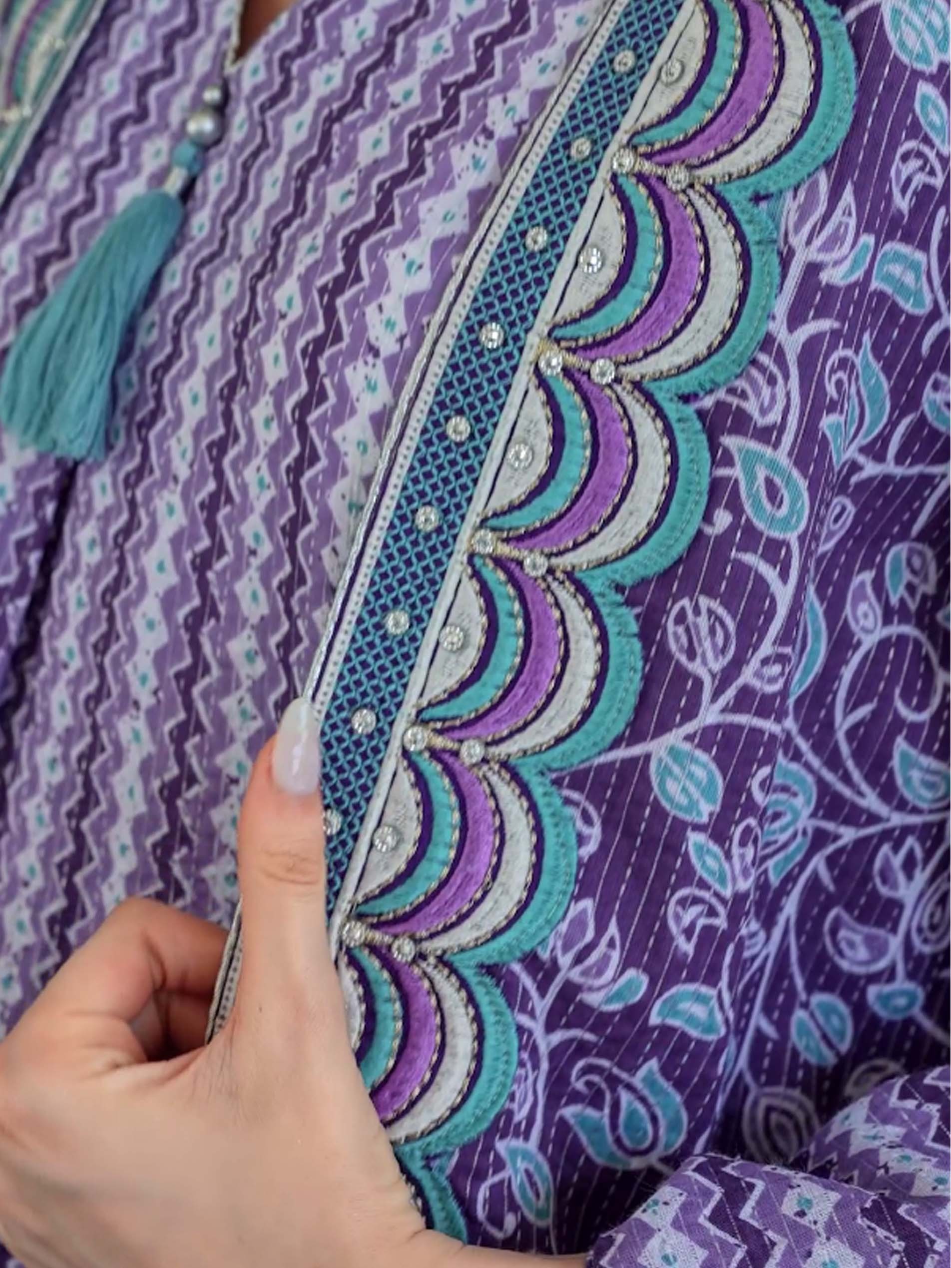 اذا كنتي من محبي اللون الأزرق، فهذه الجلابية تعتبر الاختيار الأمثل لك، فهي مصممة من القطن بنقوشات فريدة من نوعها ، ويضفي عليها اللون الأبيض لاطلالة رائعة في الحفلات والمناسبات.