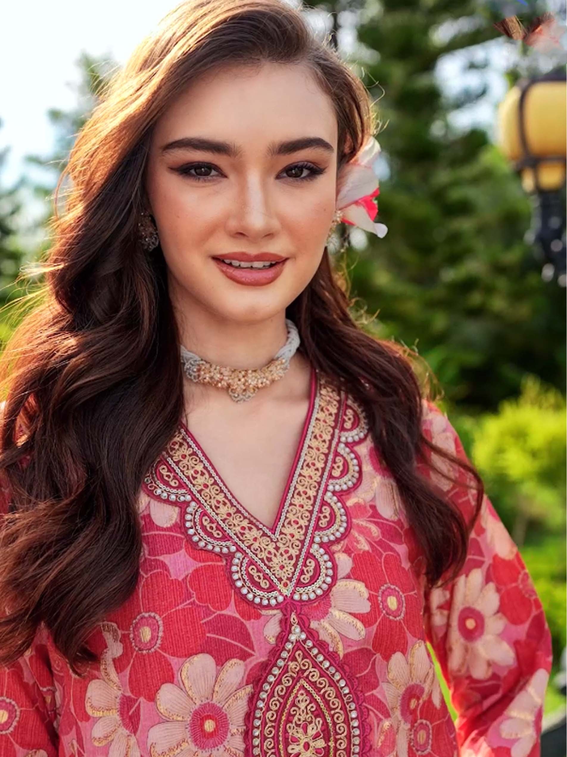 اذا كنتي من محبي اللون الوردي، فتعتبر هذه الجلابية الاختيار الأمثل لك، فهي مصممة من قماش الكريب الناعم بنقشة الأزهار. ويكتمل التصميم بتطريز رائع على الصدر مرصع بكريستال أبيض مع اللون الذهبي الرائع .
