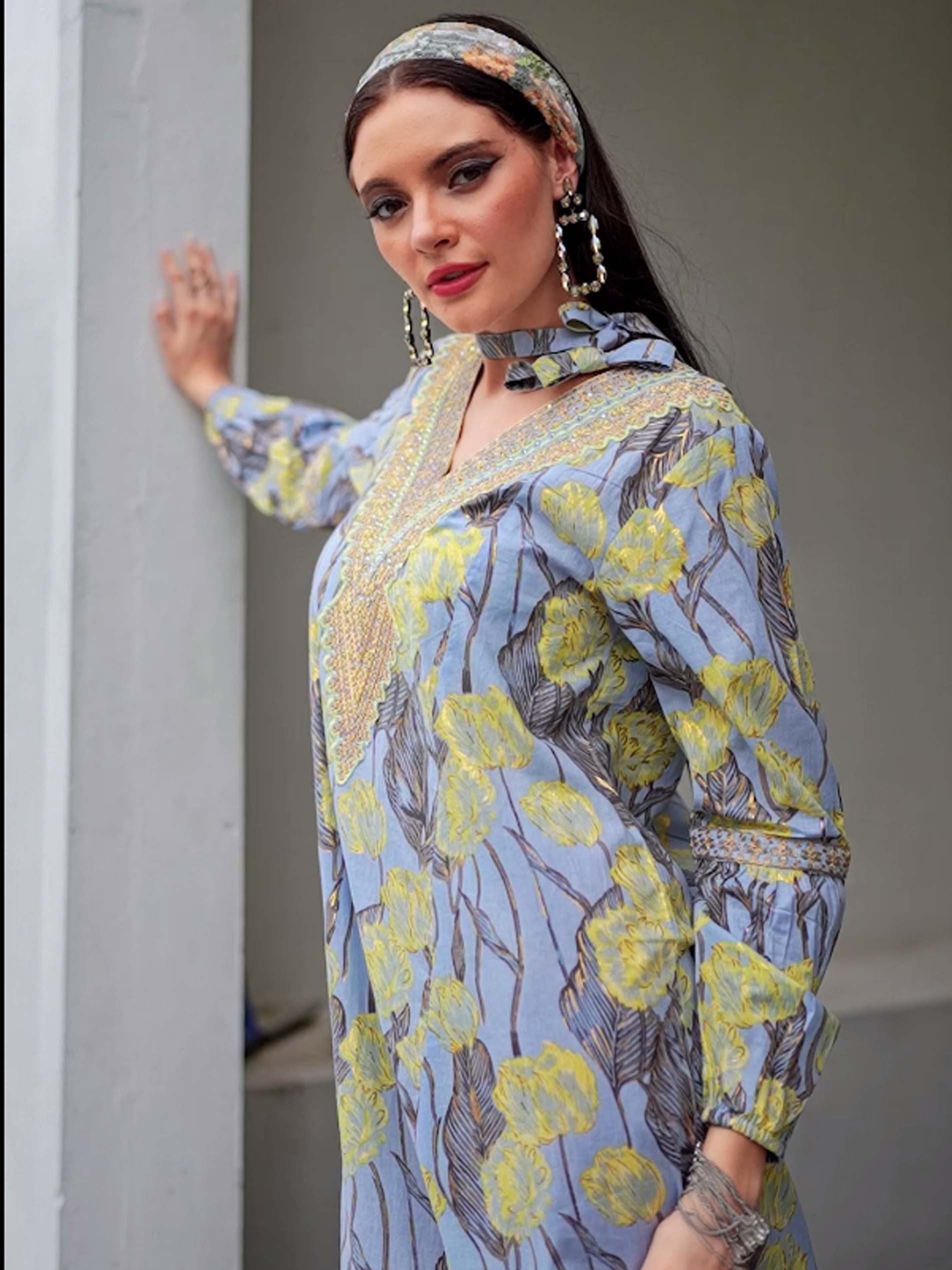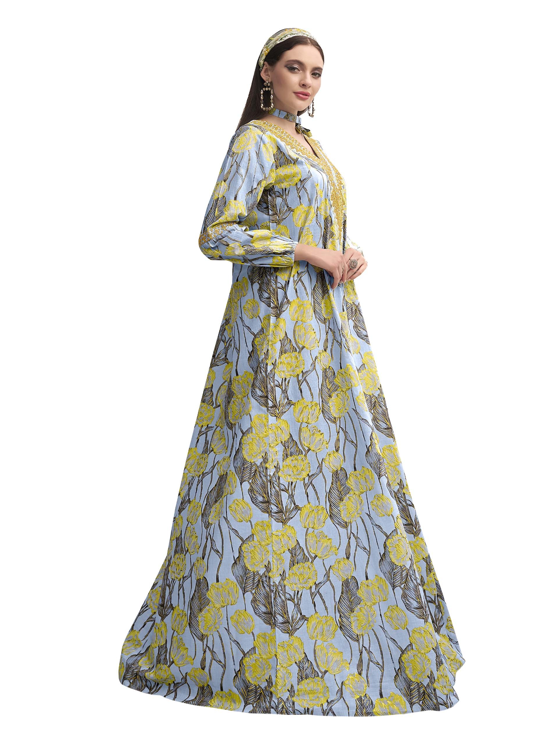 جلابية من القطن باللون الأزرق السماوي مزينة بنقشة الزهور وأوراق الشجر باللونين الأسود والذهبي مع أكمام طويلة وتطريز على الصدر.