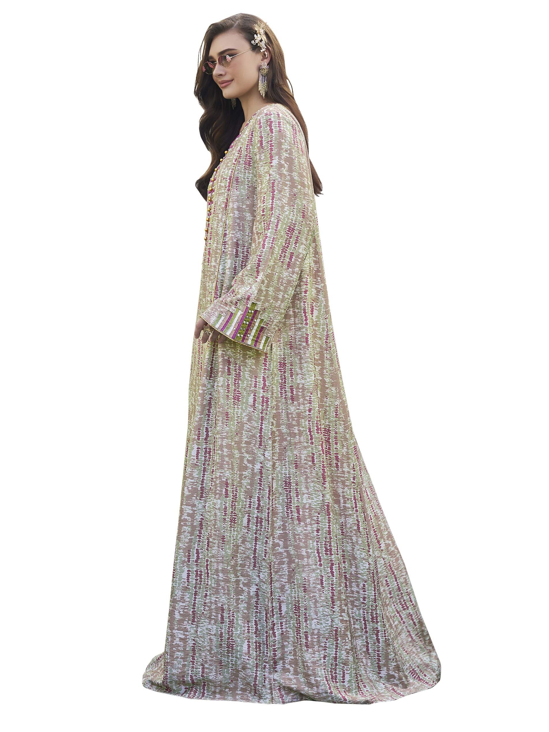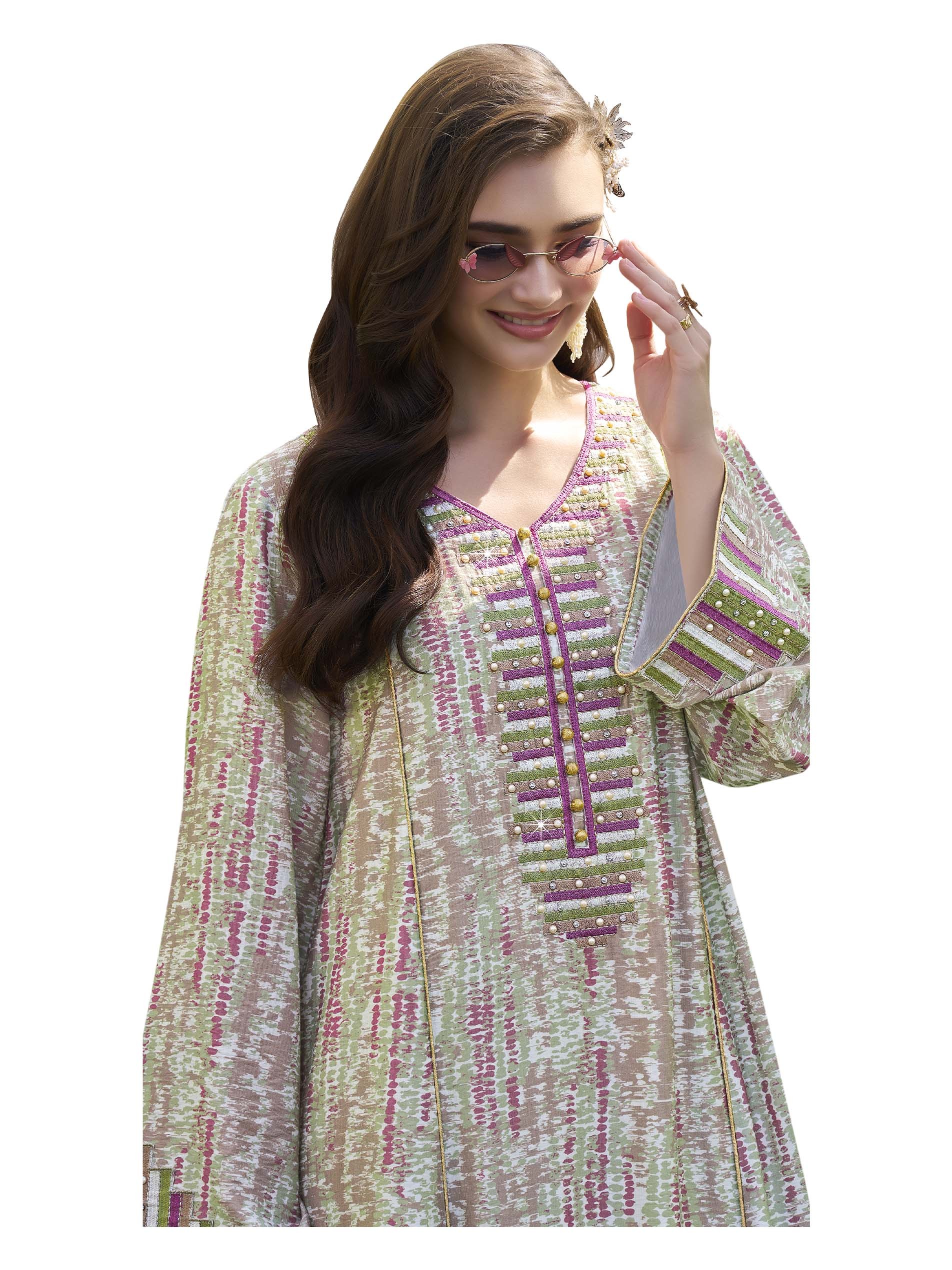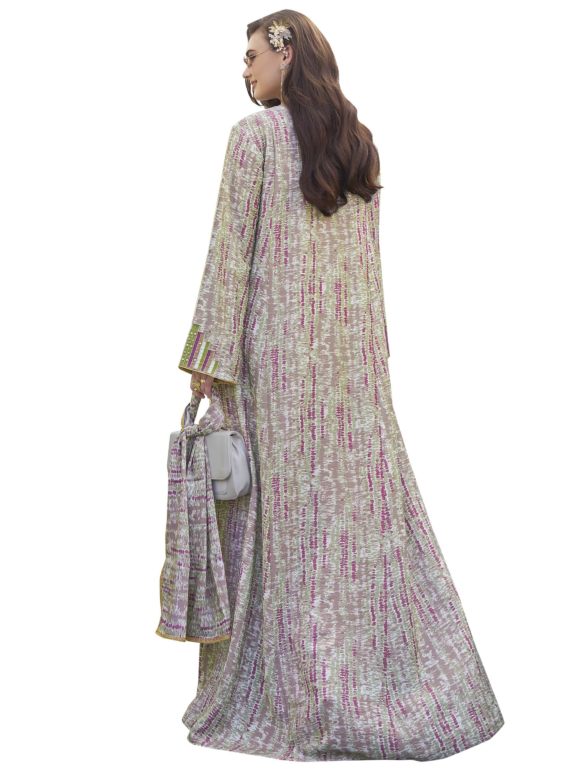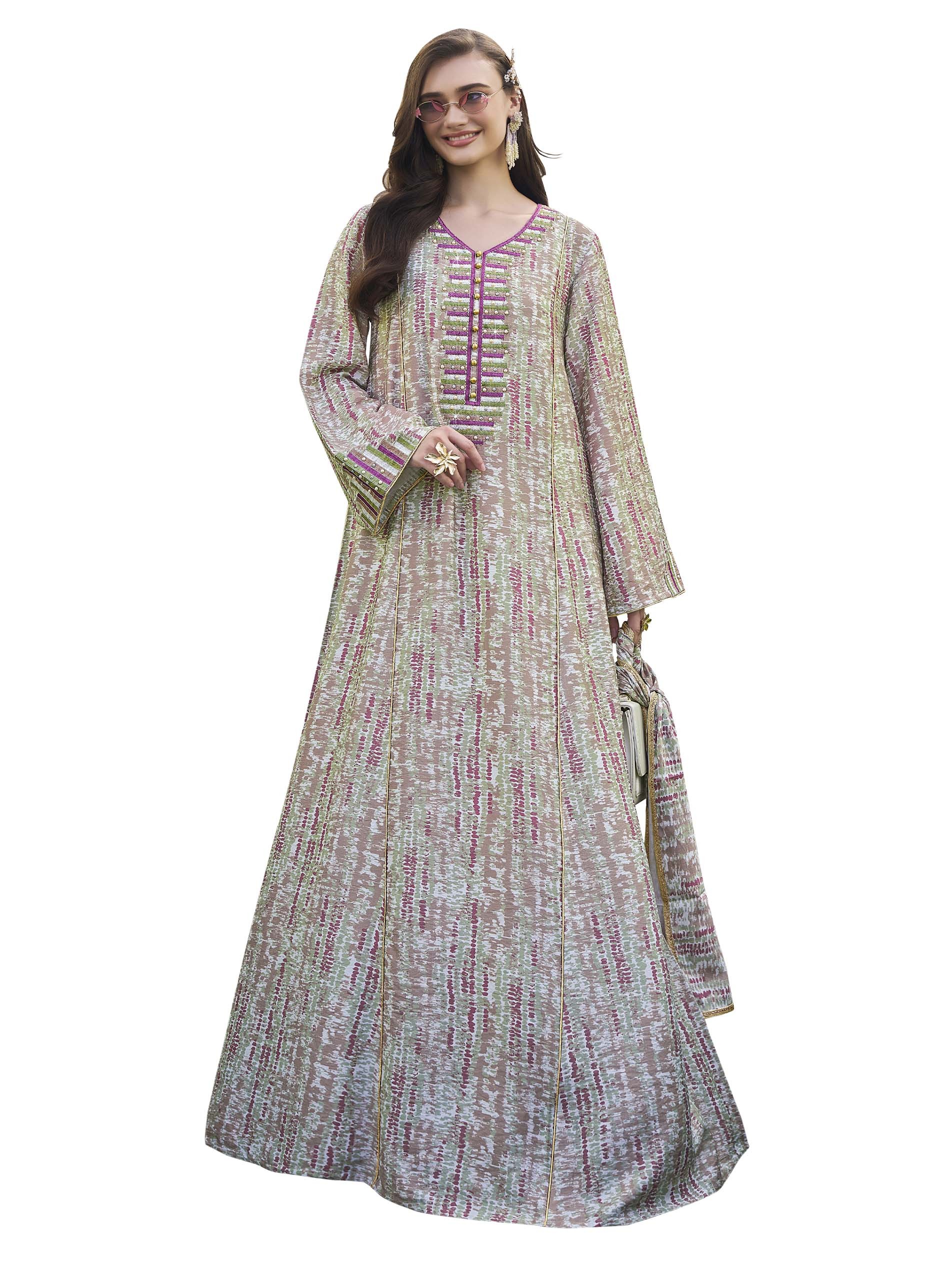 جلابية من القطن بتصميم رائع ومختلف مع أكمام طويلة وتطريز على الصدر باللونين الأخضر والبنفسجي مع أزرار أمامية ذهبية.