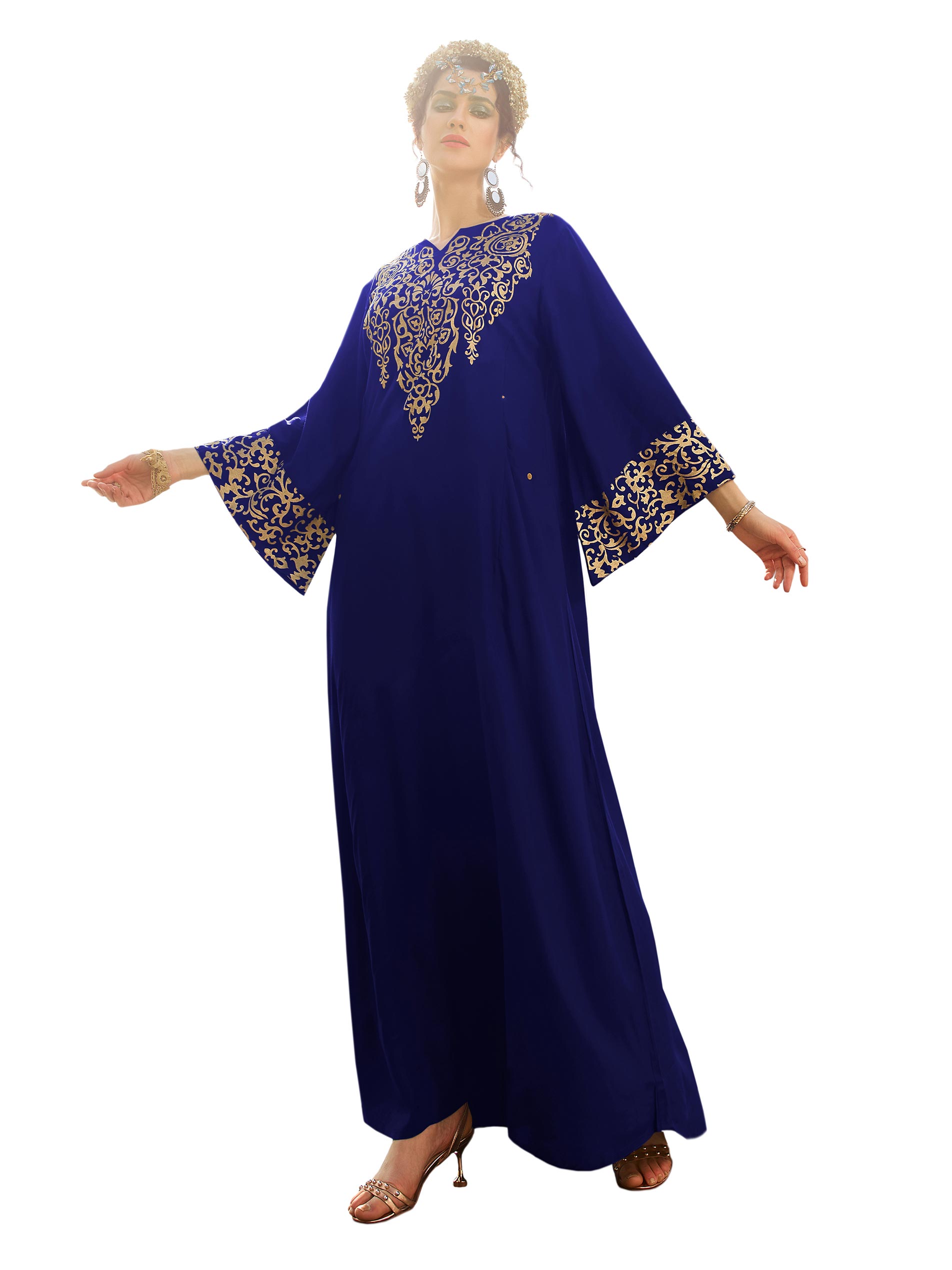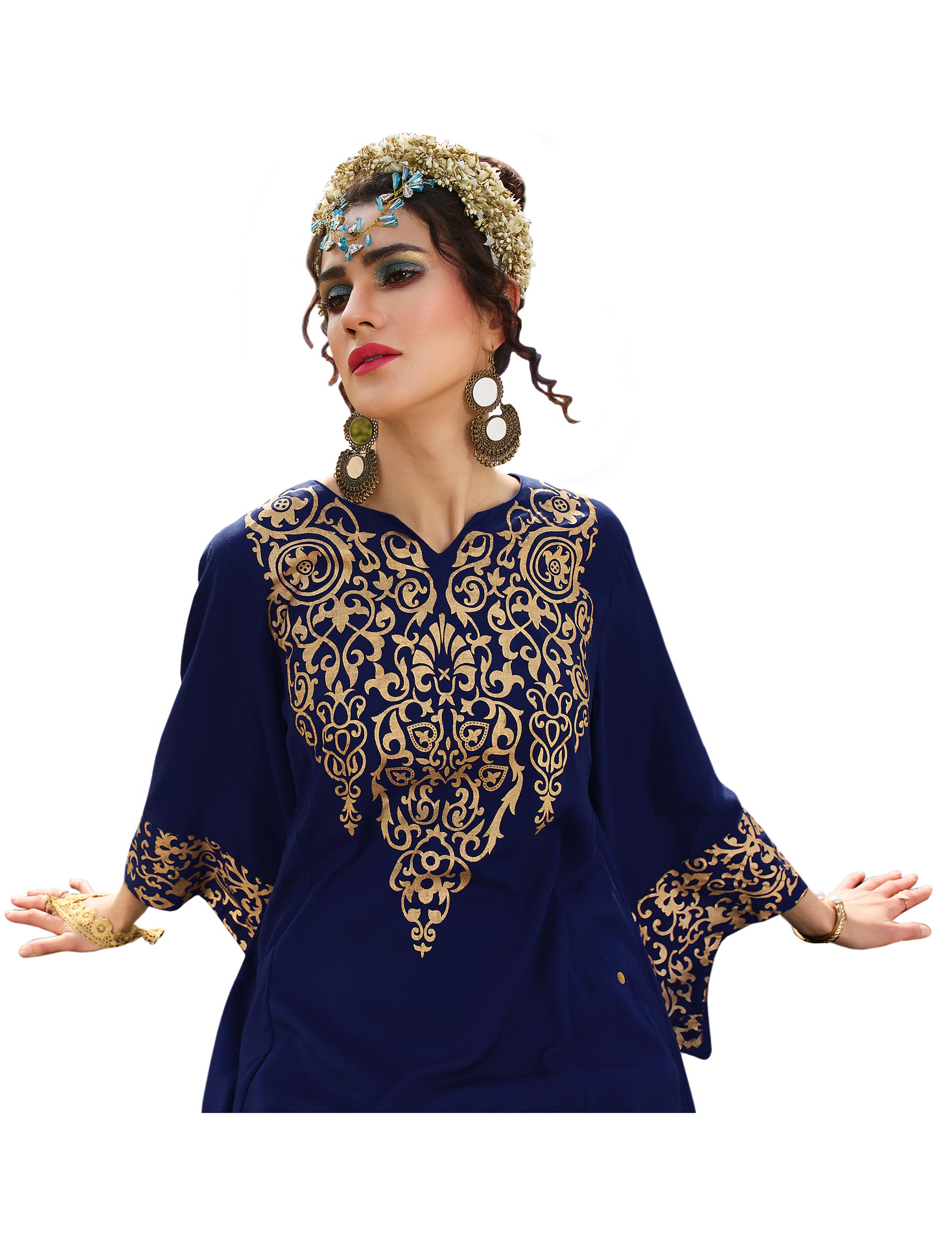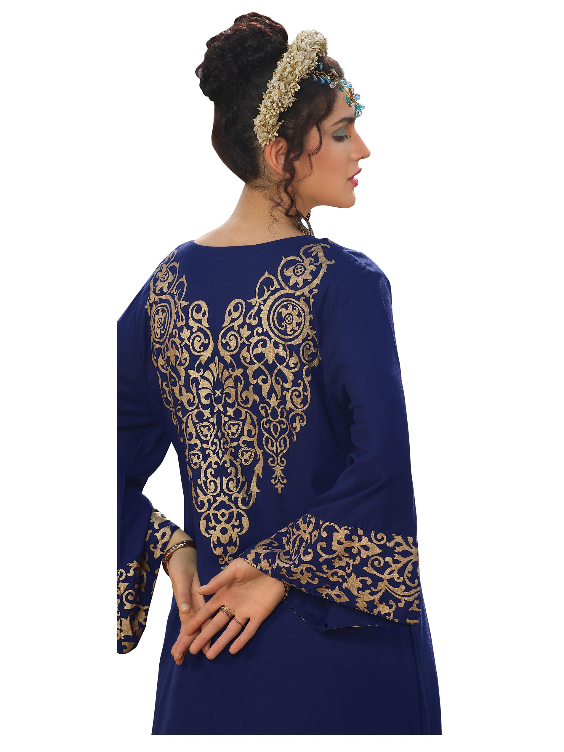 The stunning A-line cut Royal blue full length casual jalabiya daraat/ kaftan is a complete summer charmer. Designed in a scroll print rayon fabric with a smart V neck and fancy sleeves that accentuate the styling, this blue beauty is set to turn heads. It’s just right to feel cool this summer.