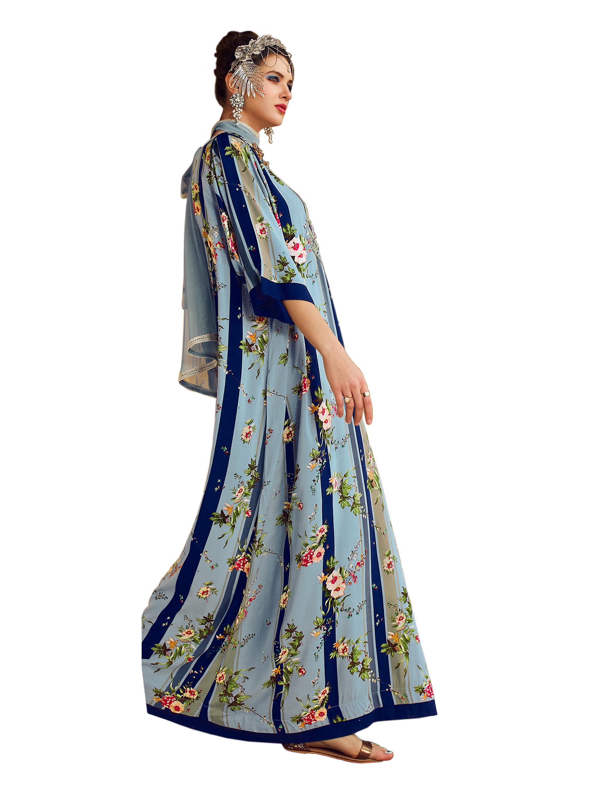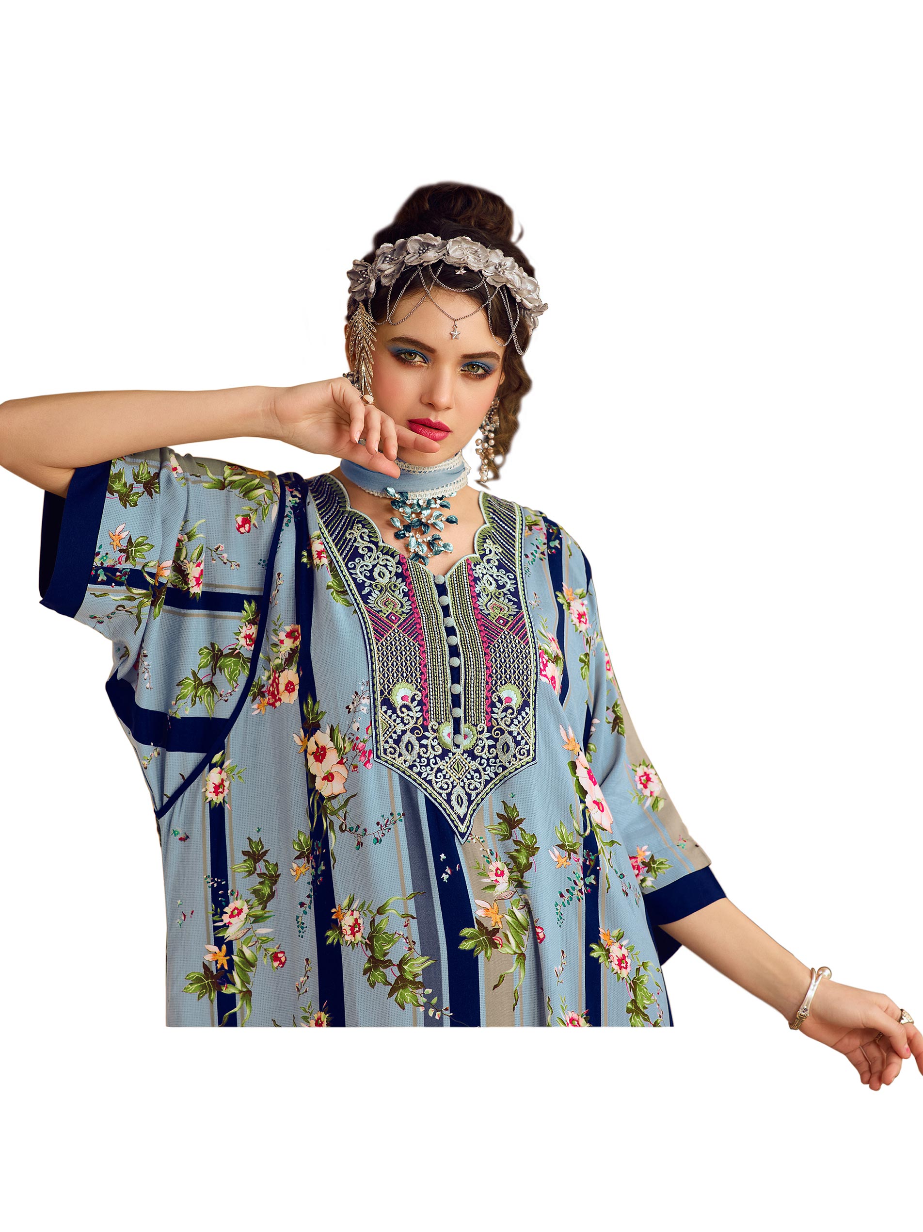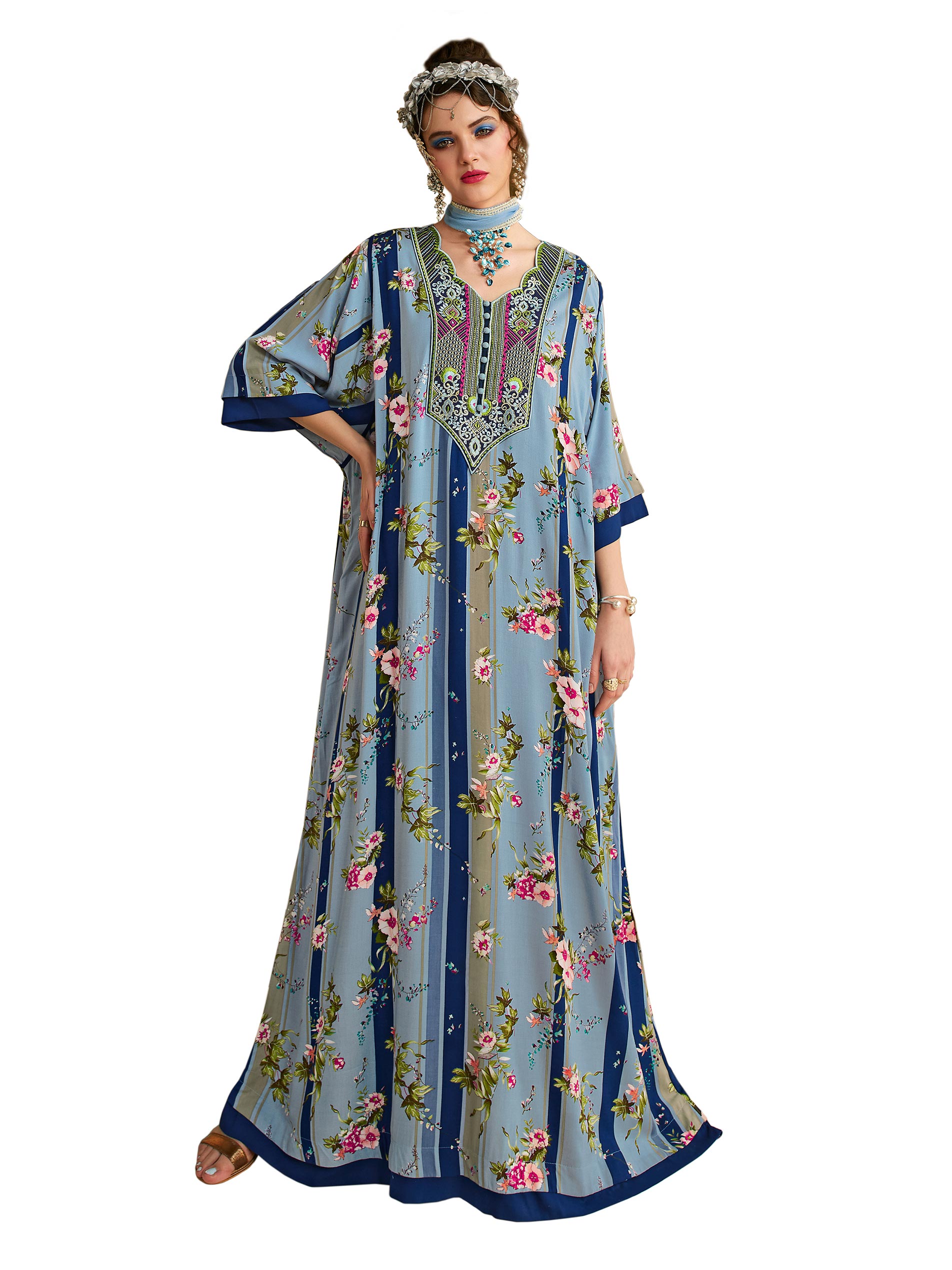 Revel in sky-blue rayon like a free bird in the vast sky. Designed to captivate the mind with a fancy neck and fancy sleeves styling, the floral print jalabiya daraat/ kaftan is made for the party in a fine A-line cut. Shop online and get set. Sara Arabia, across the gulf belt, dons’ unique Arabian jalabiyas in exquisite styles.