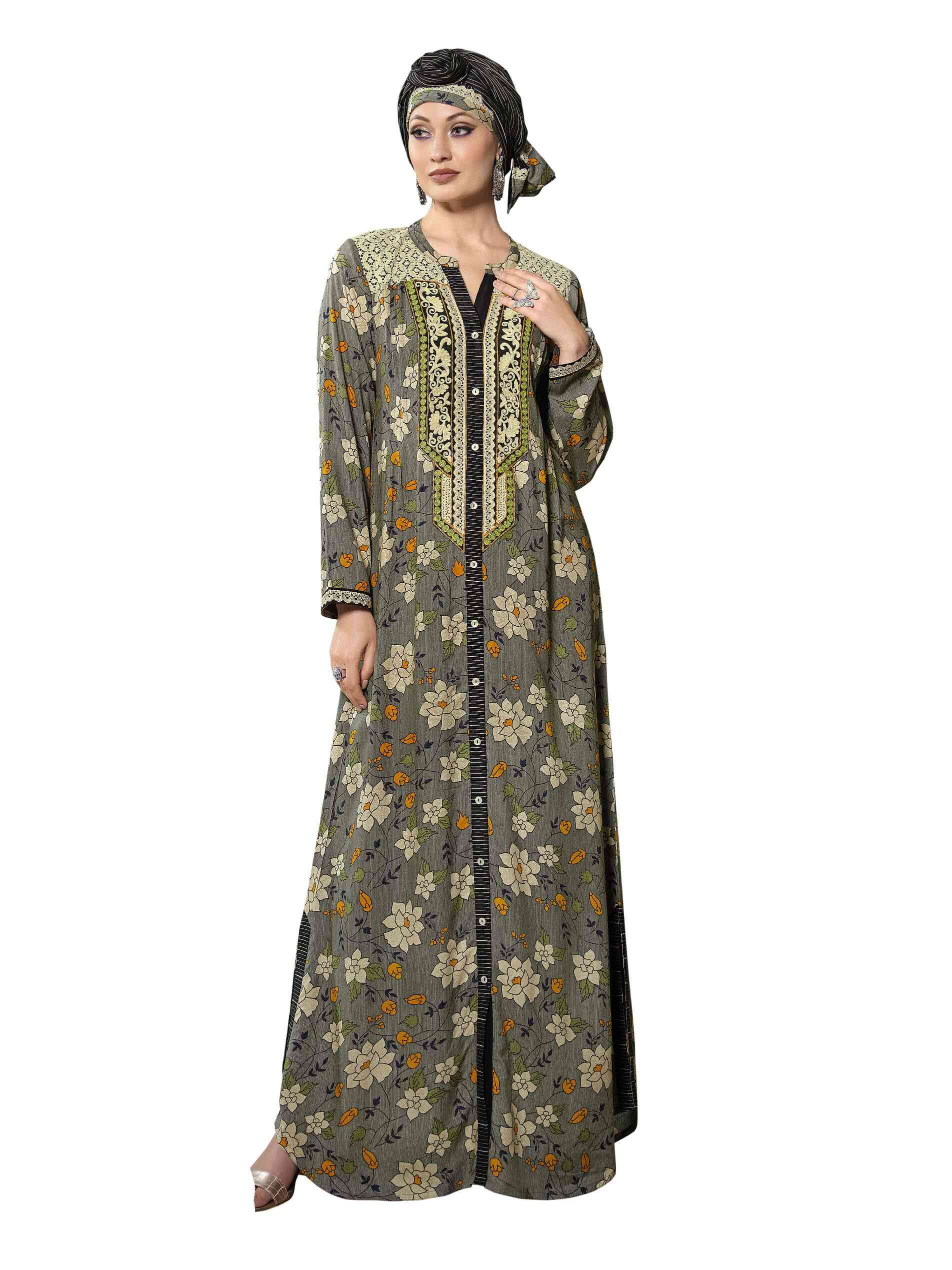 Welcome summer dressed in your best. The grey full length jalabiya is a complete charmer as it is highlighted in viscose fabric with a floral print. The full sleeves and V neck give it an enigmatic appearance, creating an aura of mystery in grey. The A line cut adds to its secretive vibe.