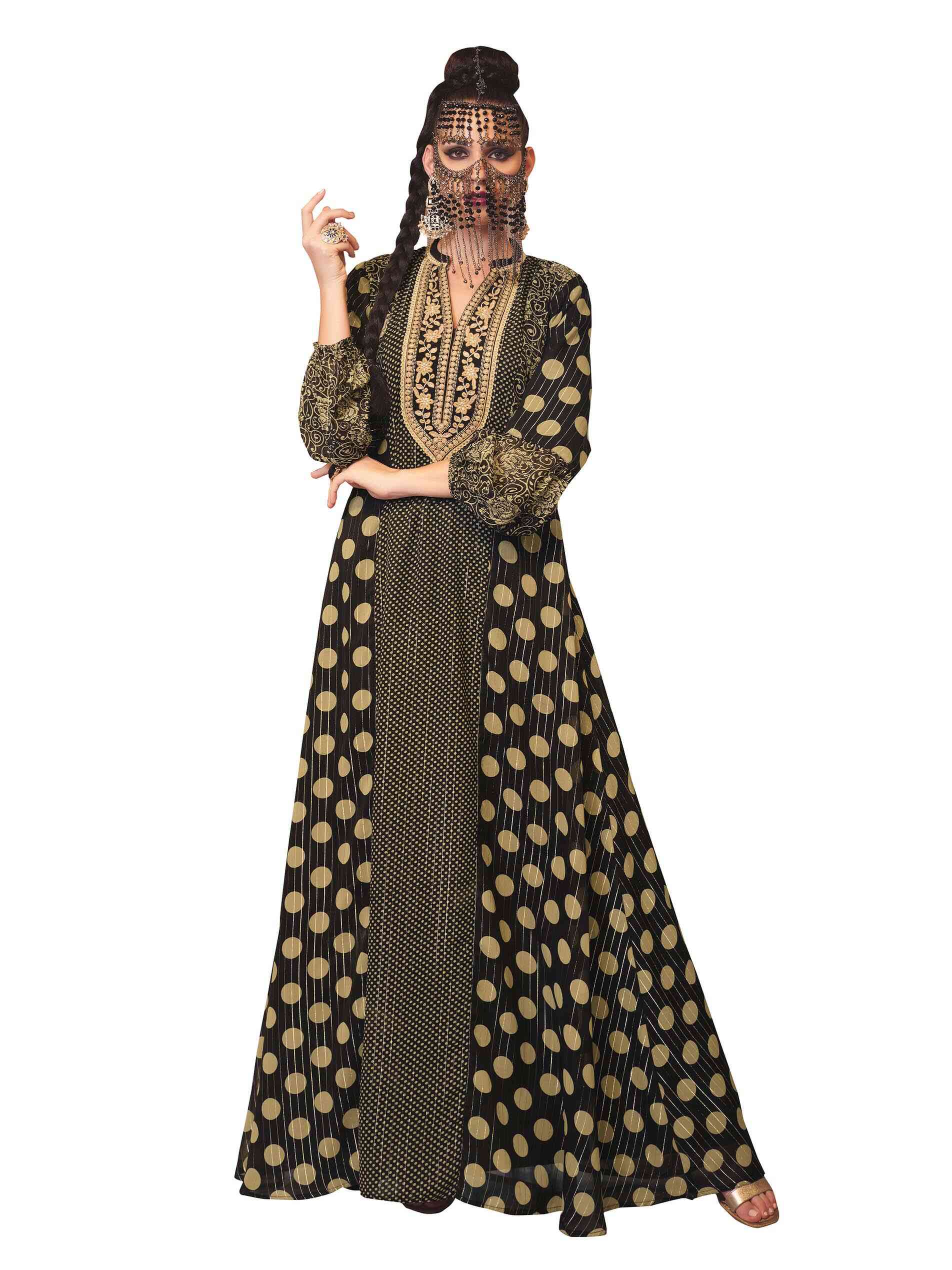 Black and beige always make a show stopper. This full length jalabiya is a sure stunner with polka dots in beige on a beautiful black polyester. The full sleeves end in floral grace and the V neck is embelished in awe inspiring embroidery to give the daraat an ornamental look. The flare cut adds to its styling.