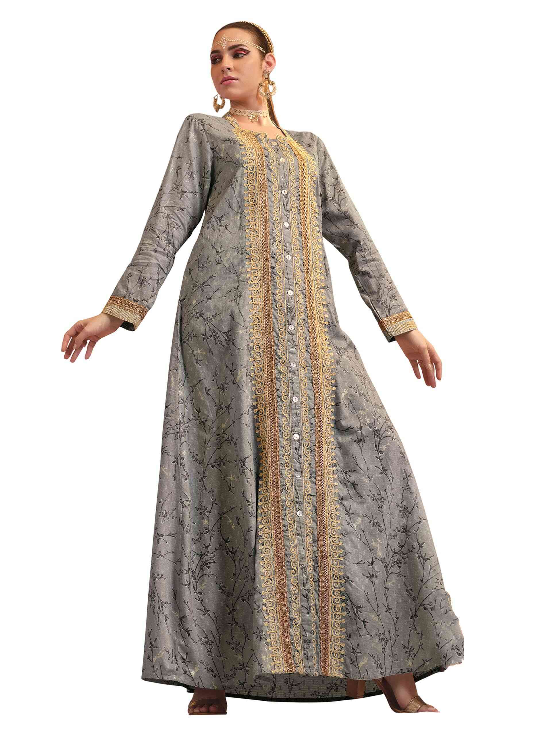 Grey with a touch of gold is just WOW. Embrace this full length grey cotton jalabiya in self print that's petterned to prettiness in a notch neck from where a streak of gold laces emanate on the front open daraat to add its poise. The A line looks perfect for the gorgeous grey and the full sleeves end in golden grace.