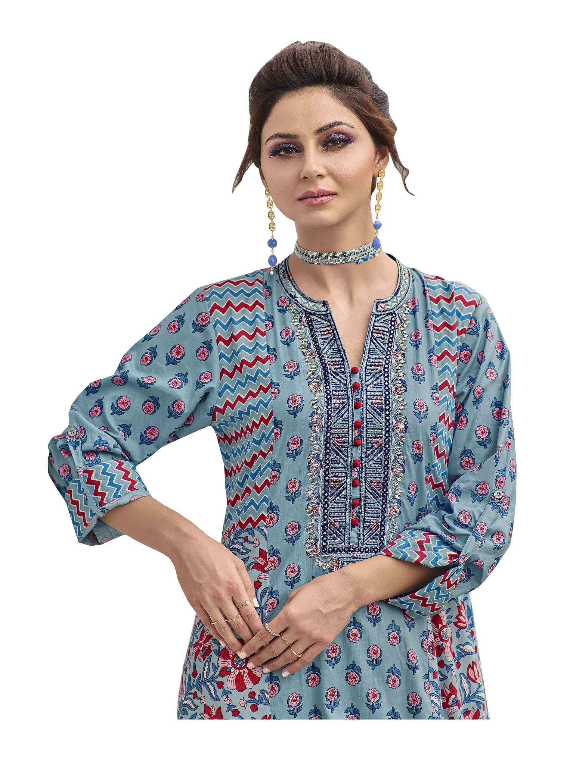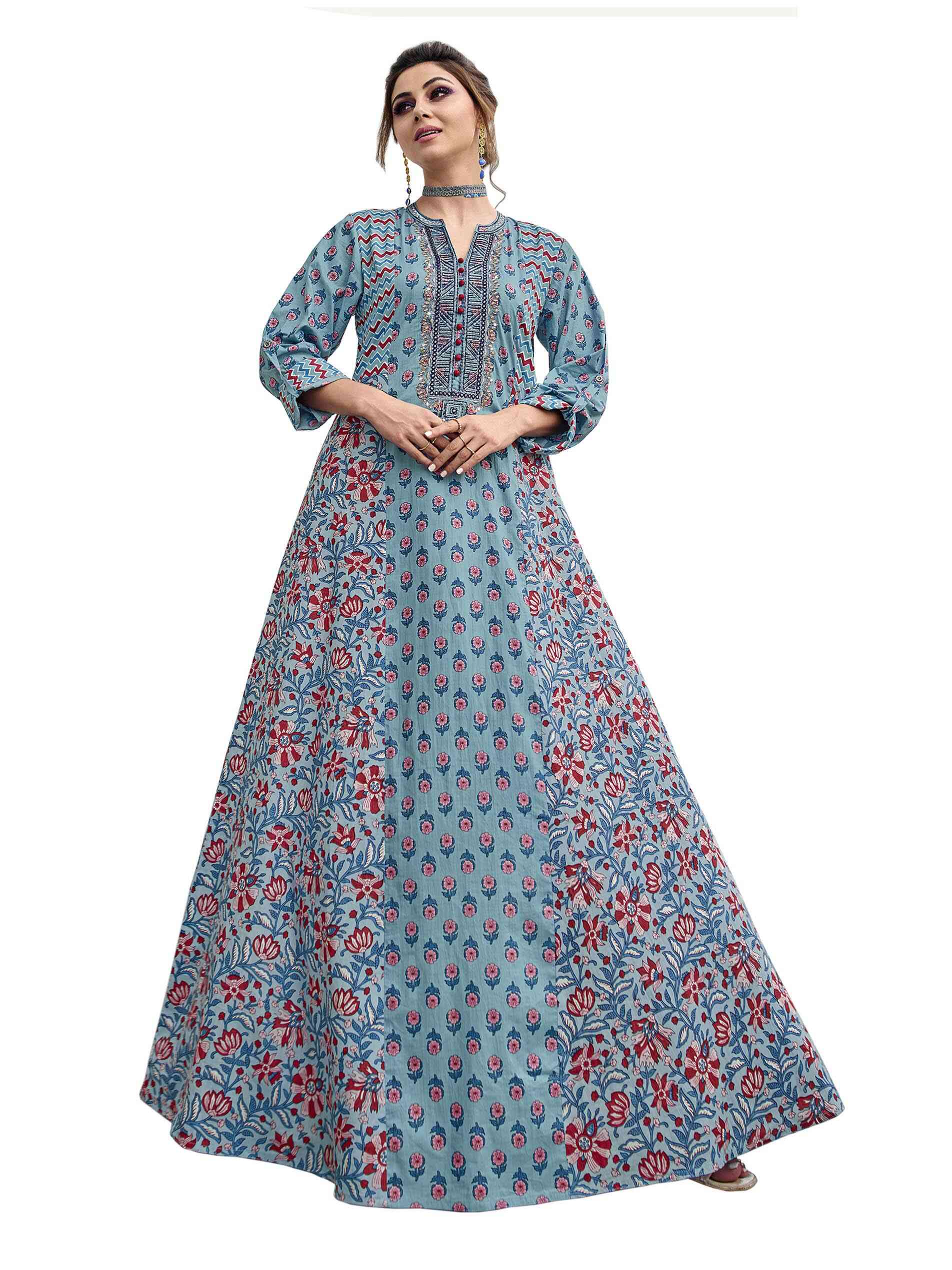 Blue is the colour of the season. Pair it with red and it makes the conventional yet most enchanting combination. So party to your beat in this full length cotton cambric jalabiya made to appeal to those with great taste. The print is floral and geometric to create a symphony of moods that alternate from dawn to dusk, creating a mesmerising hue of eternal and untouched beauty. The V neck sports rich red potli buttons and embroidery in floral and geometric styles complimenting the dual print. The A-line is set just right for the full sleeves and full length.