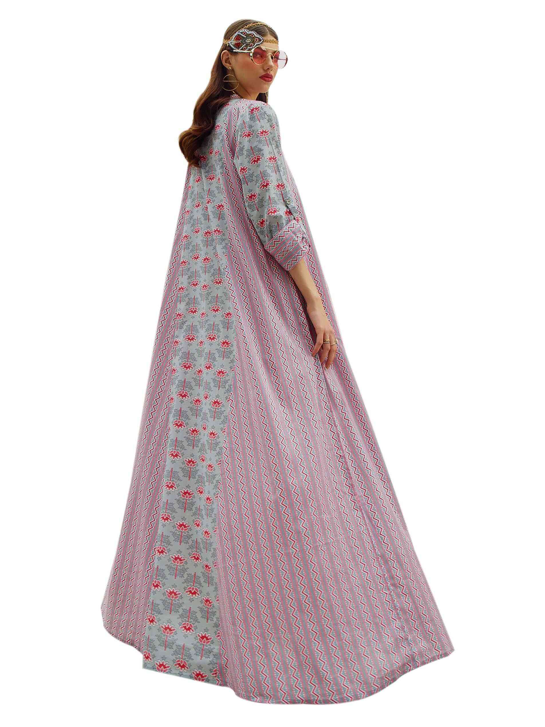 A zig-zag print inspires adventure and the floral blossom a romantic tale. Immerse in sensational feeling as you wear a grey full length jalabiya to spark the party with its dash of red. The V neck is beautified with excellent bead work and the 3/4th sleeves add panache to the daraat. The A-line is just right for a dress so finely made in cotton cambric.