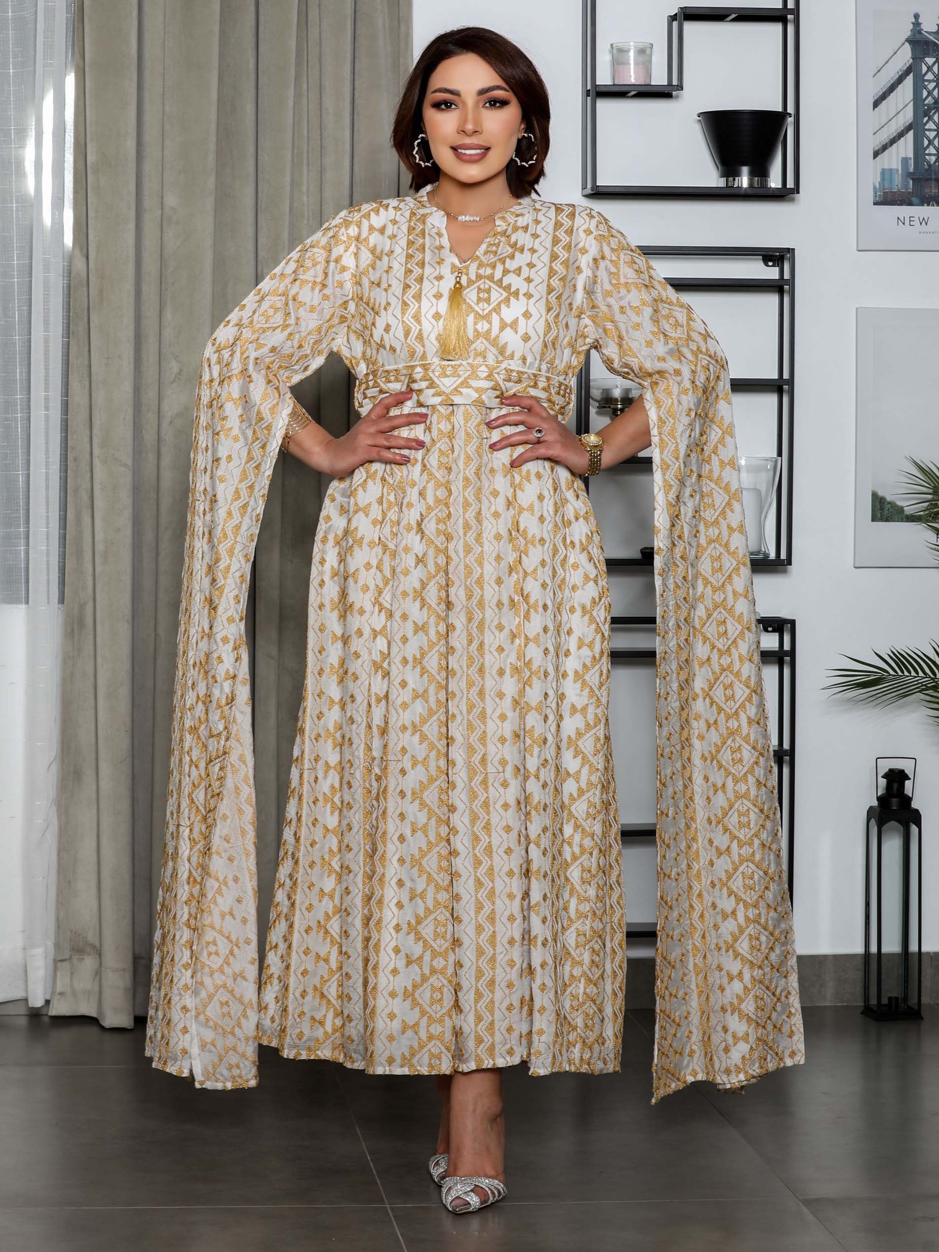 Adorn yourself in an elegant A-line cotton jalabiya designed with white and gold colors, complemented by an elegant belt to shine confidently this Ramadan.