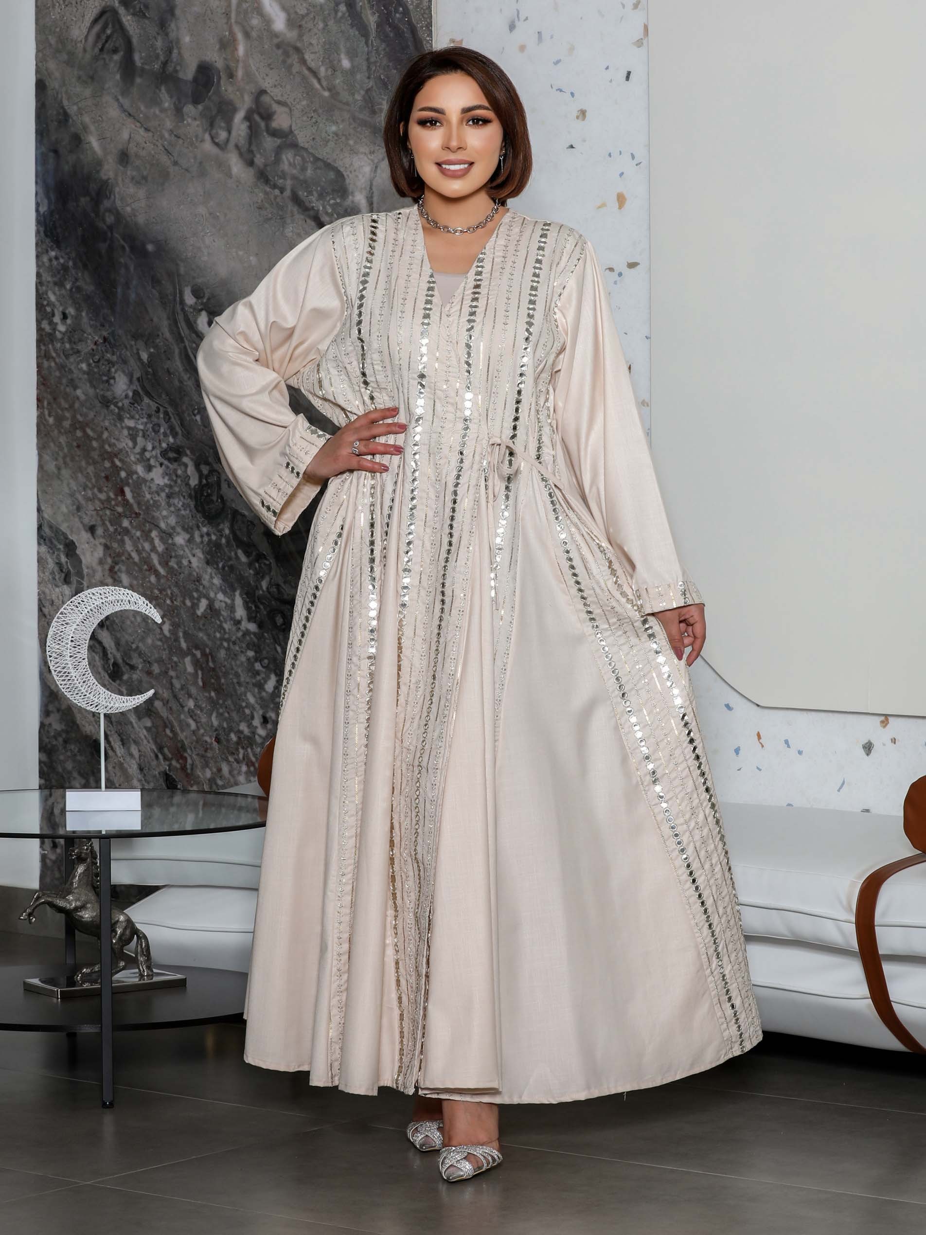 Shine in off white long sleeve maxi cotton jalabiya, studded with shiny lobes for a stunning look in Ramadan.