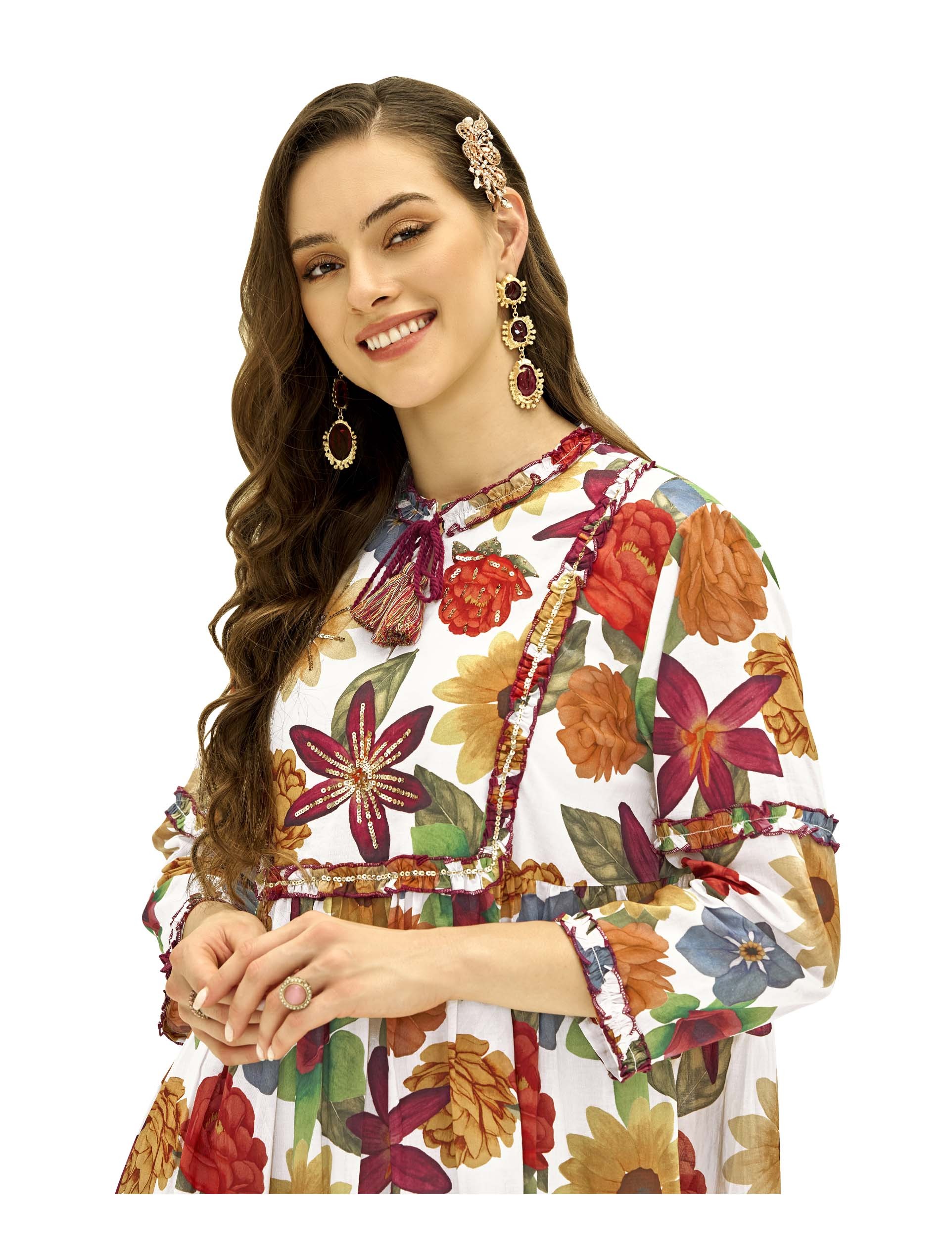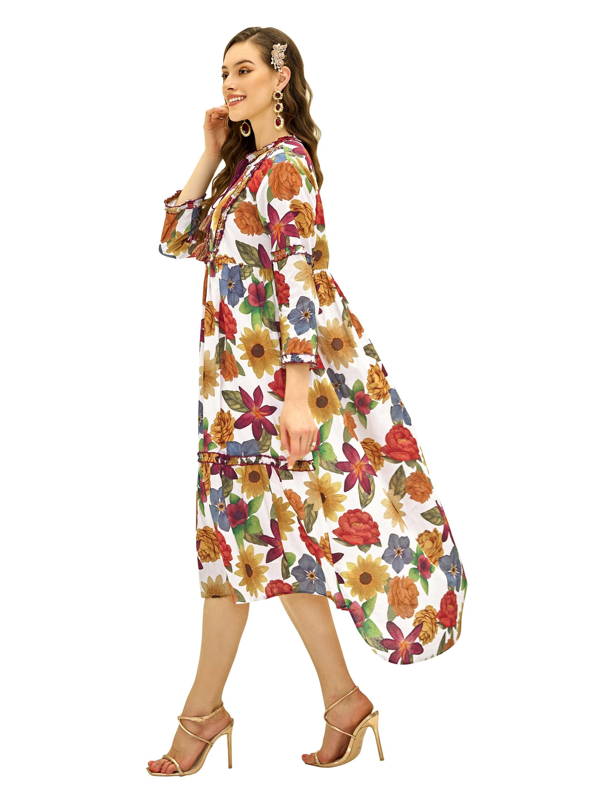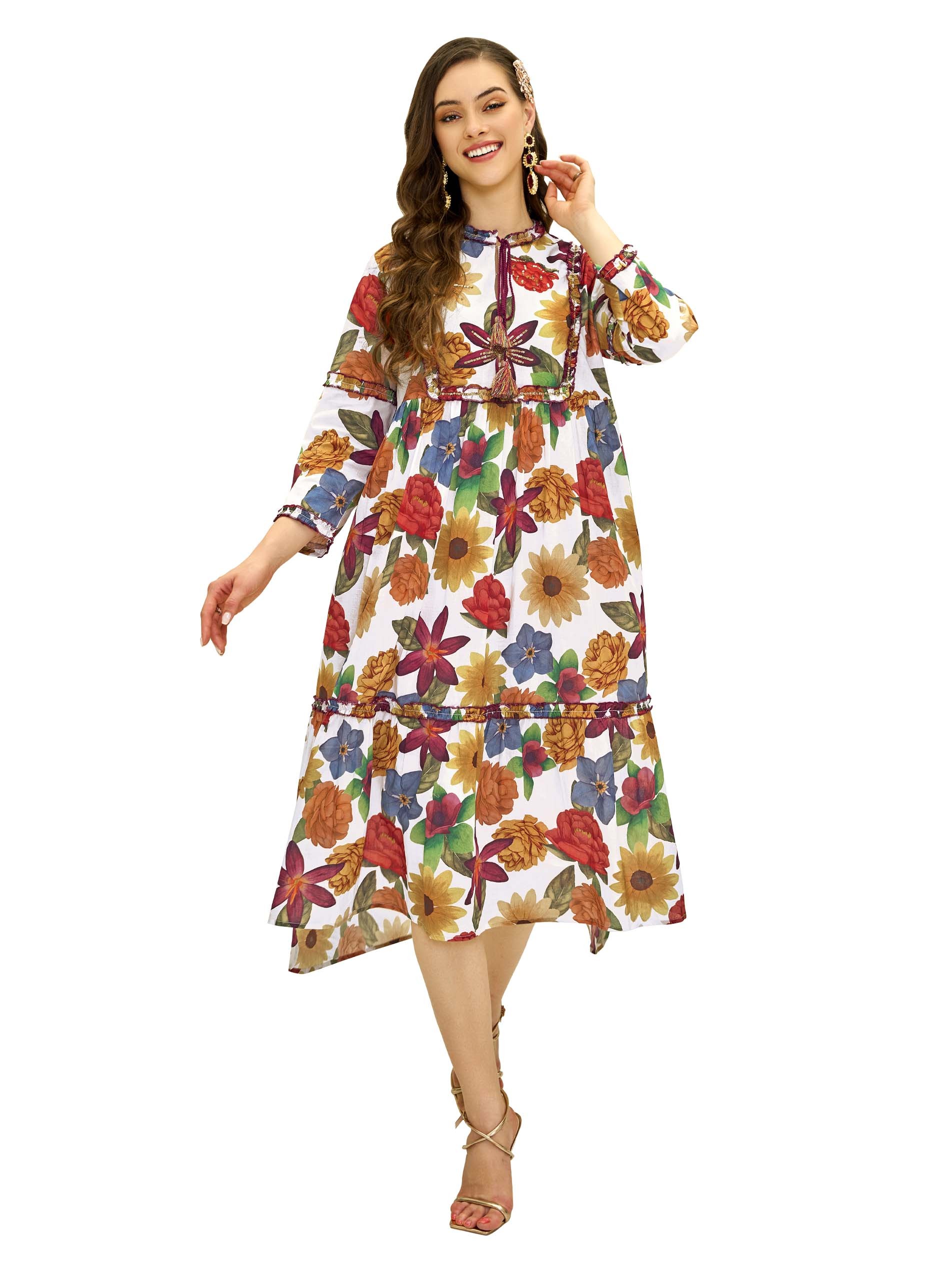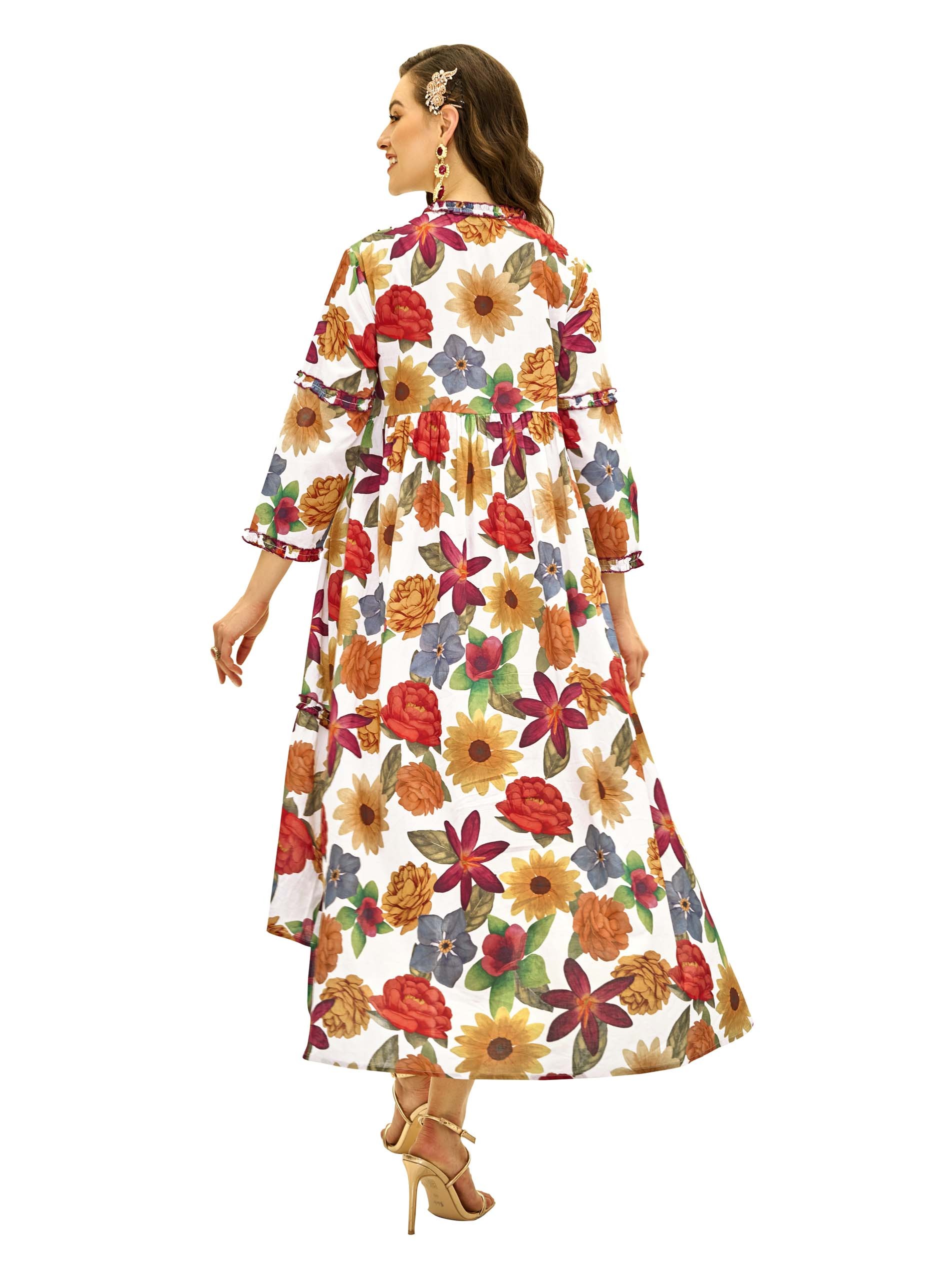 This multi-color floral print cotton jalabiya is perfect for summer with its vibrant patterns and breathable fabric. The ruffle accents around the tiers and neckline, along with bead work, add a playful and stylish touch. With its flare cut, the dress ensures comfort and ease of movement, making it ideal for casual occasions.