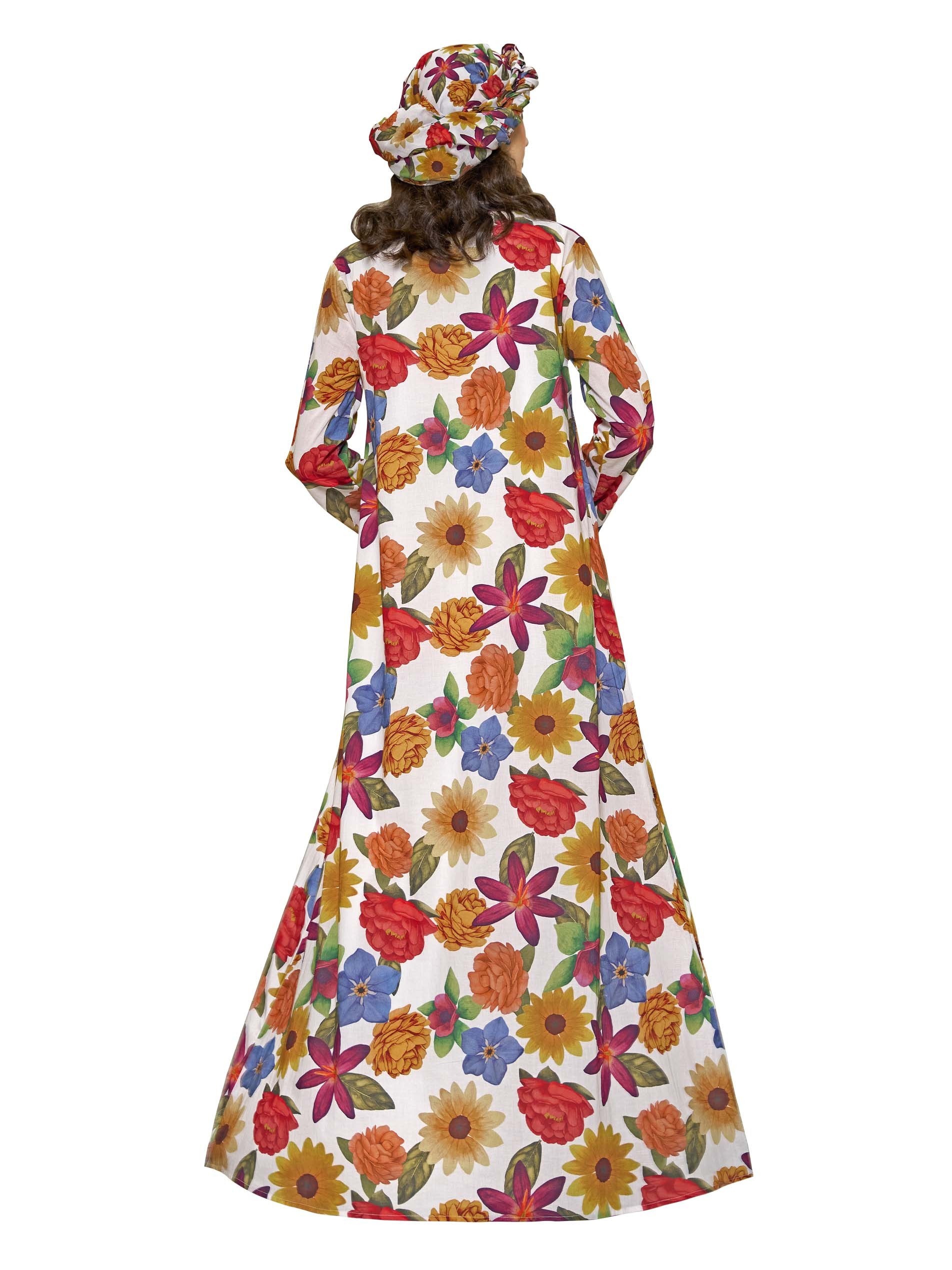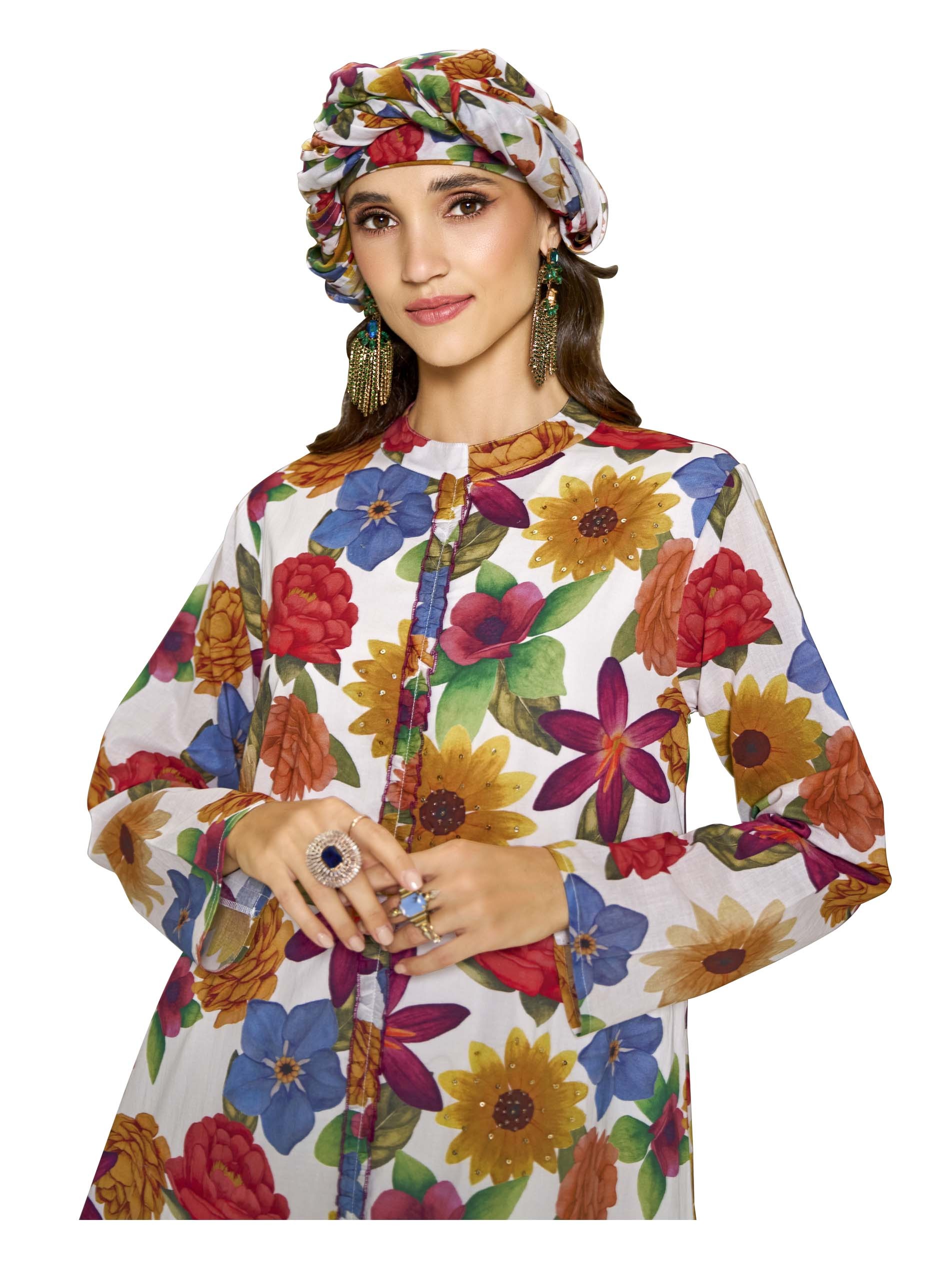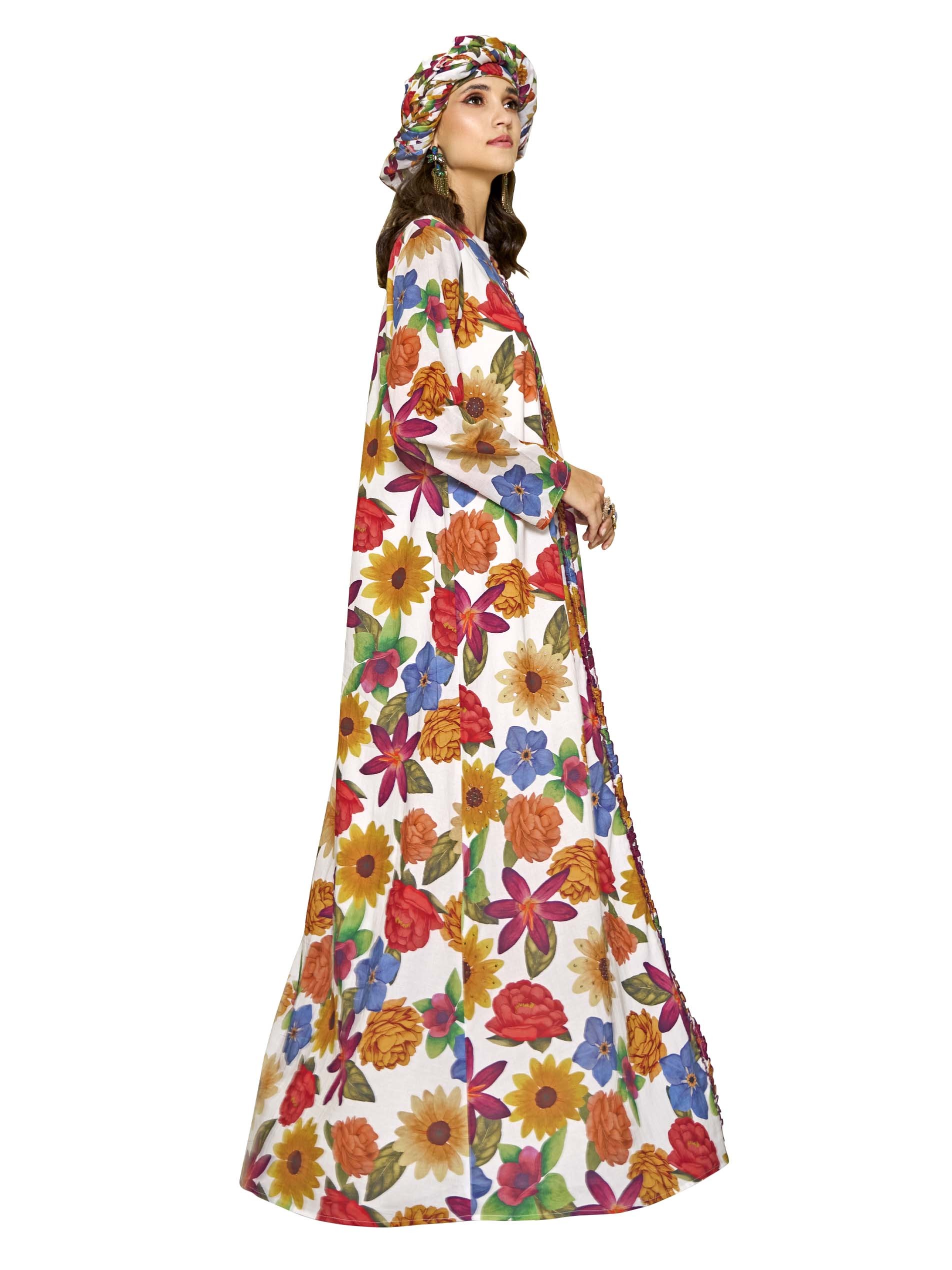 This A-line jalabiya features a beautiful multi-color floral print that spreads across the cotton fabric, creating a vibrant and charming design. The ruffle and beadwork details add a playful touch, while the flowy silhouette ensures comfort and ease of movement. Perfect for casual occasions, this piece brings a cheerful summer vibe to any wardrobe.