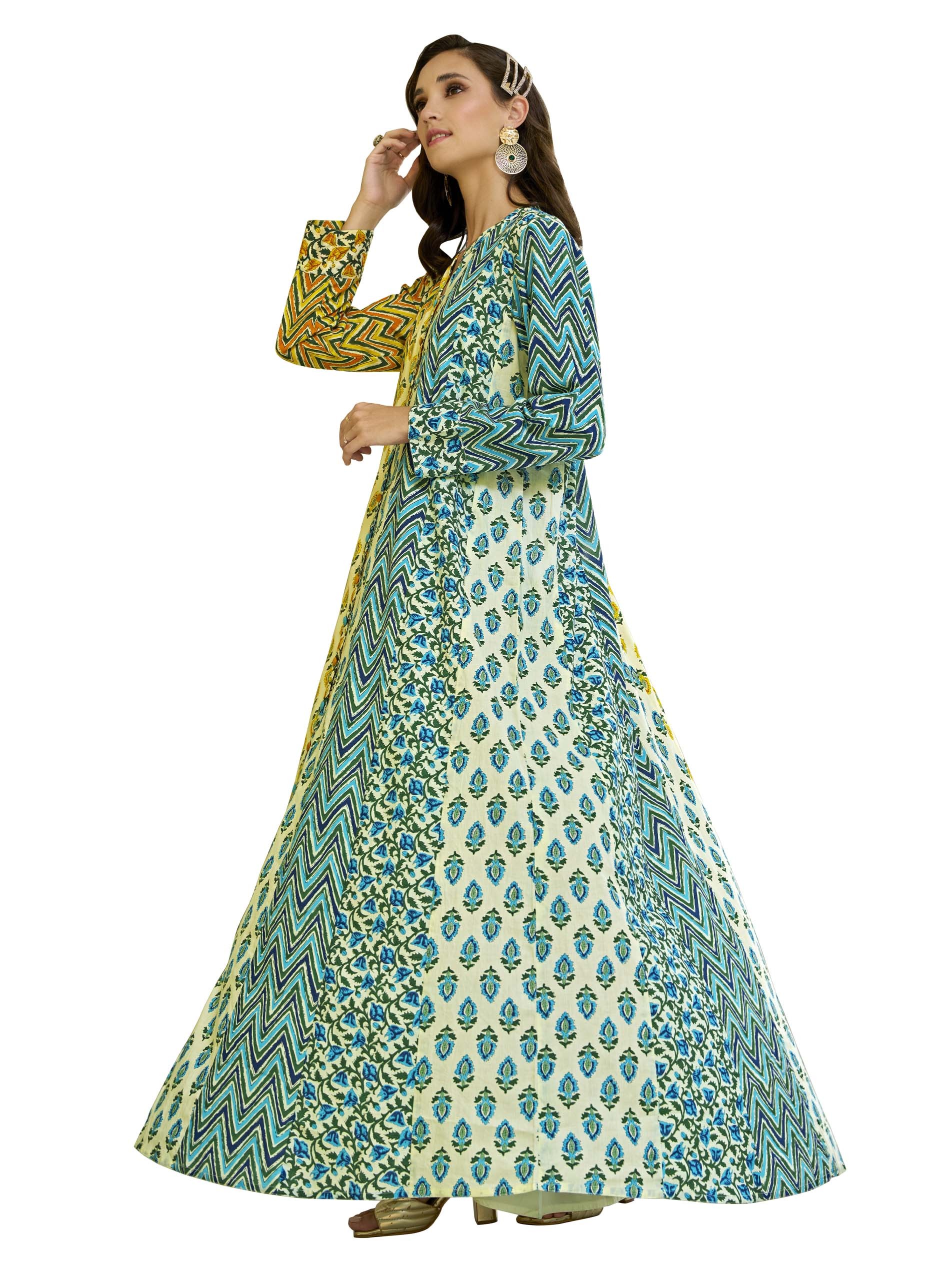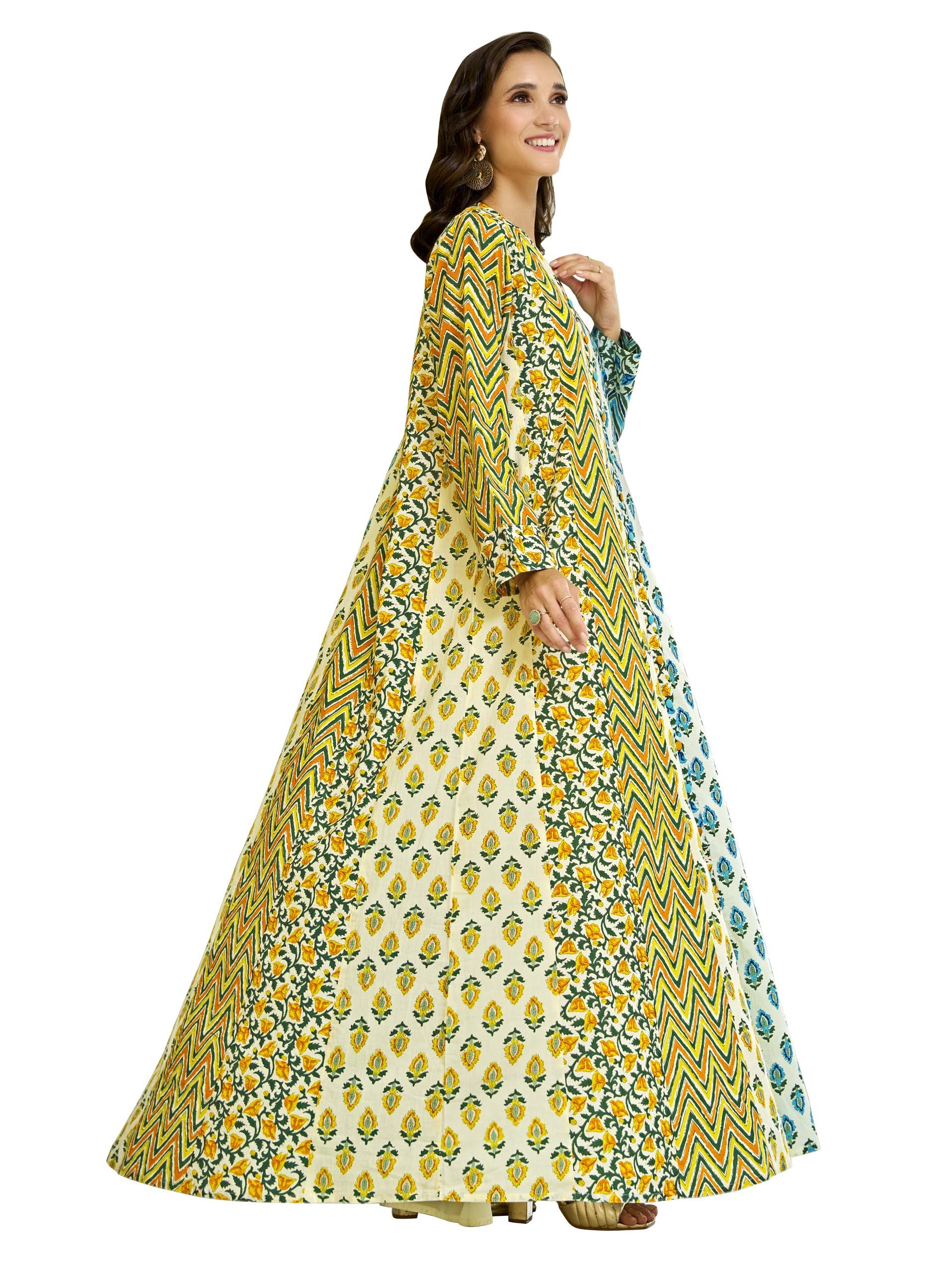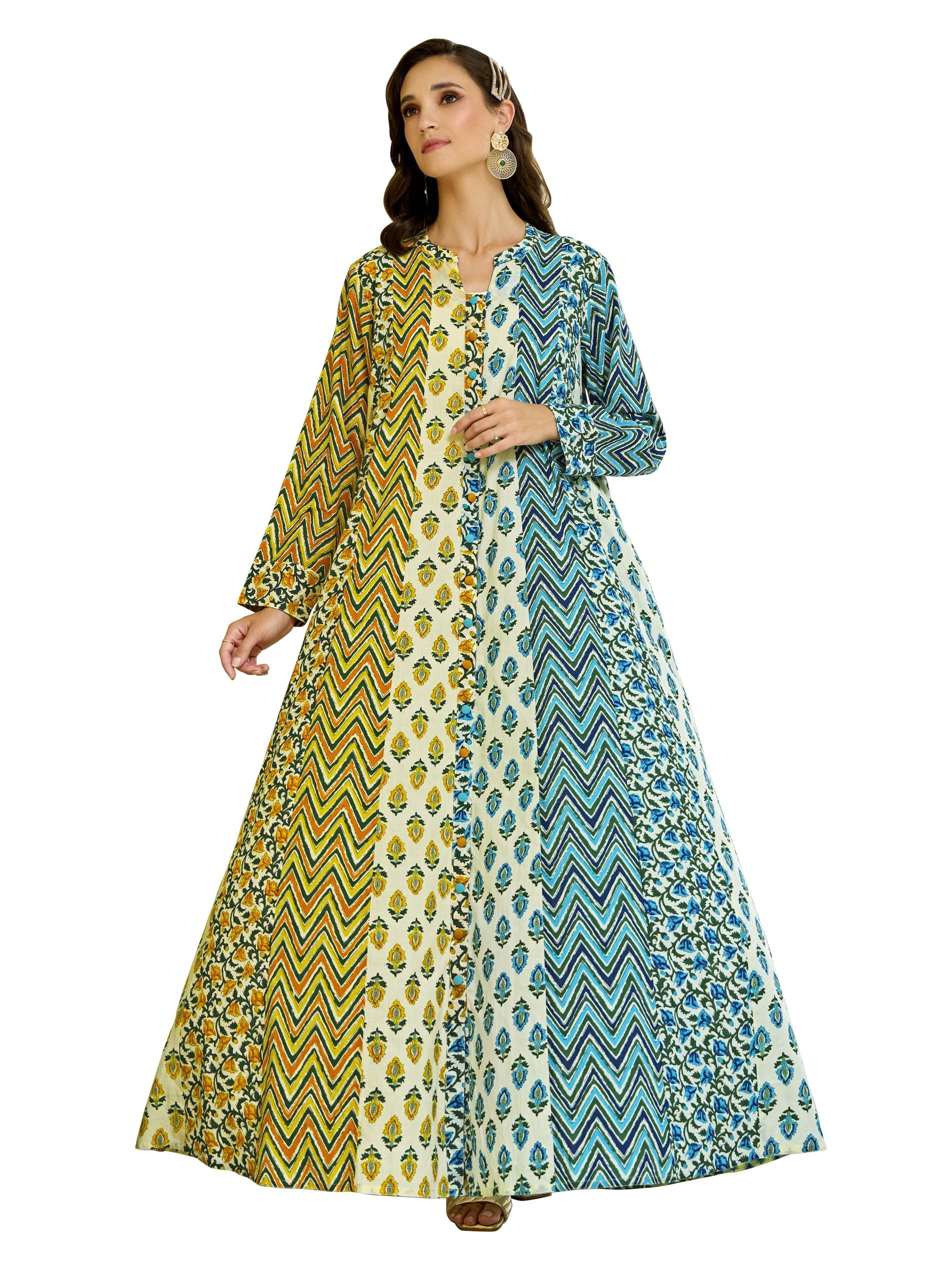 This cotton A-line cut jalabiya features a vibrant combination of colors and prints, including bold chevron stripes, delicate floral motifs, and geometric patterns. The cheerful mix of yellow, blue, and green creates a dynamic and eye-catching design, perfect for casual summer outings. Its flattering fit and playful style make it an ideal choice for adding a pop of color to any occasion.