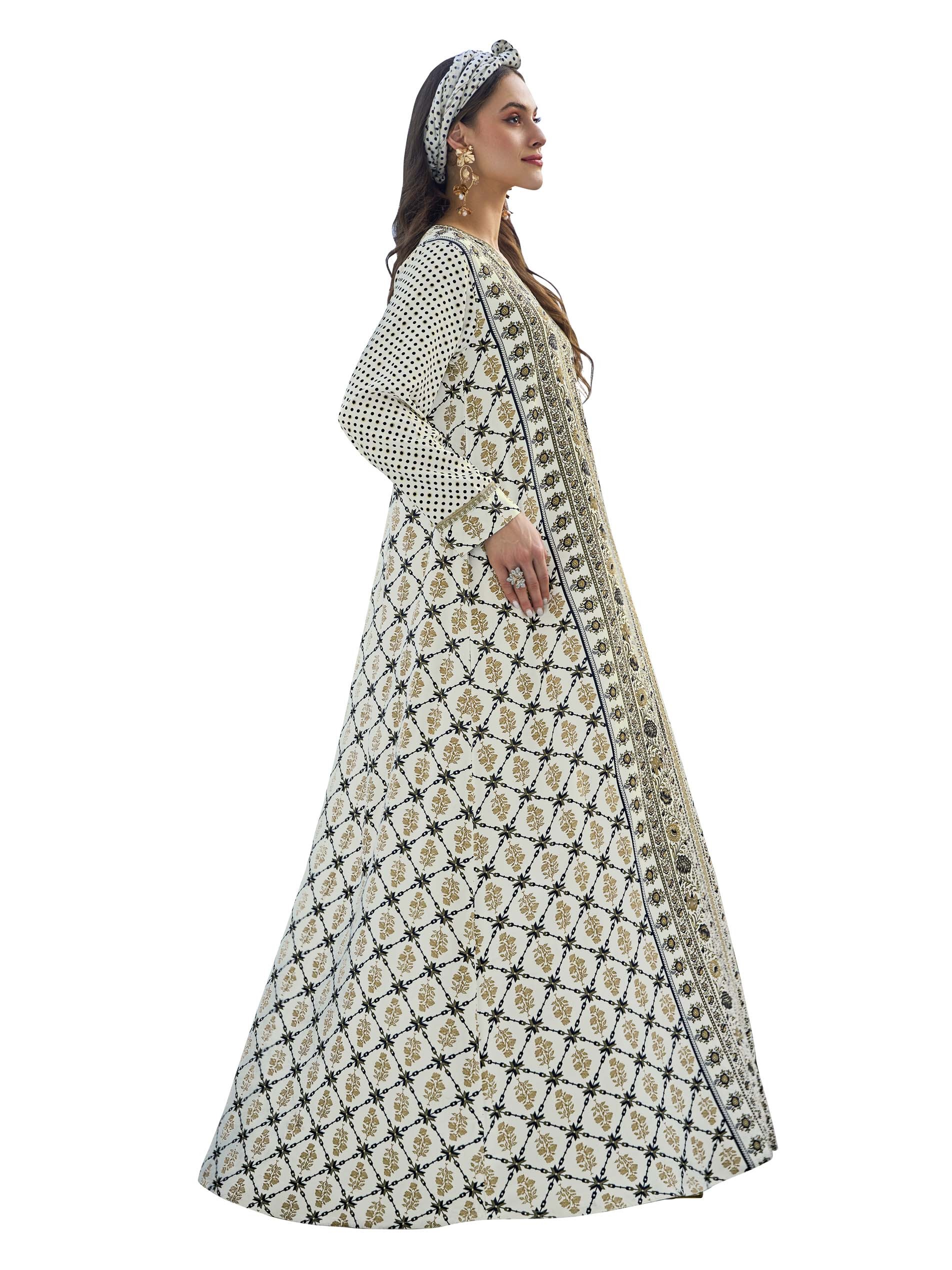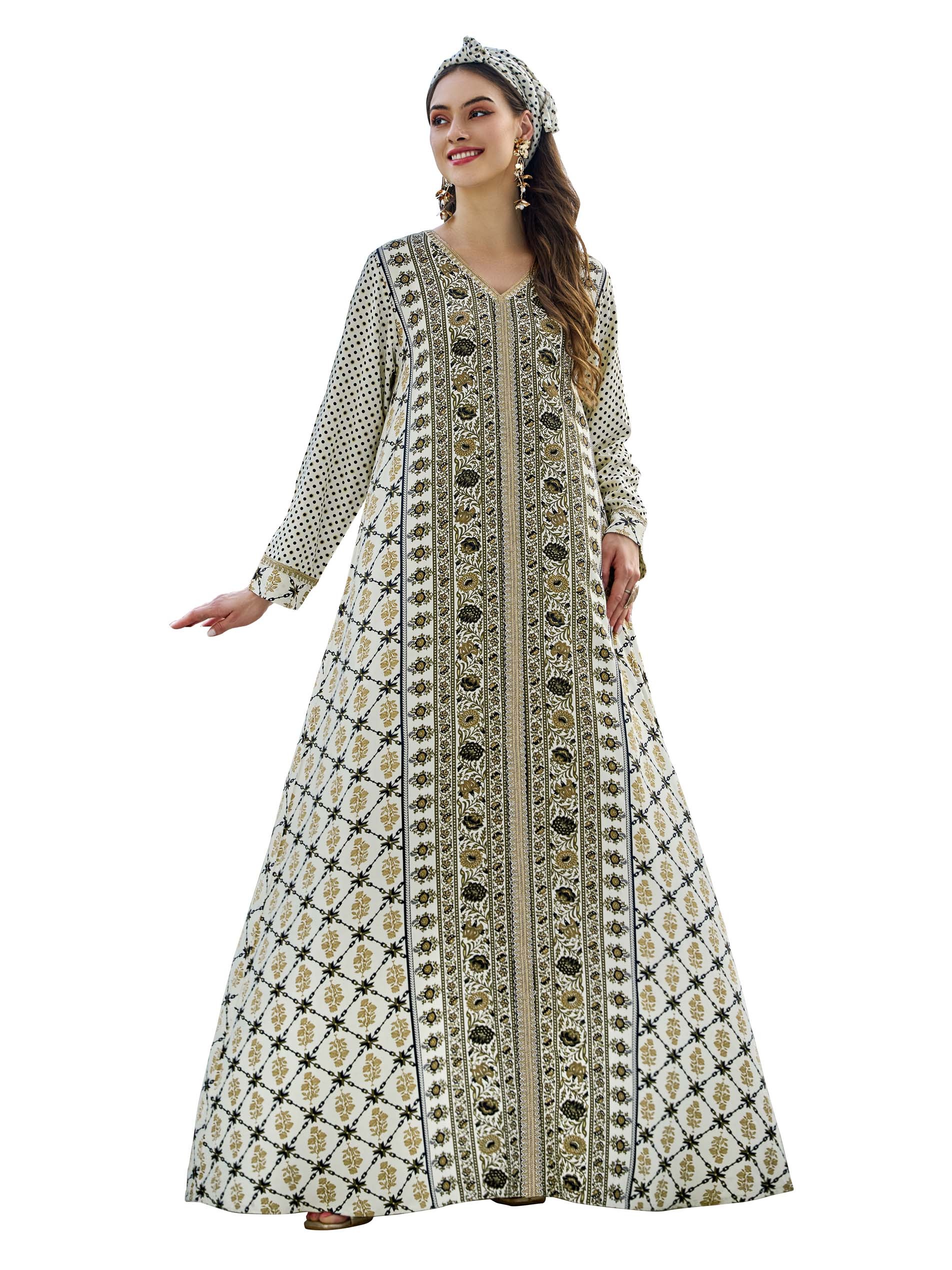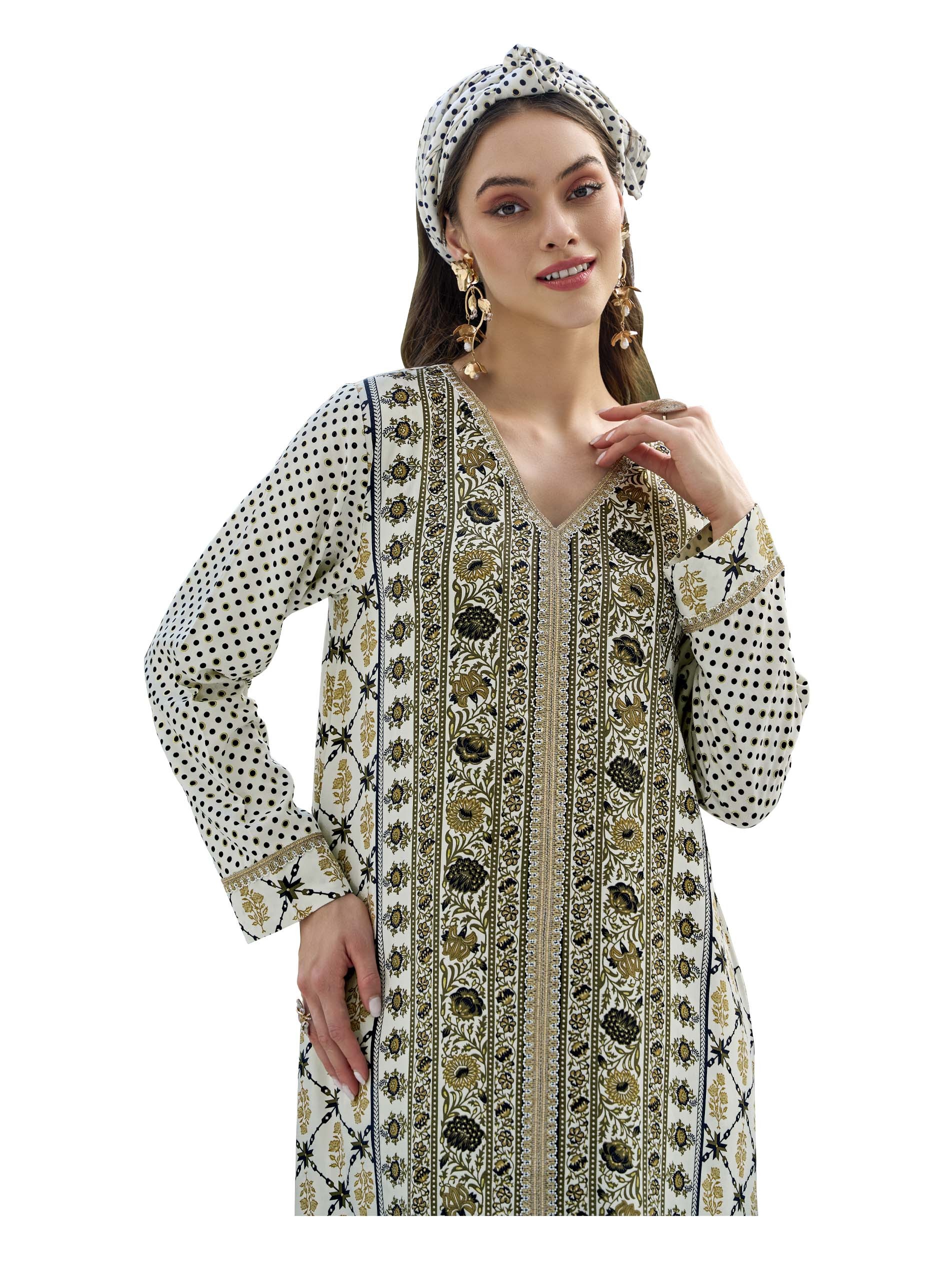 This A-line jalabiya, crafted from a soft cotton blend, features delicate floral and geometric motifs, complemented by a subtle polka dot pattern on the arms. The breathable cotton makes it perfect for casual summer wear, while the elegant lace panel design adds a feminine touch. The simple white base enhances the overall soft and stylish look.