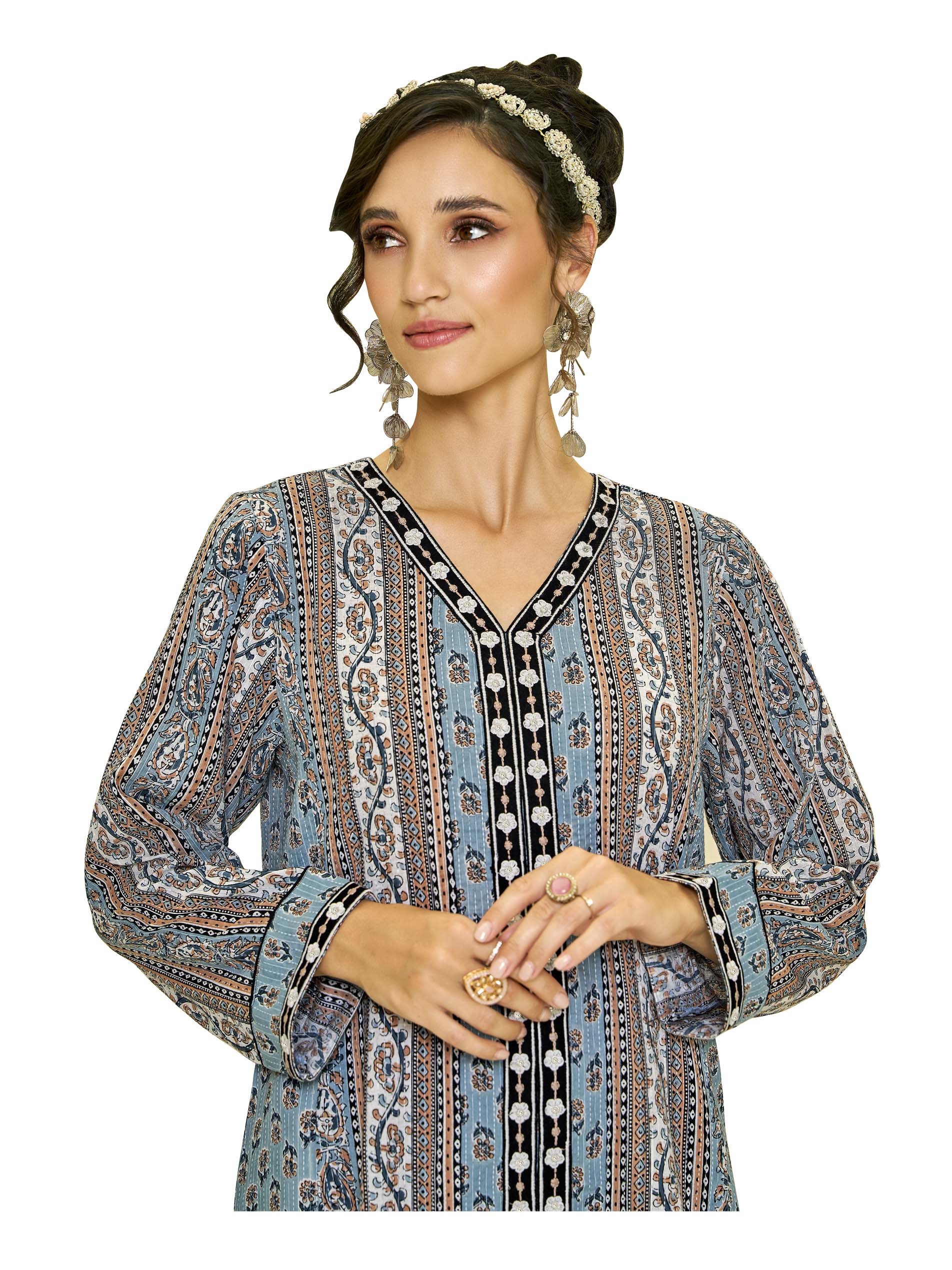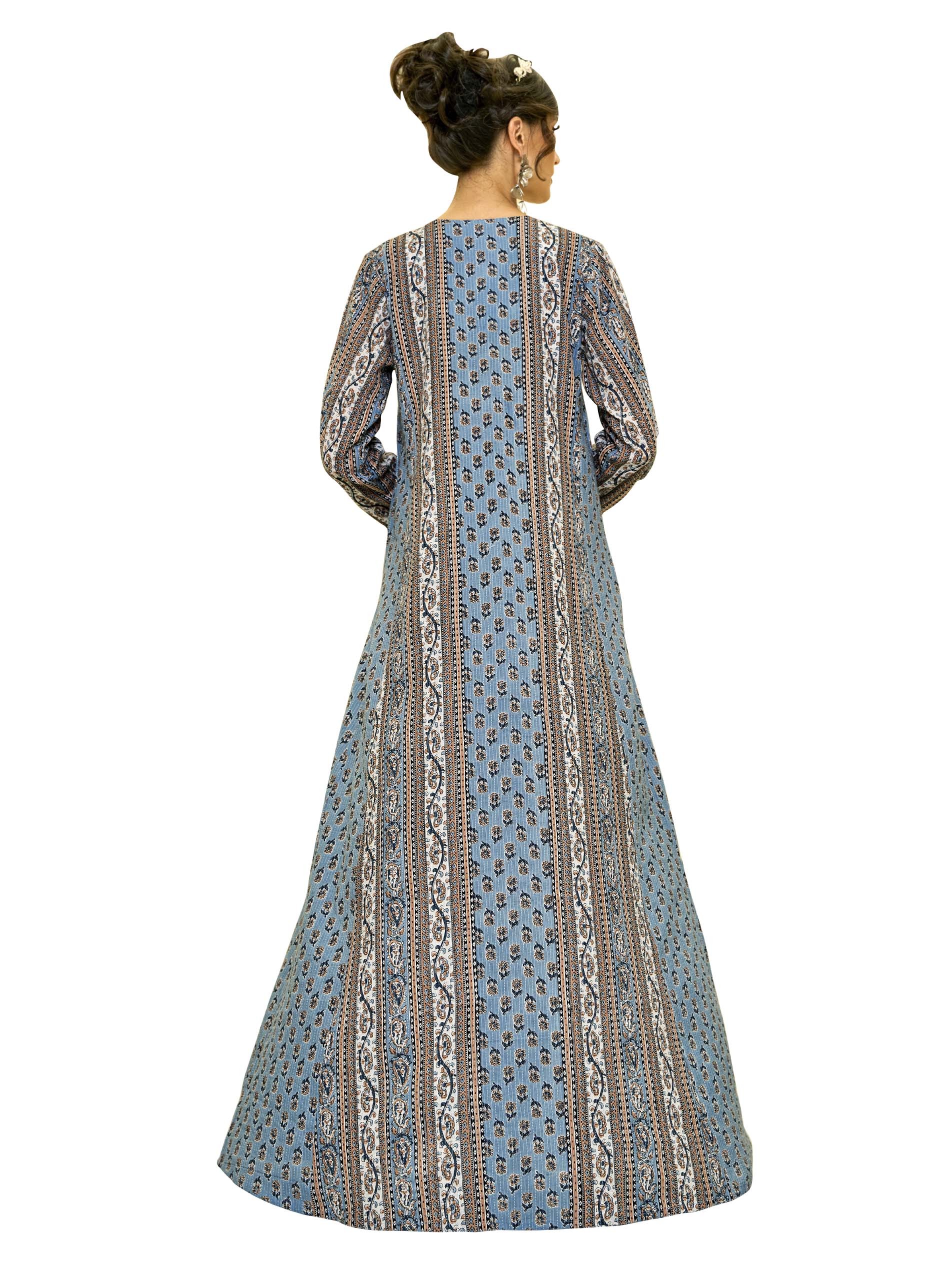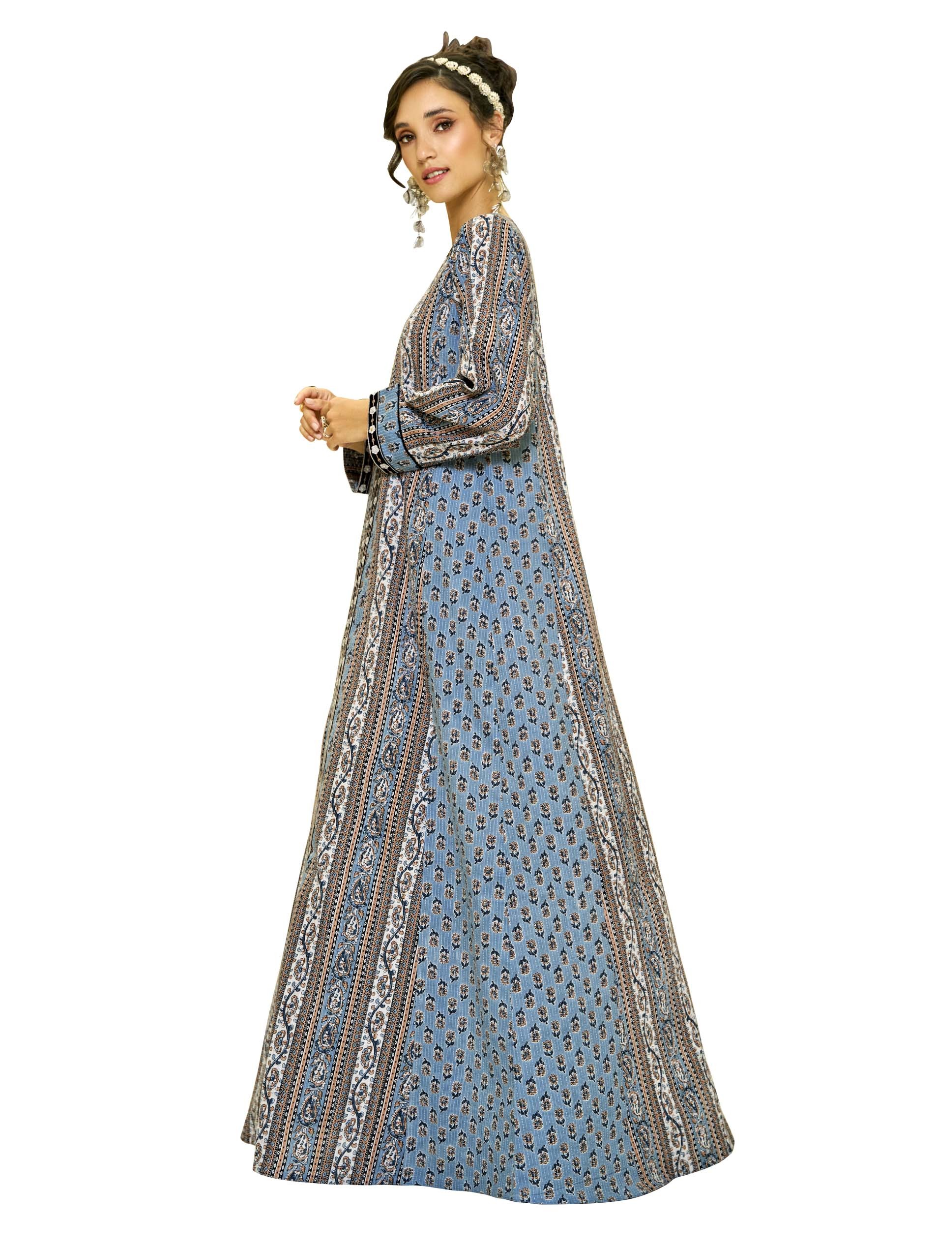 This elegant A-line jalabiya is crafted from breathable cotton, offering both comfort and grace for summer occasions. Featuring a mix of floral and geometric stripes in tones of blue, grey, white, and brown, it combines vibrant patterns with subtle sophistication. The embroidery panel adds an extra touch of detail, making it a perfect choice for casual yet chic wear.