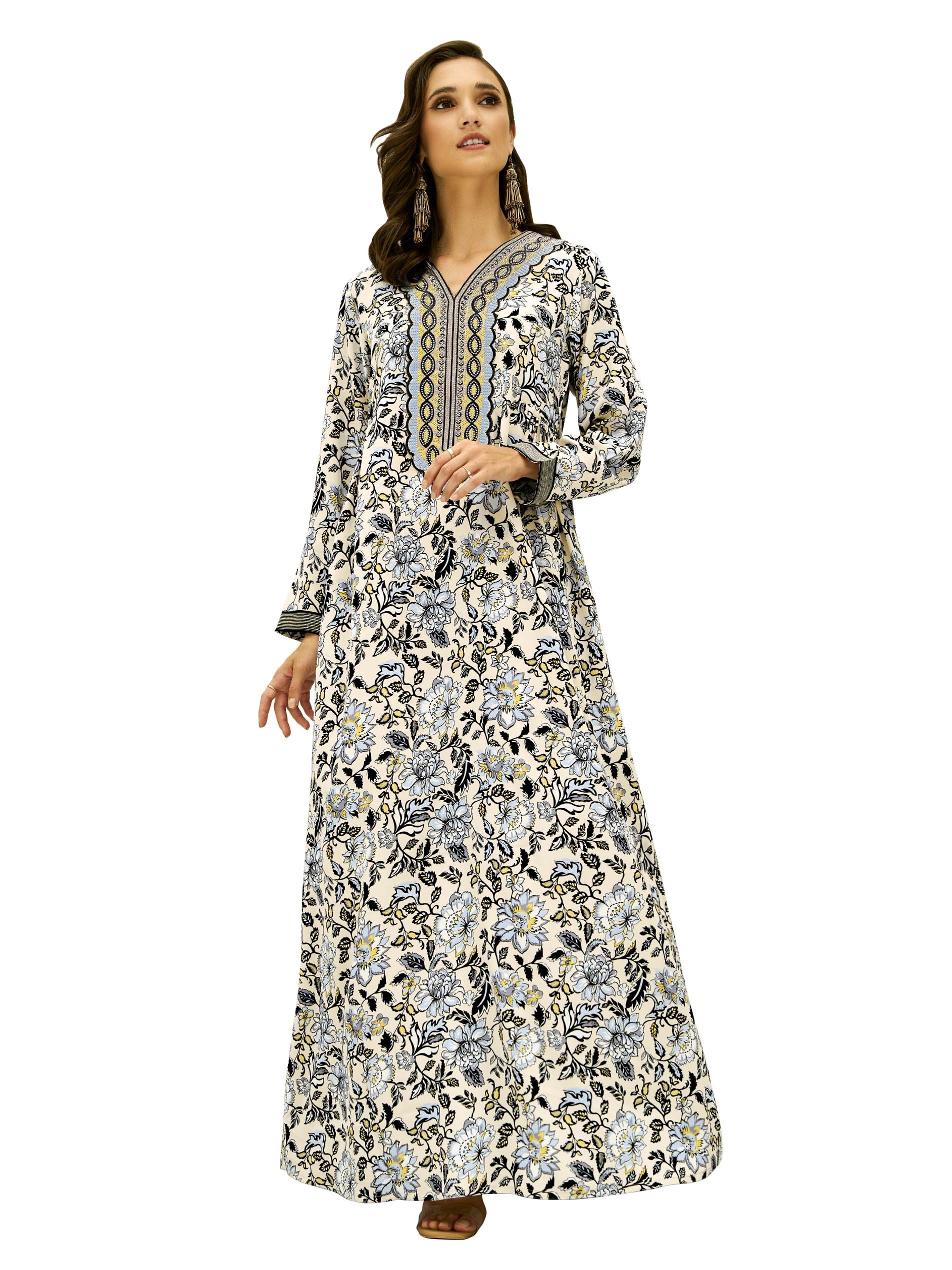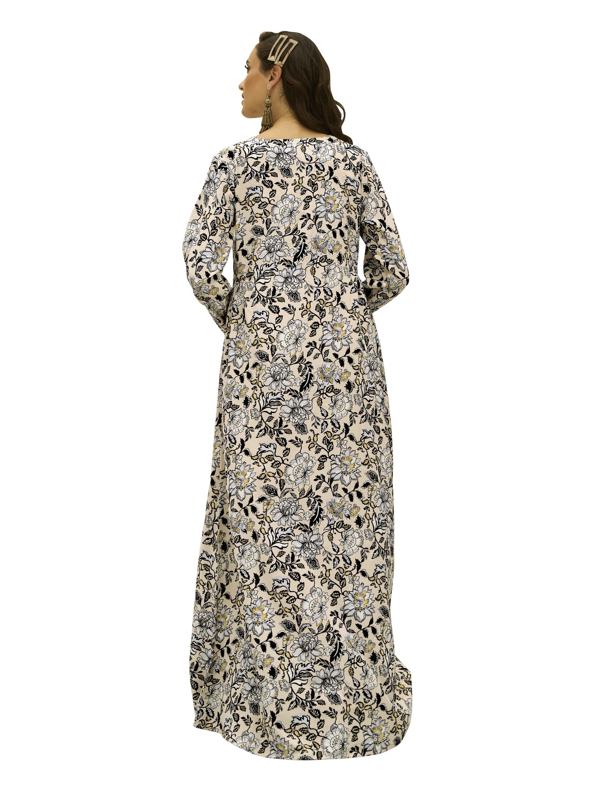 This A-line Jalabiya, crafted from breathable cotton, features a serene blend of floral prints in beige, black, baby blue, and yellow, creating a peaceful and elegant aesthetic. The waist gathering and delicate embroidery work add a touch of refinement, making it a perfect choice for casual summer outings. Comfortable and stylish, it’s ideal for warm-weather occasions.
