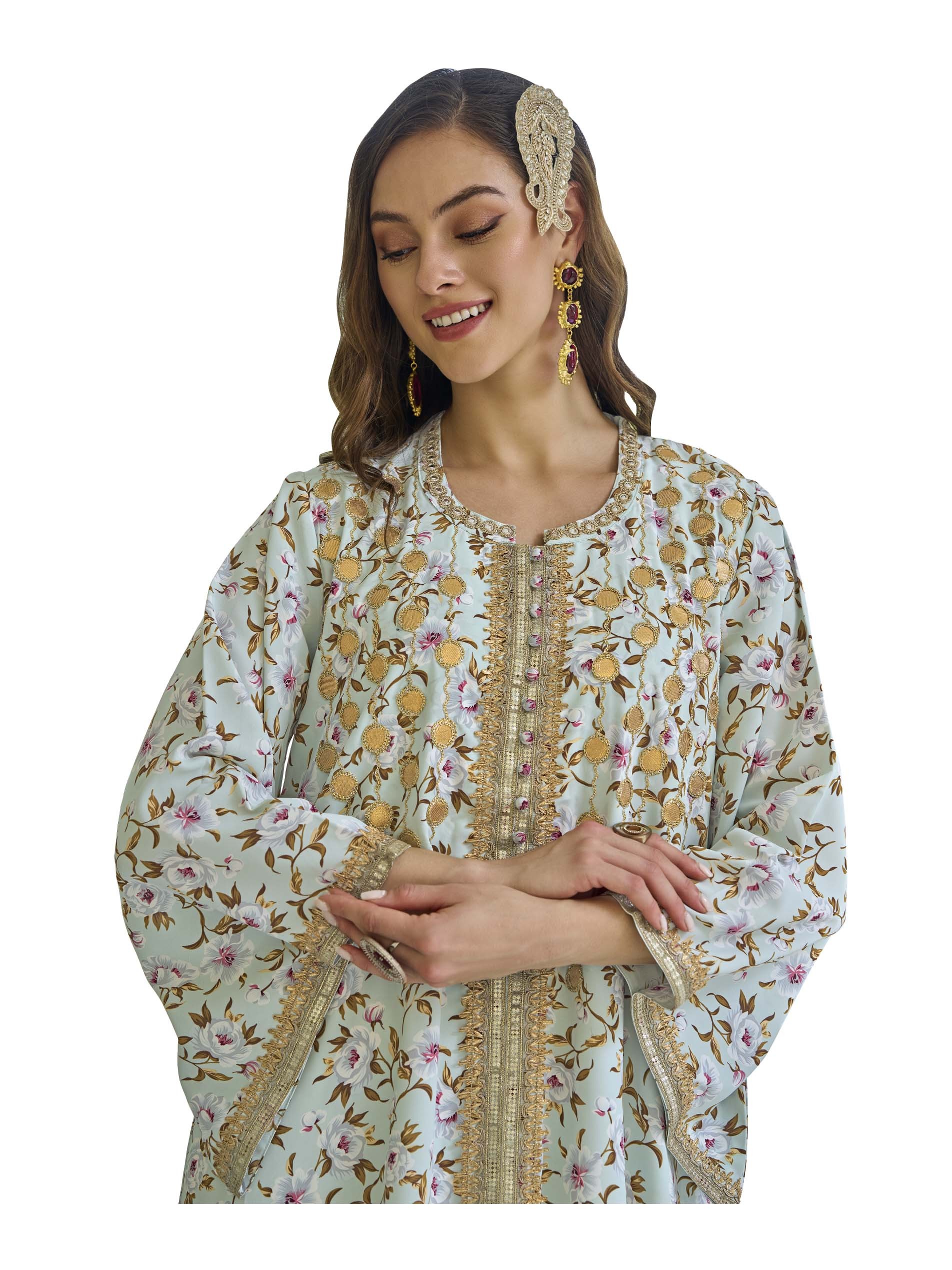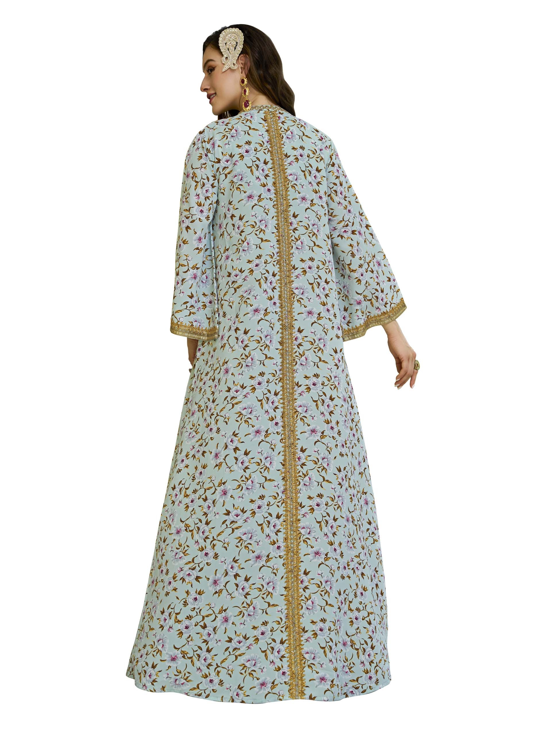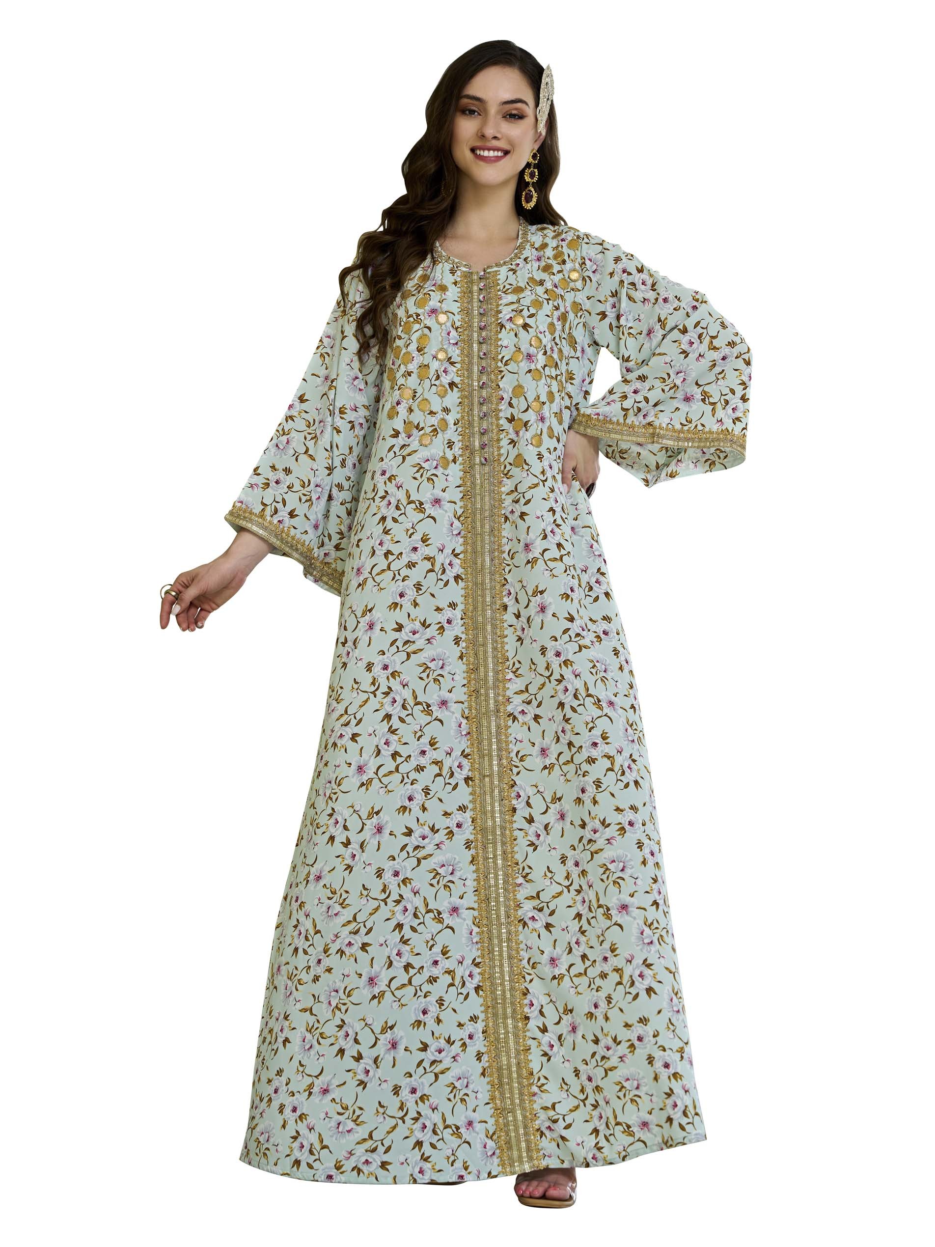 This floral crepe kaftan with a flared cut features an elegant design made from soft cotton, making it perfect for summer parties. The design features delicate floral prints in muted tones, embellished with gold embroidery and detailing on the collar and cuffs. With its lightweight fabric and distinctive flared cut, it offers comfort and elegance at the same time.