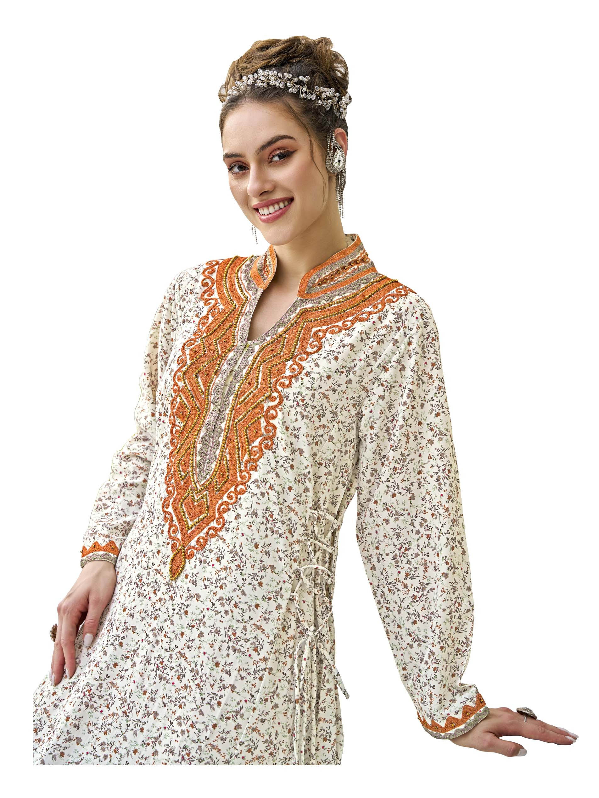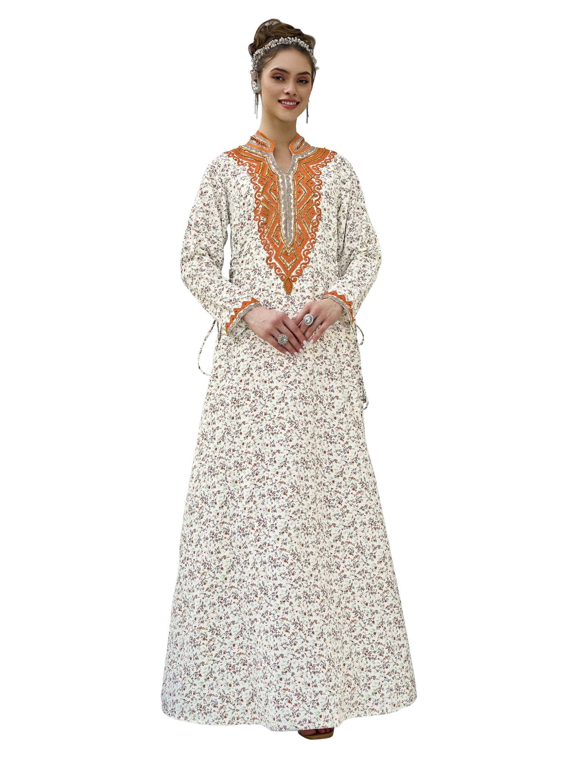 This loose-fitting jalabiya, made from breathable cotton, features a delicate floral print, perfect for casual summer occasions. Intricate embroidery and handwork around the collar add a touch of elegance, while the ajuste waist tie ensures a comfortable fit. Perfect for laid-back days, this design seamlessly combines style and comfort.