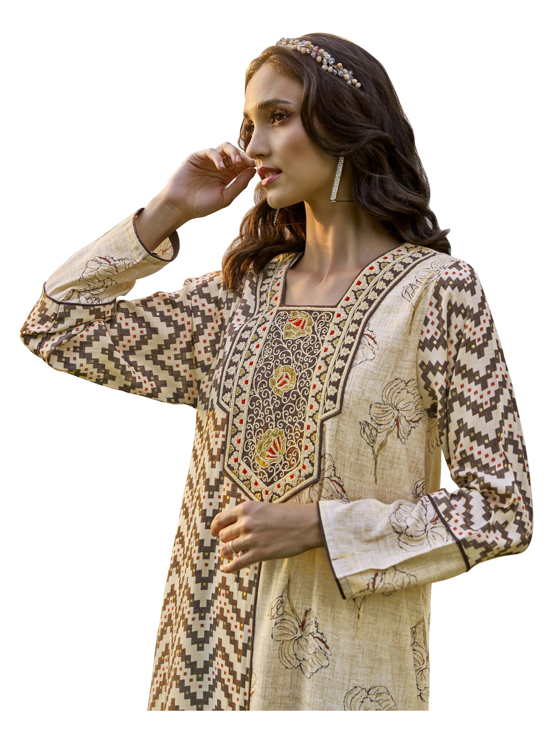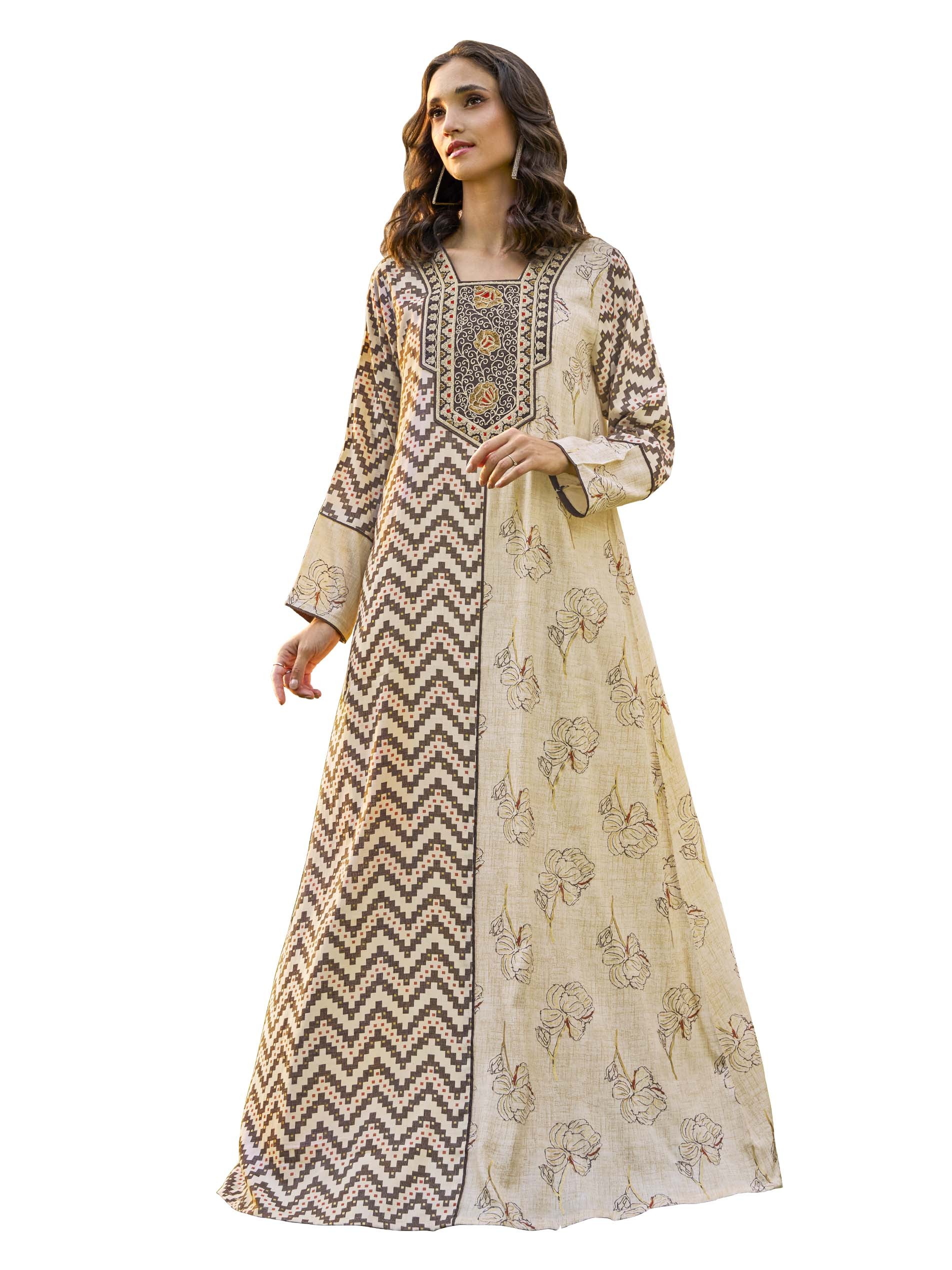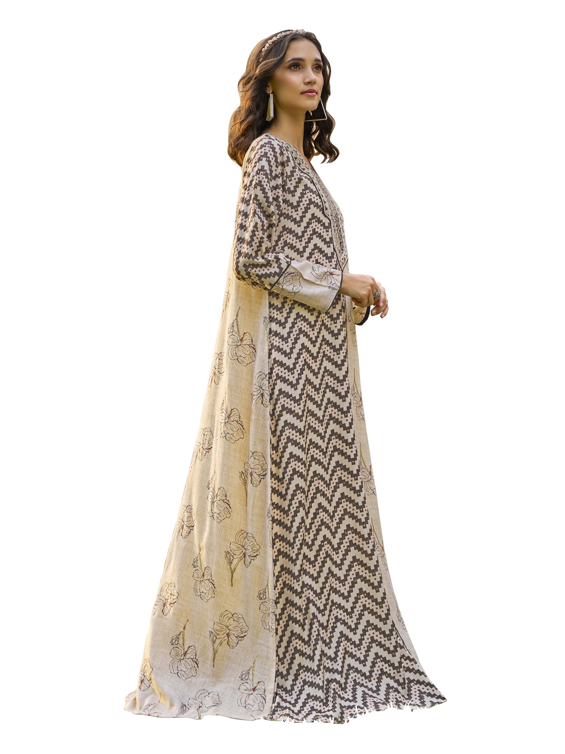 This A-line jalabiya, crafted from soft and breathable cotton, is perfect for casual summer outings. The mix-and-match design combines a chevron pattern on one side with a delicate floral print on the other, while the embroidery adds an elegant touch. A stylish blend of modern flair and traditional charm.