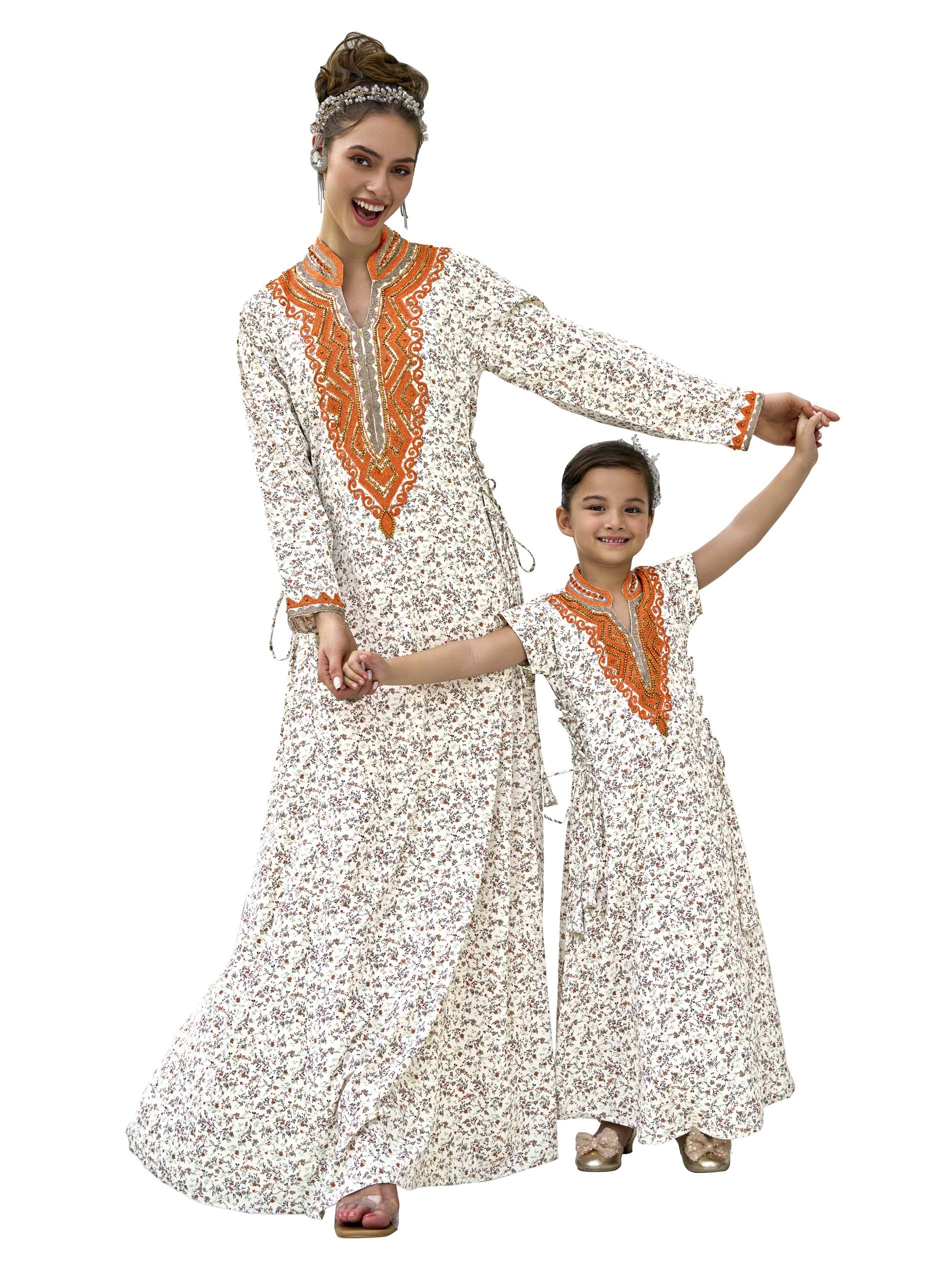 This kids flared jalabiya, made from soft gradient fabric, features a delicate floral print, making it perfect for casual summer wear. The vibrant embroidery and handwork around the collar add a touch of fun and elegance, while the ajuste waist tie ensures a comfortable fit. Perfect for casual occasions, this dress seamlessly combines comfort, style and fun.