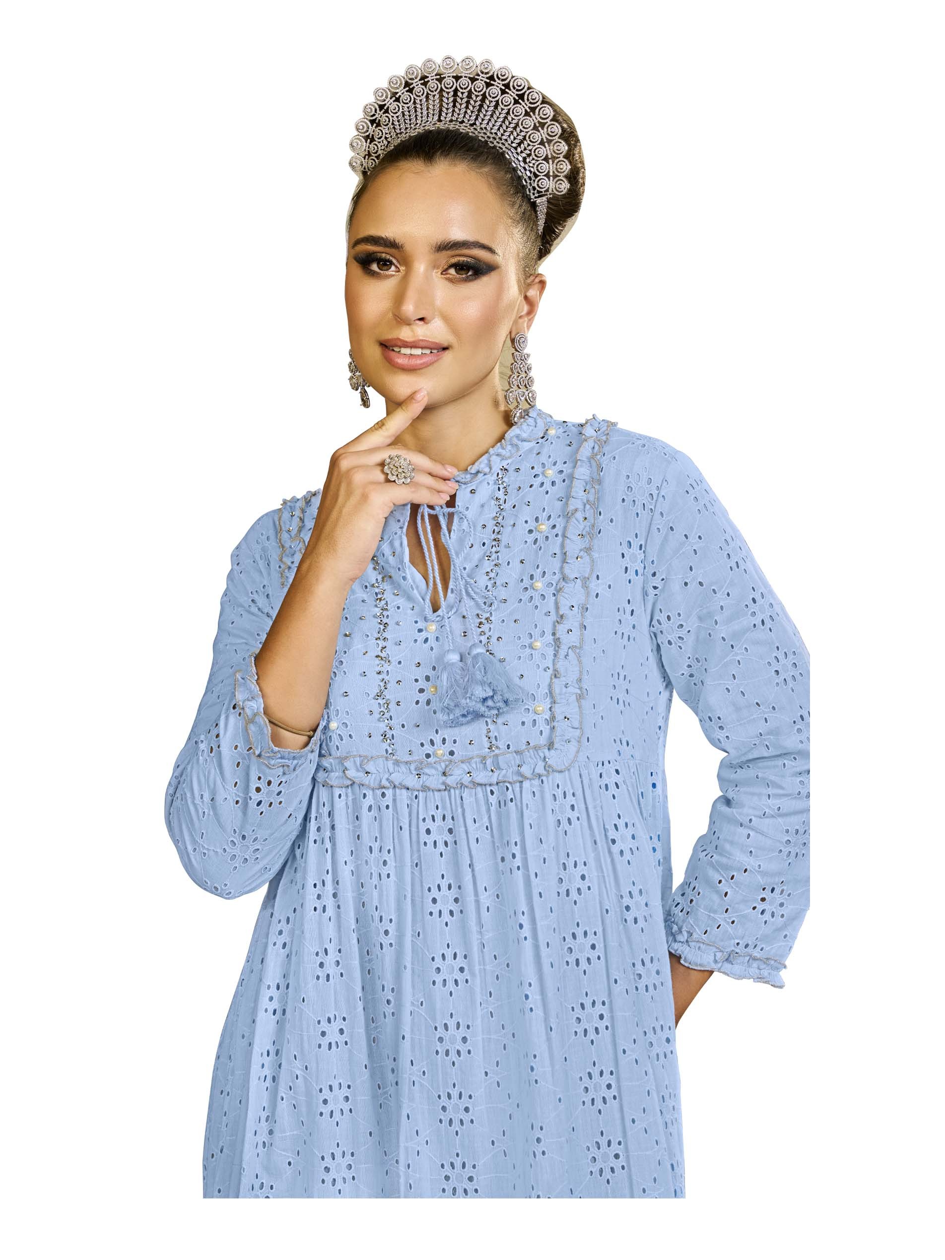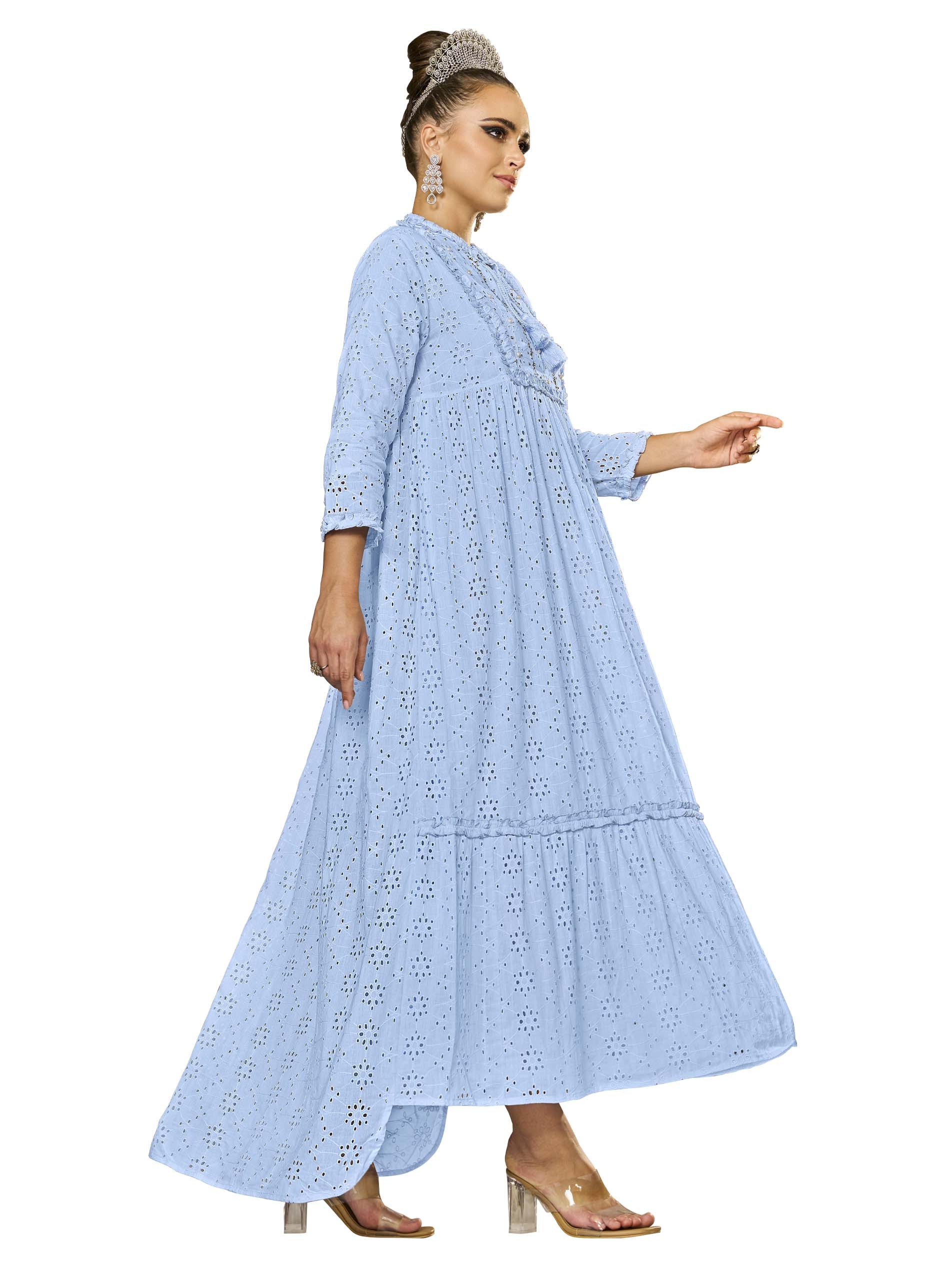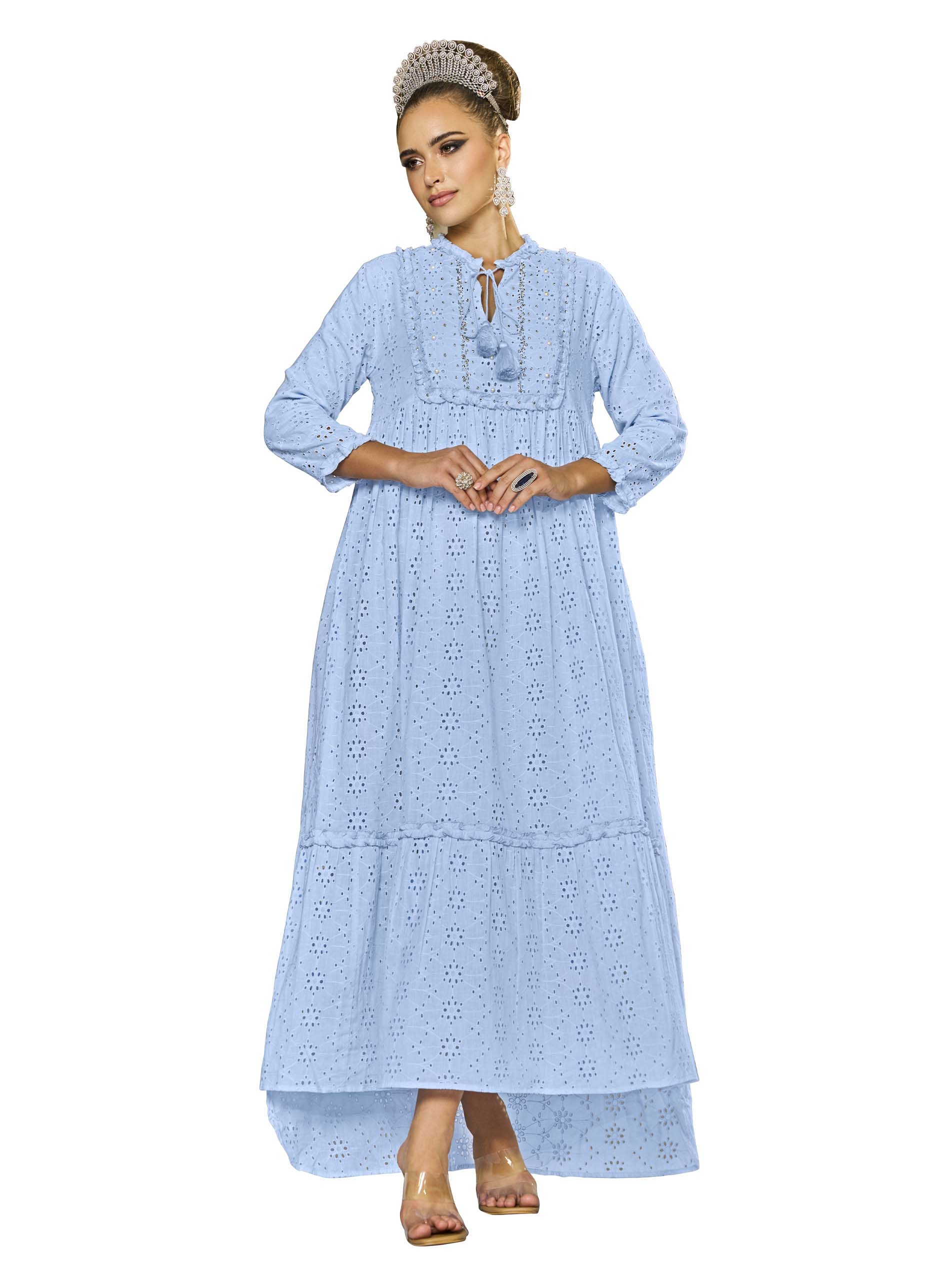 This soft blue cotton jalabiya features floral shapes throughout the fabric, with a charming tie detail and tassels at the neckline for an artistic flair. The half-and-half cut creates a flattering silhouette, while the tiered design adds depth. Perfect for the Ramadan season, it’s both stylish and comfortable for the summer heat.