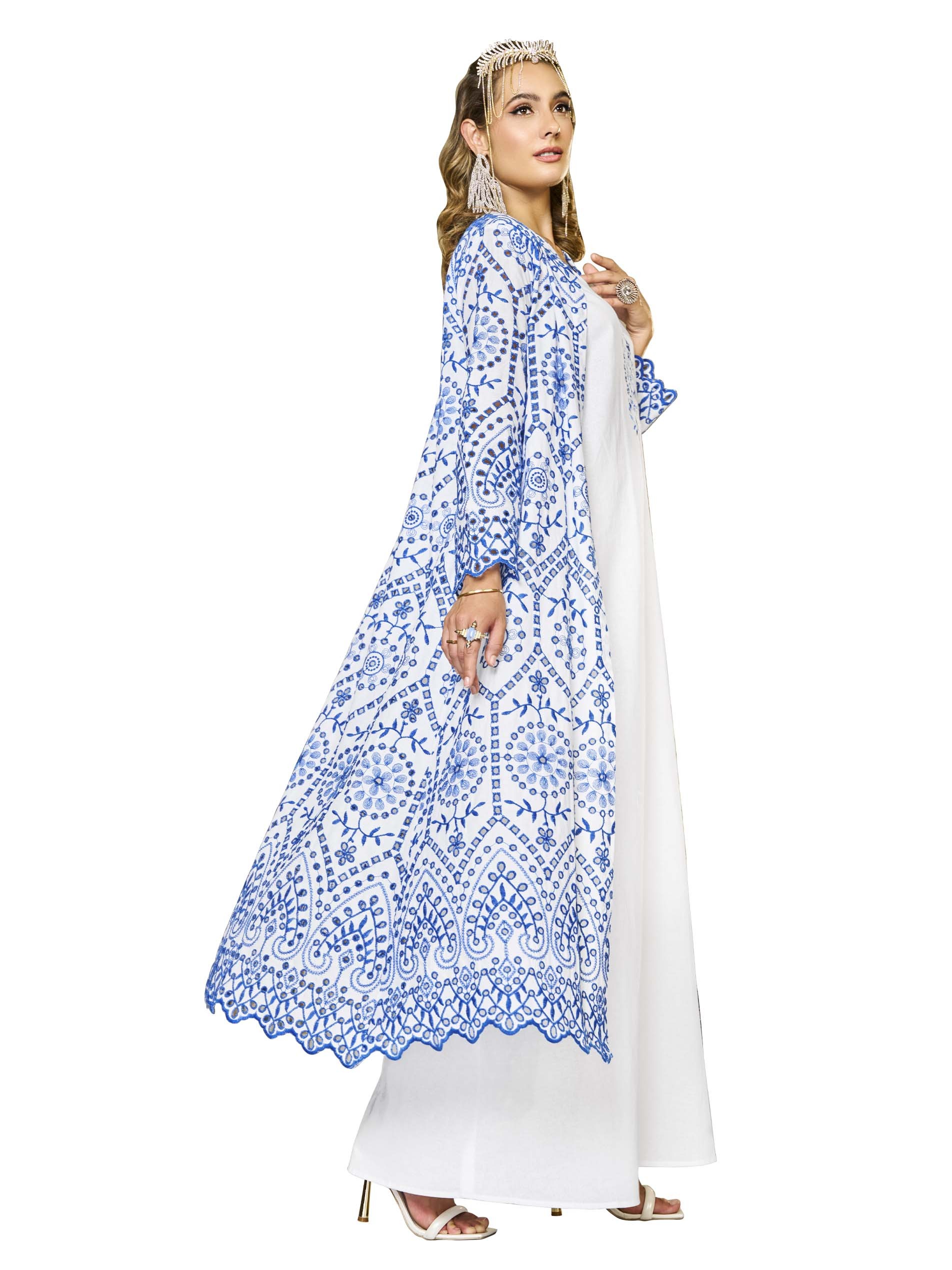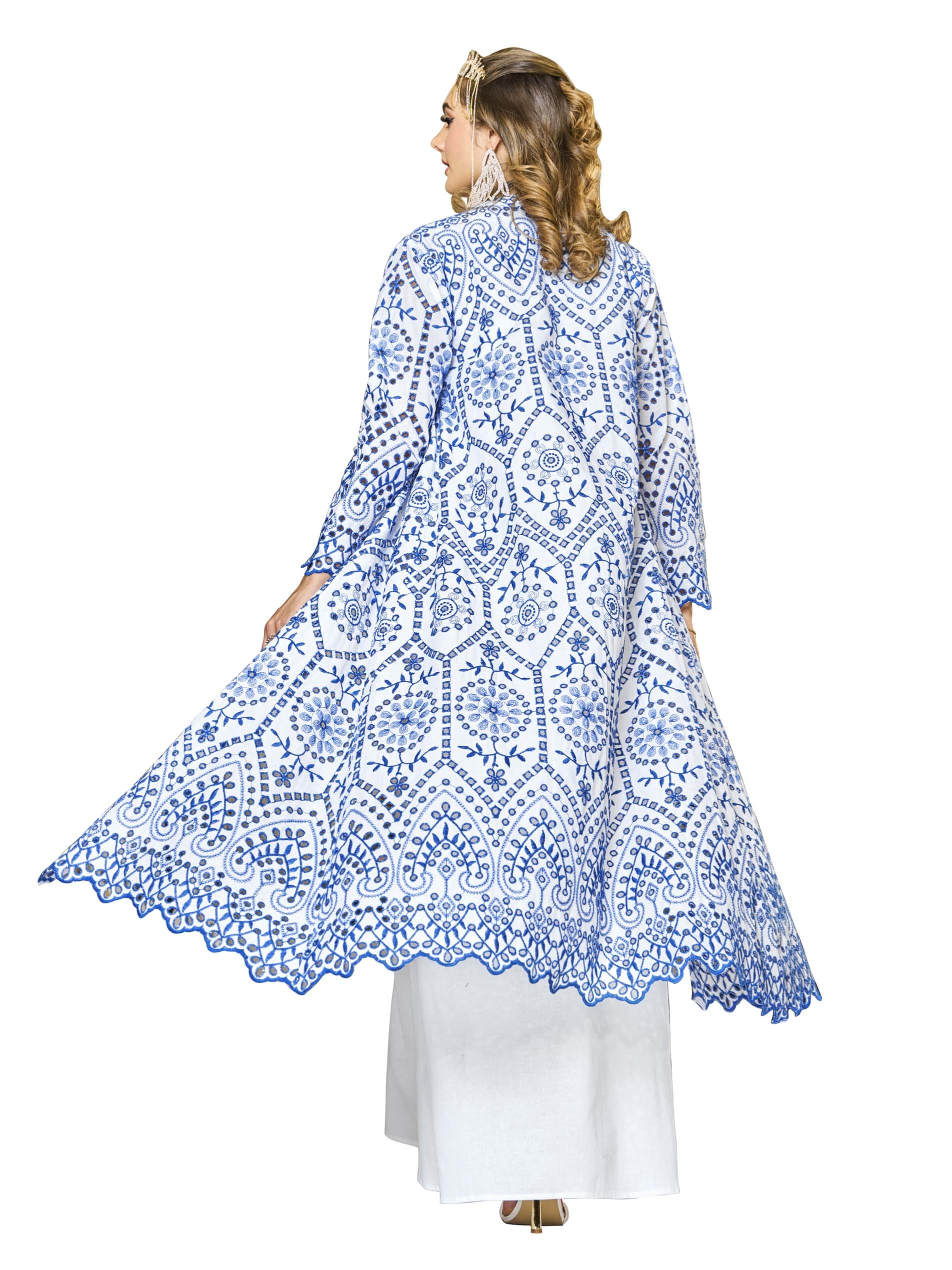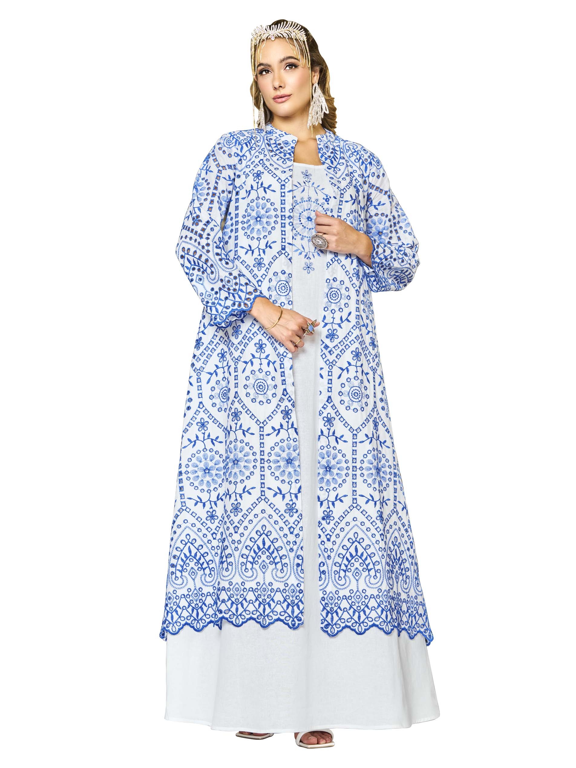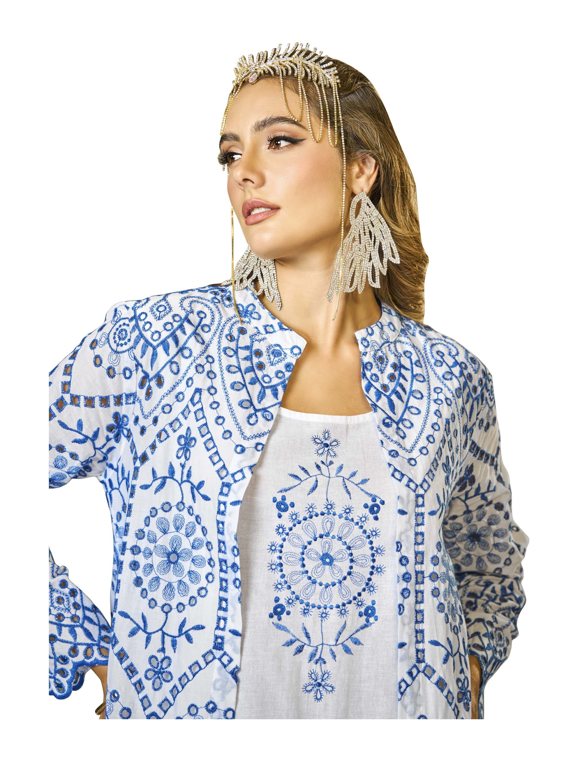 This two-piece jacket-style jalabiya features a white base with intricate blue chifley embroidery, showcasing geometric patterns and floral shapes. The open-front jacket, paired with a plain cotton base, offers a stylish and comfortable fit, perfect for summer occasions. Ideal for Ramadan, this design blends elegance and practicality effortlessly.