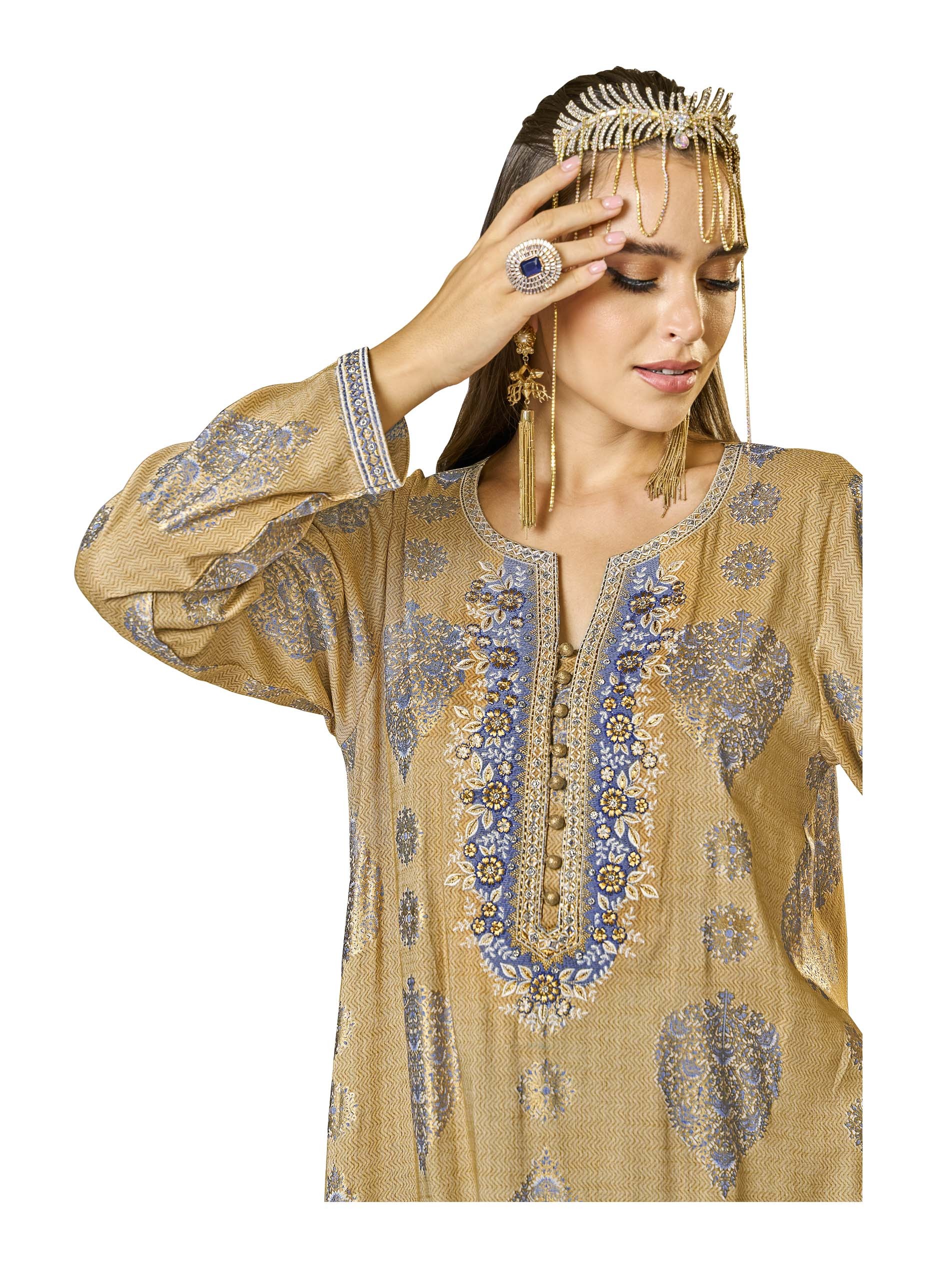 This A-line jalabiya features a mesmerizing foil print in warm, earthy tones, with delicate embroidery and buttons down the center, adding intricate detail and a subtle shimmer. Crafted from breathable cotton, it offers both elegance and comfort, making it ideal for warm summer days, especially during Ramadan. The unique design combines beauty and tradition for a standout look.